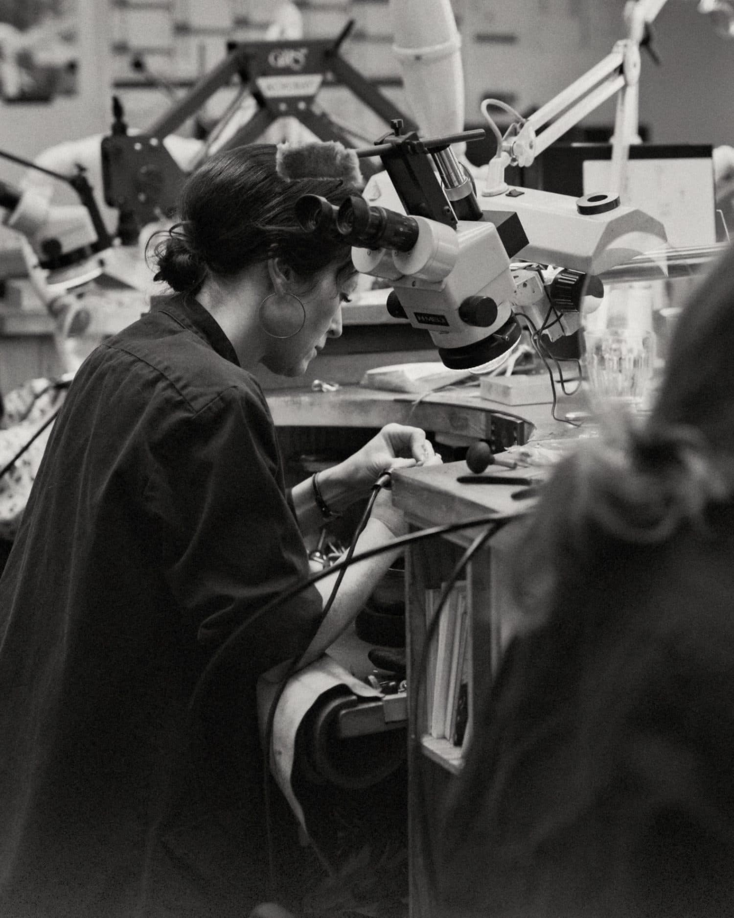 In the workshop’s foundry, the pieces are cast, often from several tiny pieces, and subsequently meticulously brought together and further refined. Creating fine jewellery is a precision art, where every detail matters. With steady hands, the goldsmiths create different types of surfaces: satinized, brushed, hammered, and polished. The satinized surface is a time-consuming technique that demands extensive expertise. Satinizing a precious metal entails carving fine grooves into the surface, thereby creating a distinctive satin texture. The satinized surface has become a brand signature, featured in multiple collections over the years.