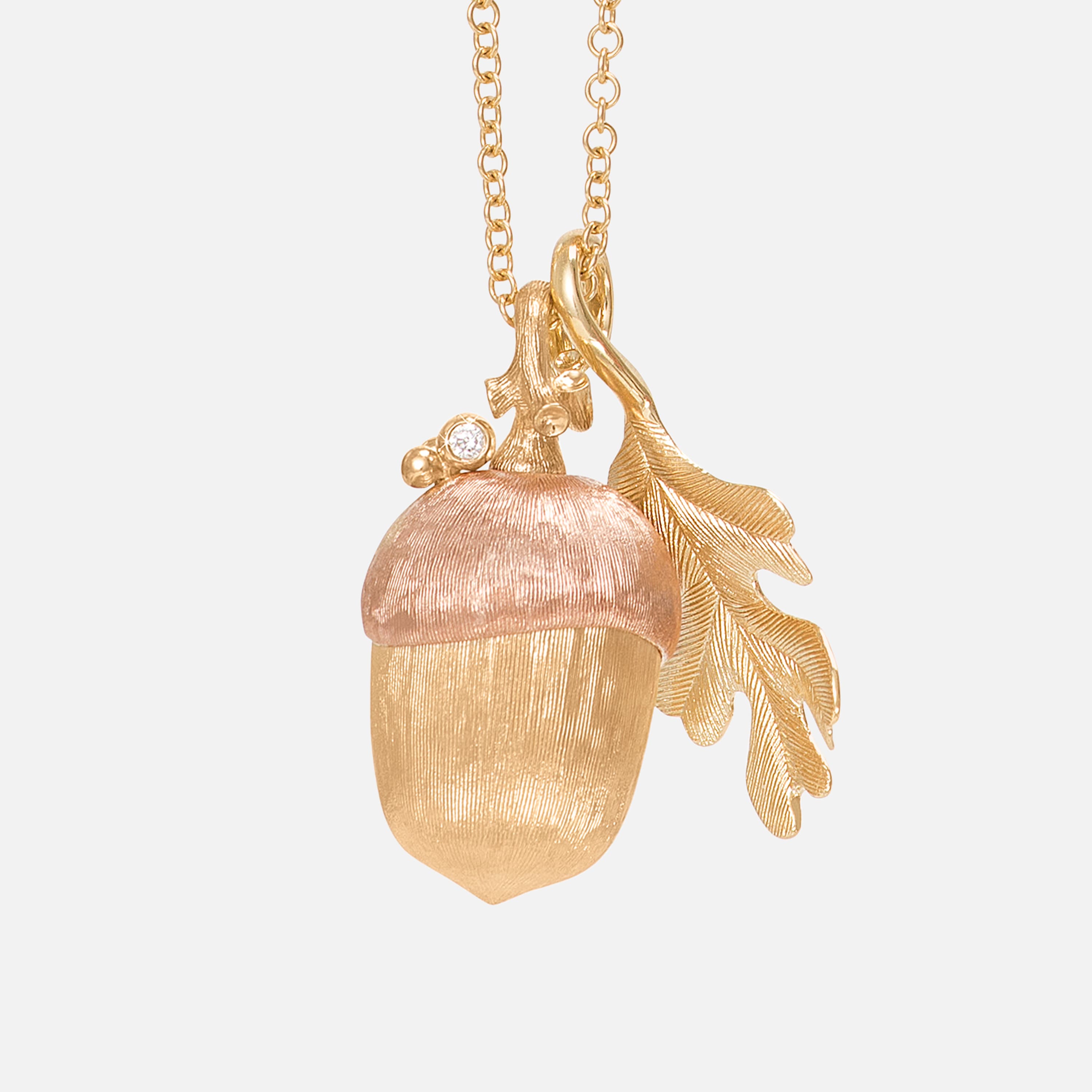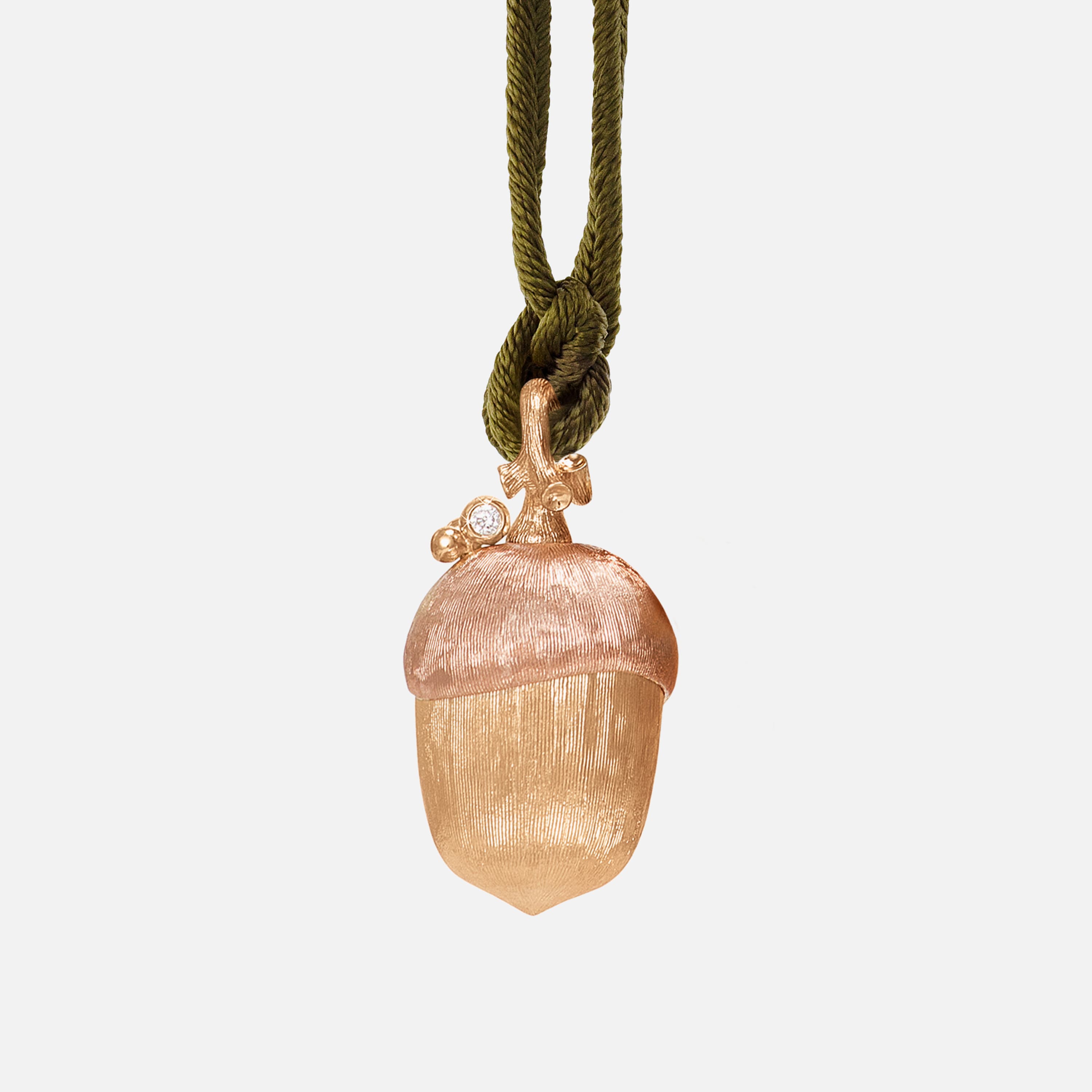 Designed by Charlotte Lynggaard, the Acorn pendant large is crafted from 18 karat yellow and rose gold with one diamond 0.01 carat TW. VS. The surfaces are hand-brushed by master goldsmiths for a matt finish. Part of the Forest Collection.