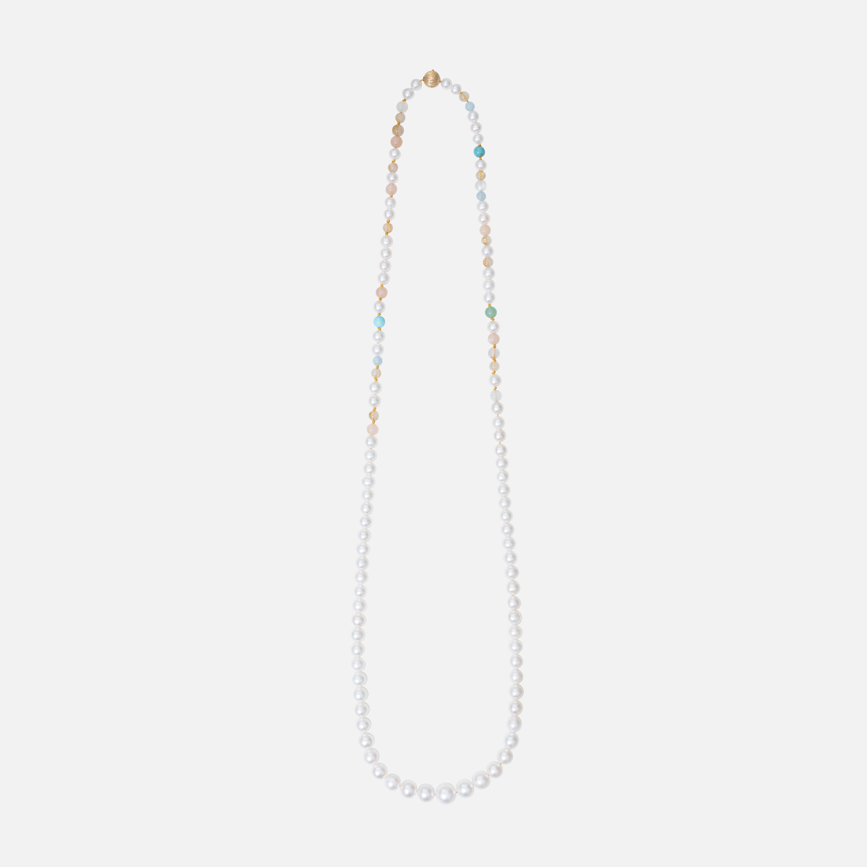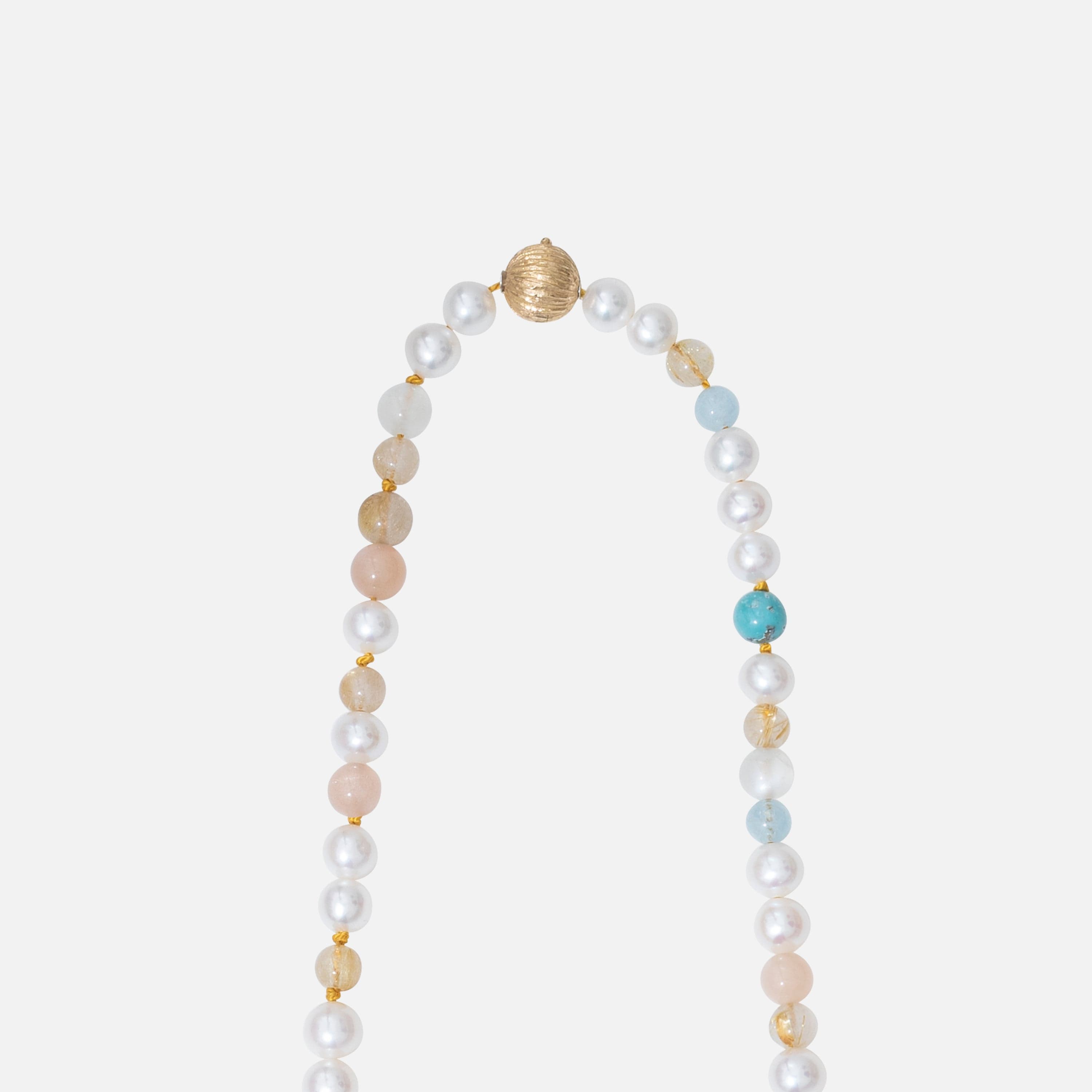 Designed by Charlotte Lynggaard, the bead collier is 75-78 cm long, without fastening, and is crafted from freshwater pearls, aquamarine, blush moonstone, rutile quartz, serpentine, turquoise, and white moonstone. Finish the collier with the clasp of your choice. Clasps are bought seperatly. Part of the Ole Lynggaard Copenhagen Collection. Total length: 30.71 inches.