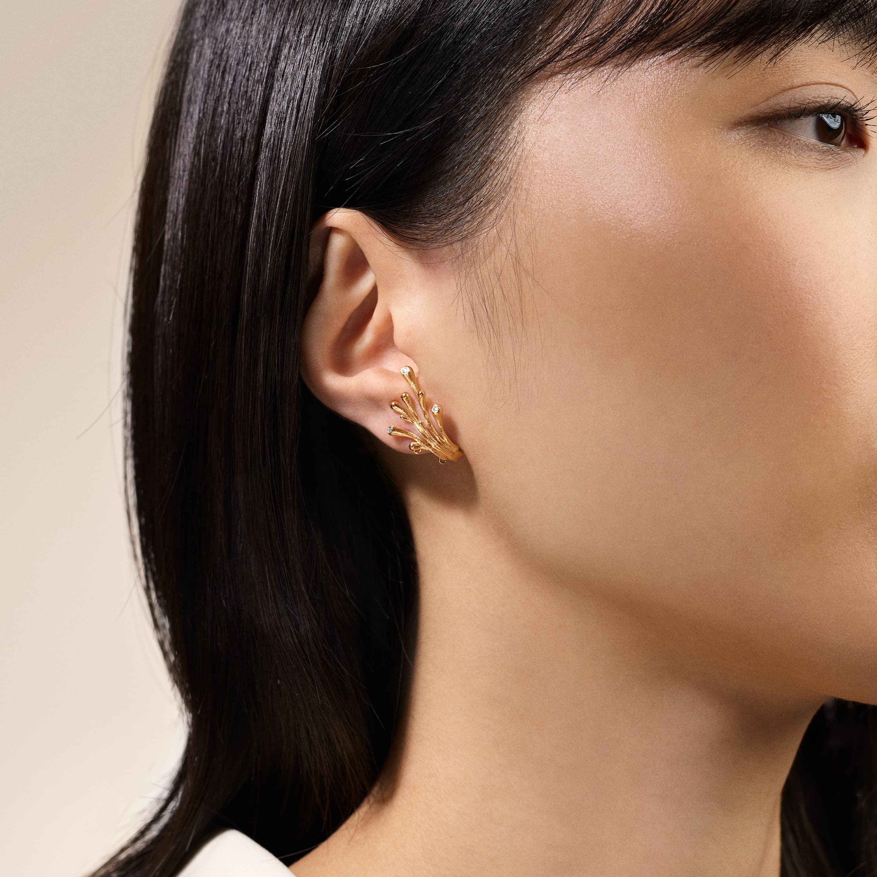 Designed by Charlotte Lynggaard, the BoHo Branch ear clips small are crafted from 18 karat yellow gold with 6 hand-set diamonds 0.06 carat TW. VS. Each earclip has two eyelets for hanging pendants. The hammered and polished gold surfaces are hand-finished by master goldsmiths. Sold as a pair. Part of the BoHo Collection.