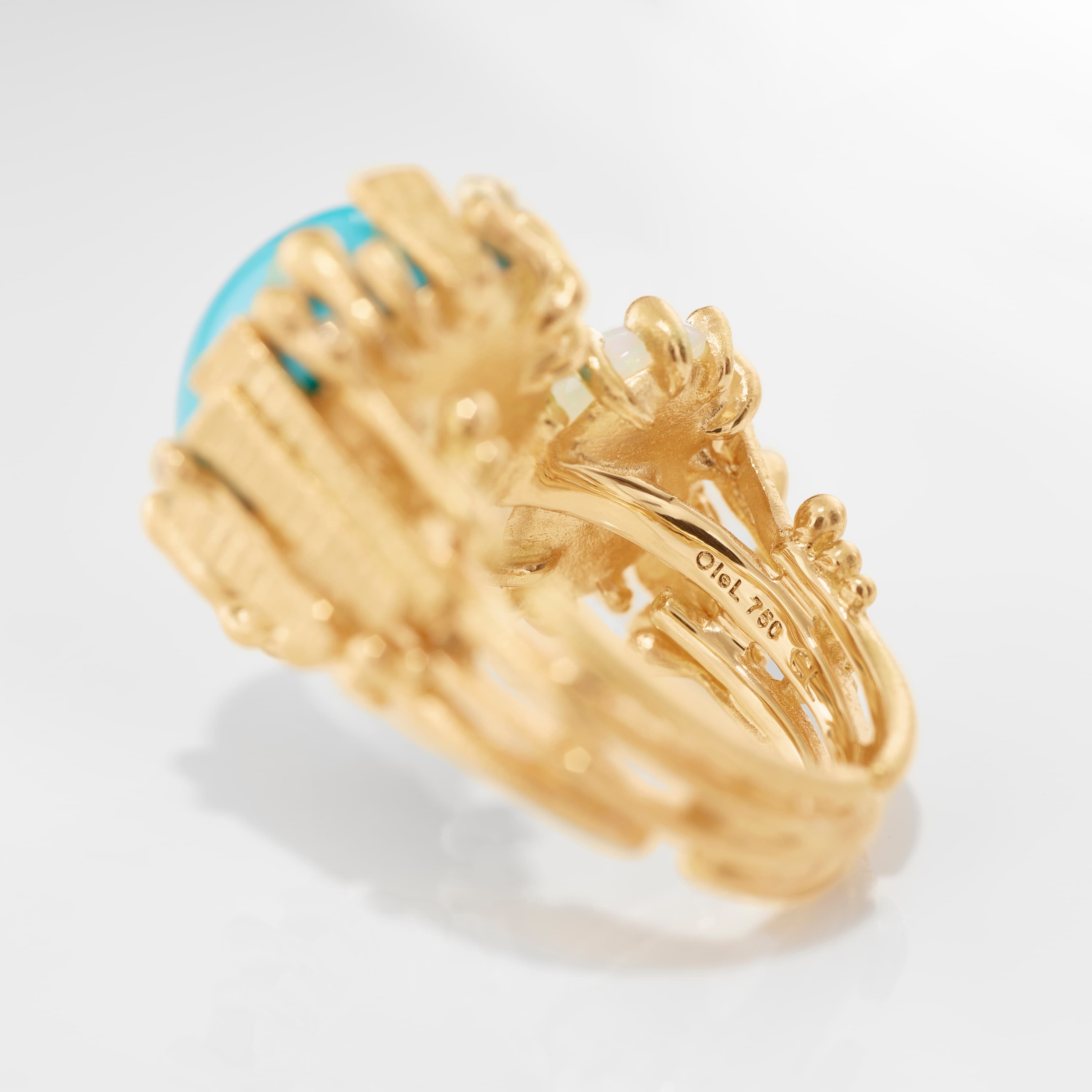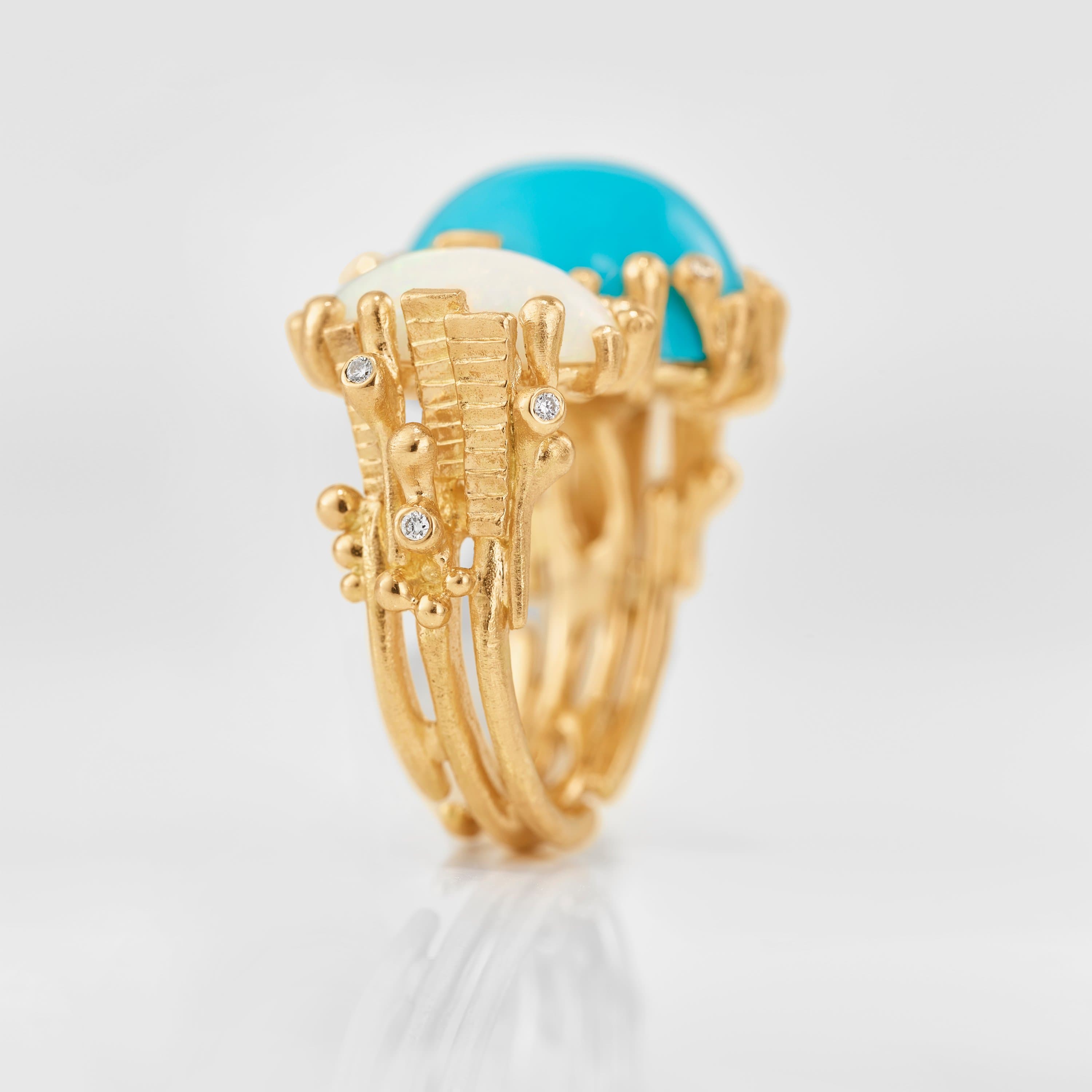 Designed by Charlotte Lynggaard, the BoHo ring double is crafted from 18 karat yellow gold with a 14,3 carat, 18x13 mm turquoise, a 2,5 carat, 13x9 mm light blue opal, and 7 hand-set diamonds 0.05 carat TW. VS. The hammered and polished gold surfaces are hand-finished by master goldsmiths. Part of the BoHo Collection. Please note: As gemstones are natural materials, each stone is absolutely unique. They will vary in colour and have individual, unique inclusions and features. Web-images of stones are only representatives of the unique stone you will receive when ordering the product, not the exact stone.