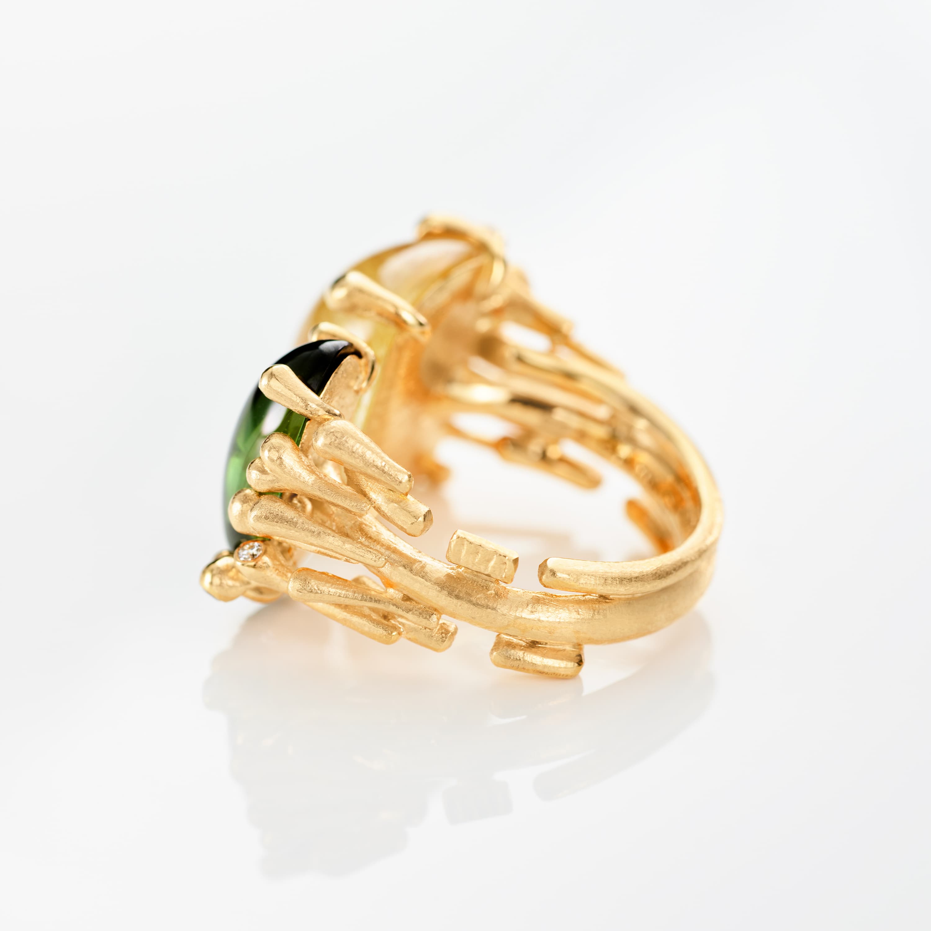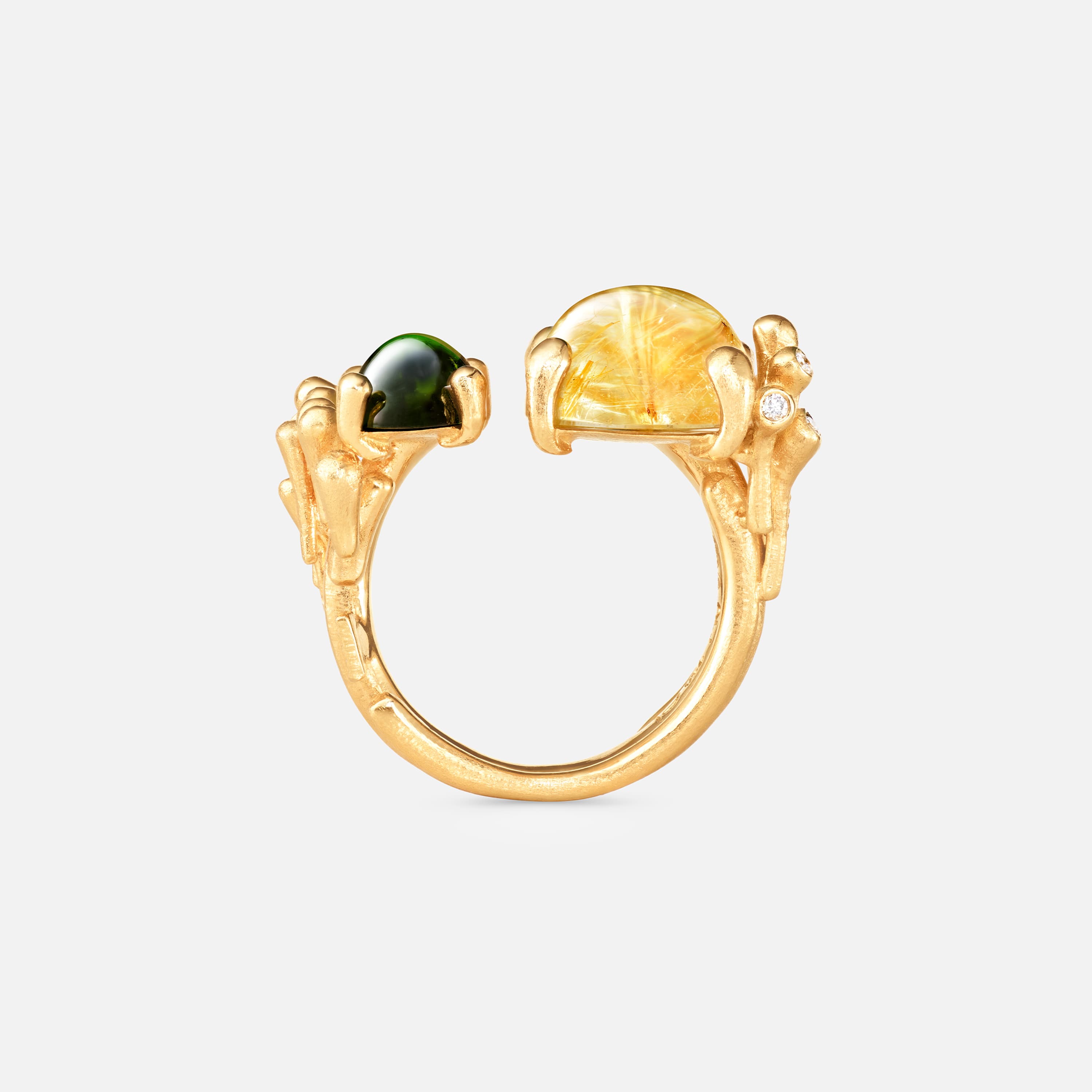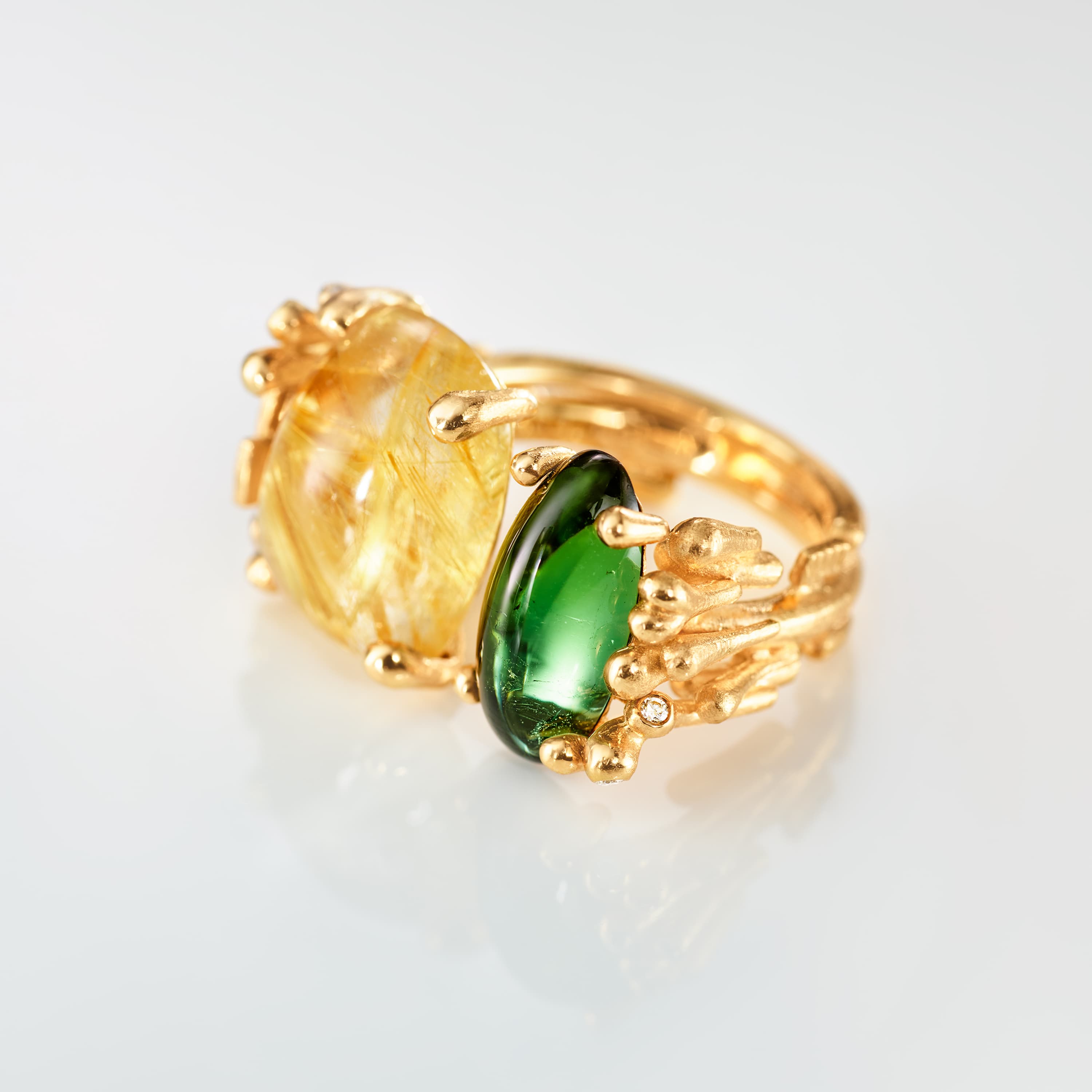 Designed by Charlotte Lynggaard, the BoHo ring double is crafted from 18 karat yellow gold with an 8,3 carat, 11x15 mm rutile quartz, a 4 carat, 6,7x14 mm green tourmaline, and 5 hand-set diamonds 0.04 carat TW. VS. The hammered and polished gold surfaces are hand-finished by master goldsmiths. Part of the BoHo Collection.