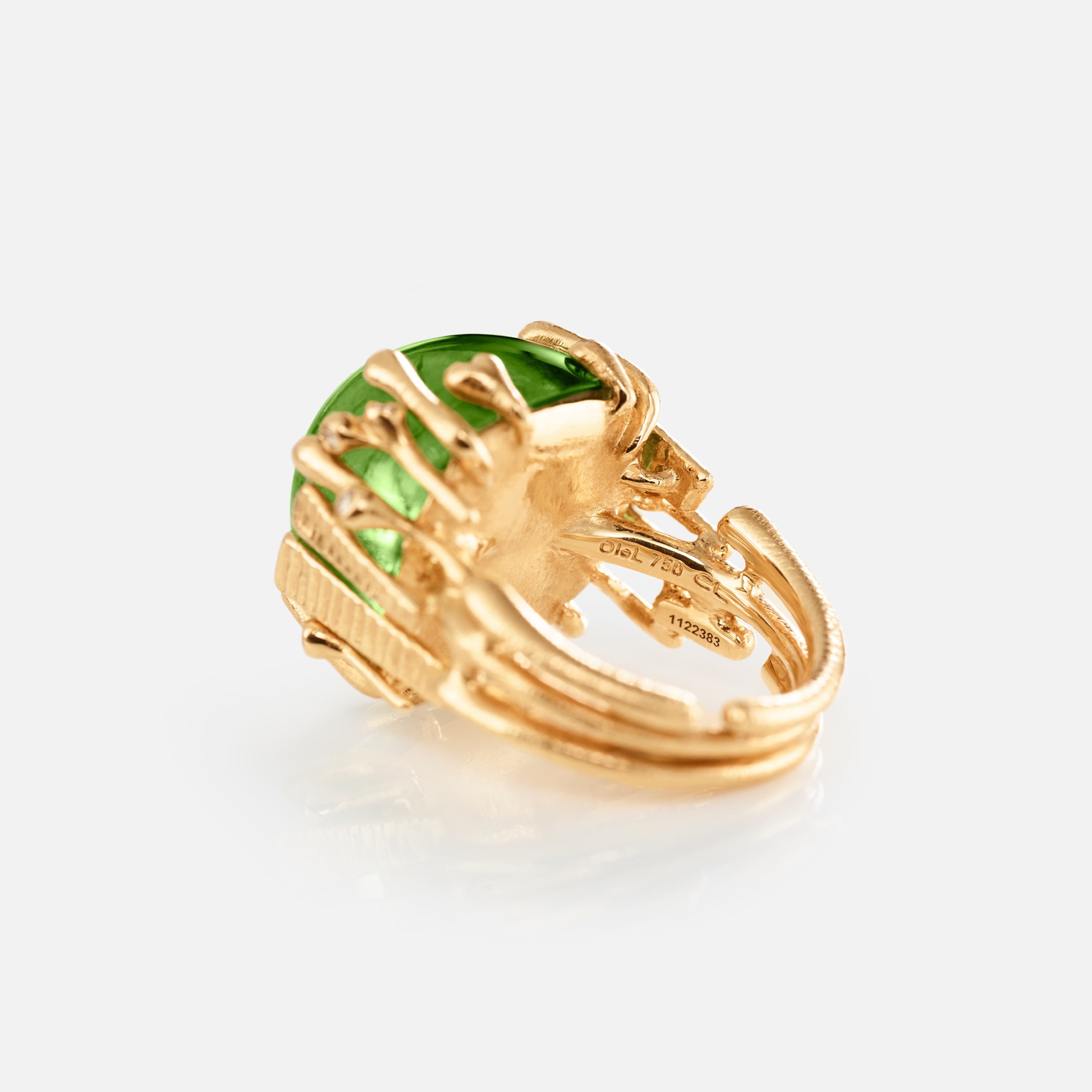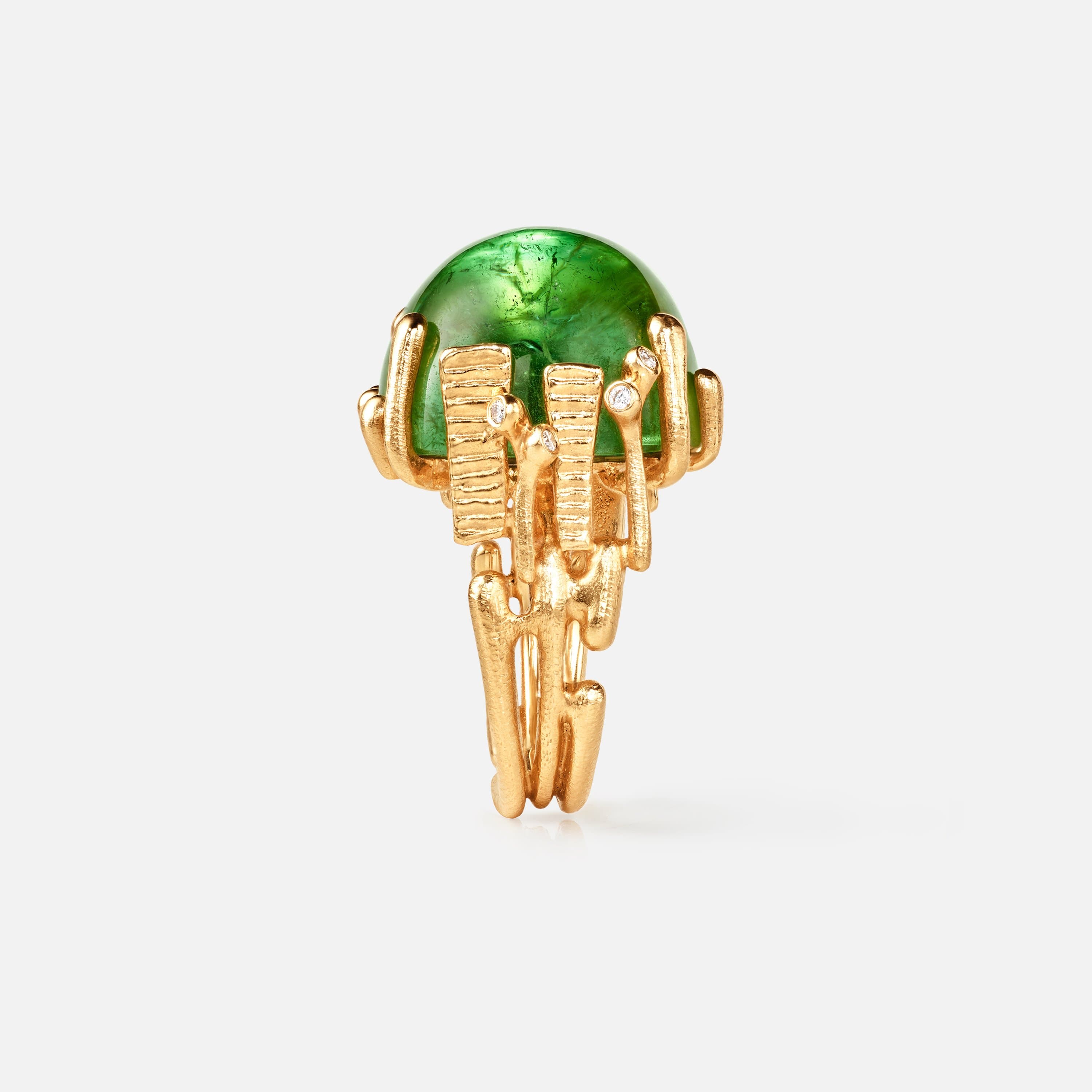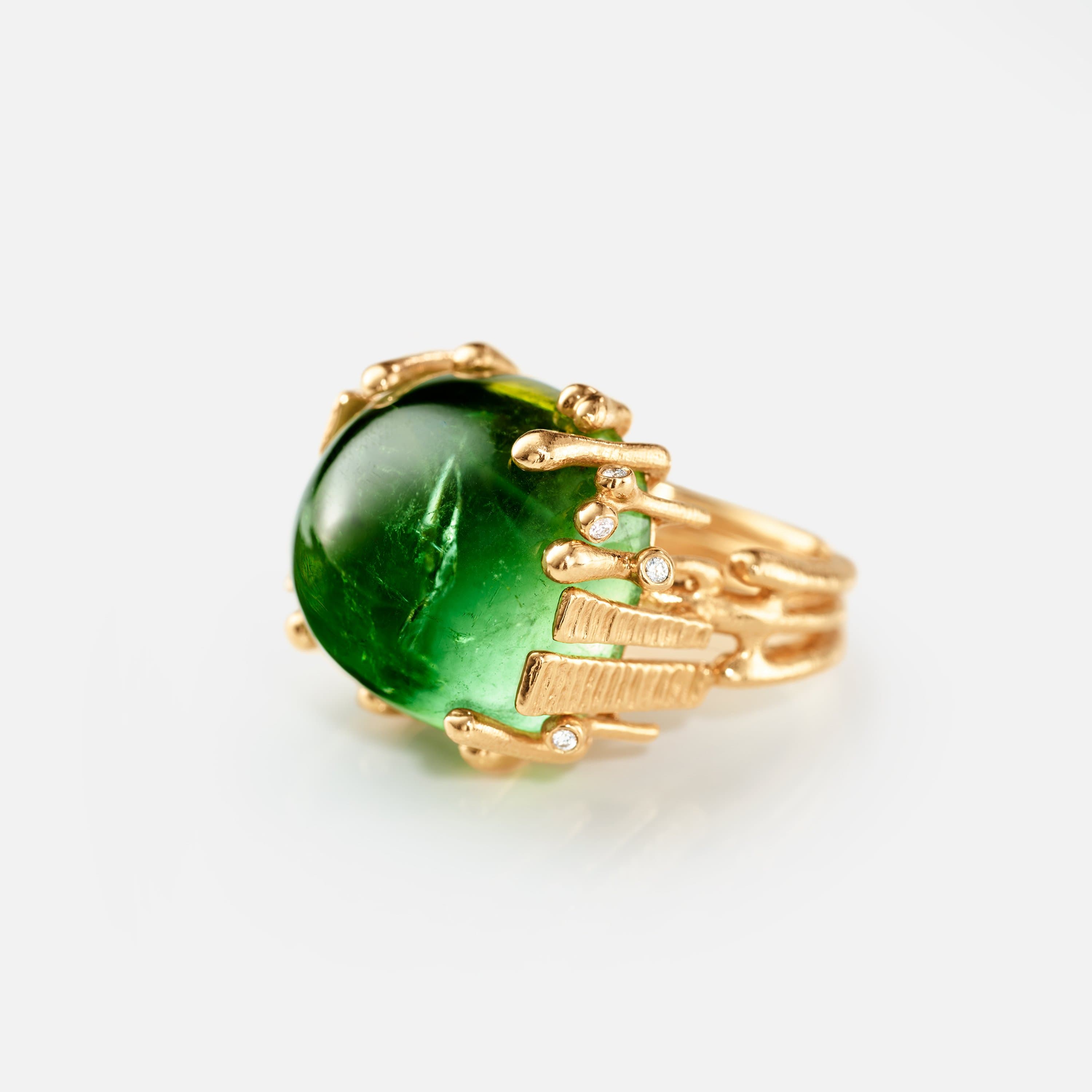 Designed by Charlotte Lynggaard, the BoHo ring large is crafted from 18 karat yellow gold with a 38 carat, 18x18 mm light green tourmaline and 8 diamonds 0.06 carat TW. VS. The AGL certificate number of the tourmaline is laser-engraved into the stone. The hammered and polished gold surfaces are hand-finished by master goldsmiths. Part of the BoHo Collection.