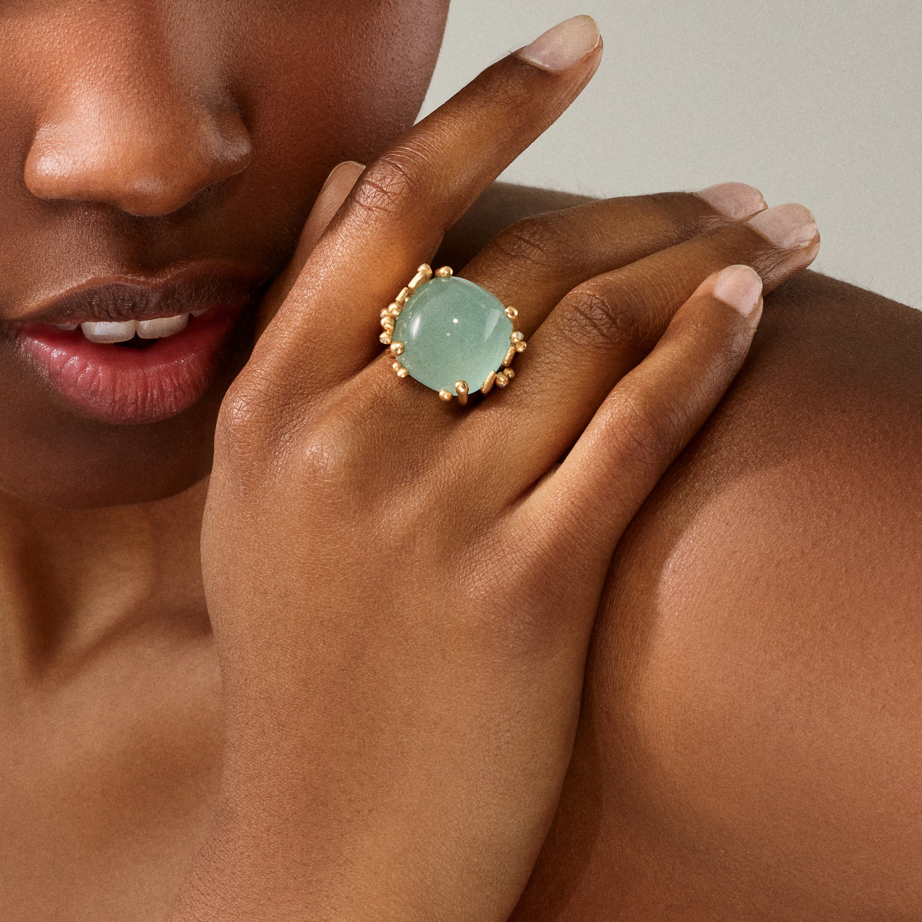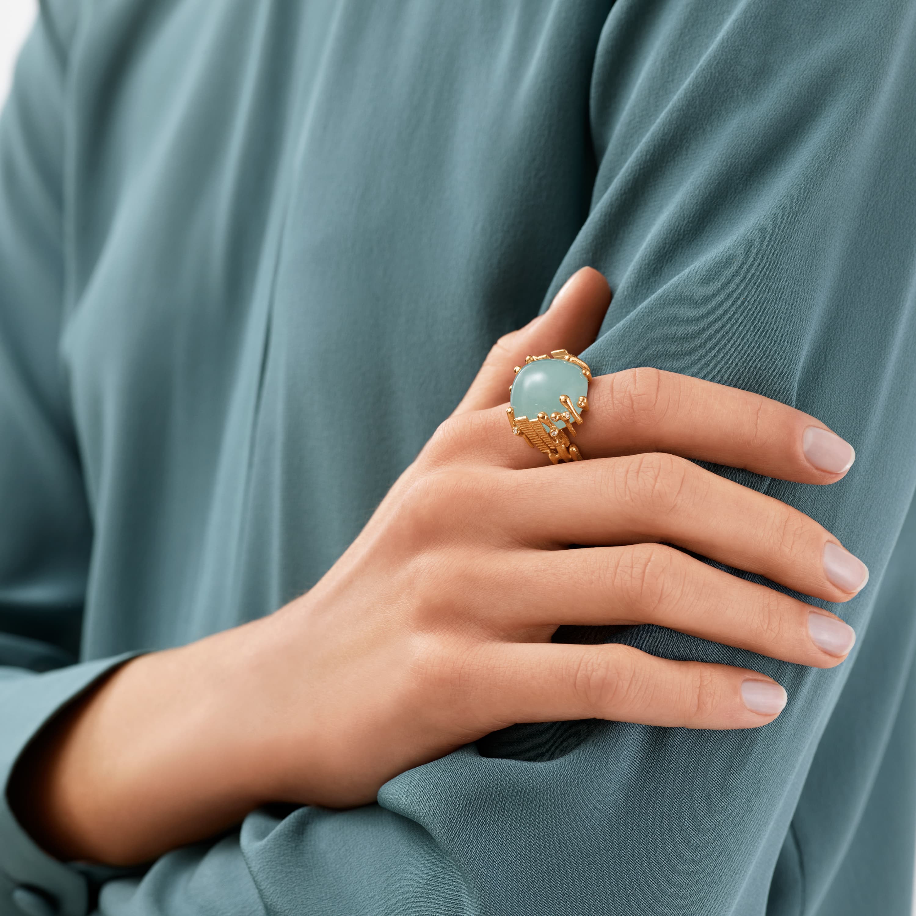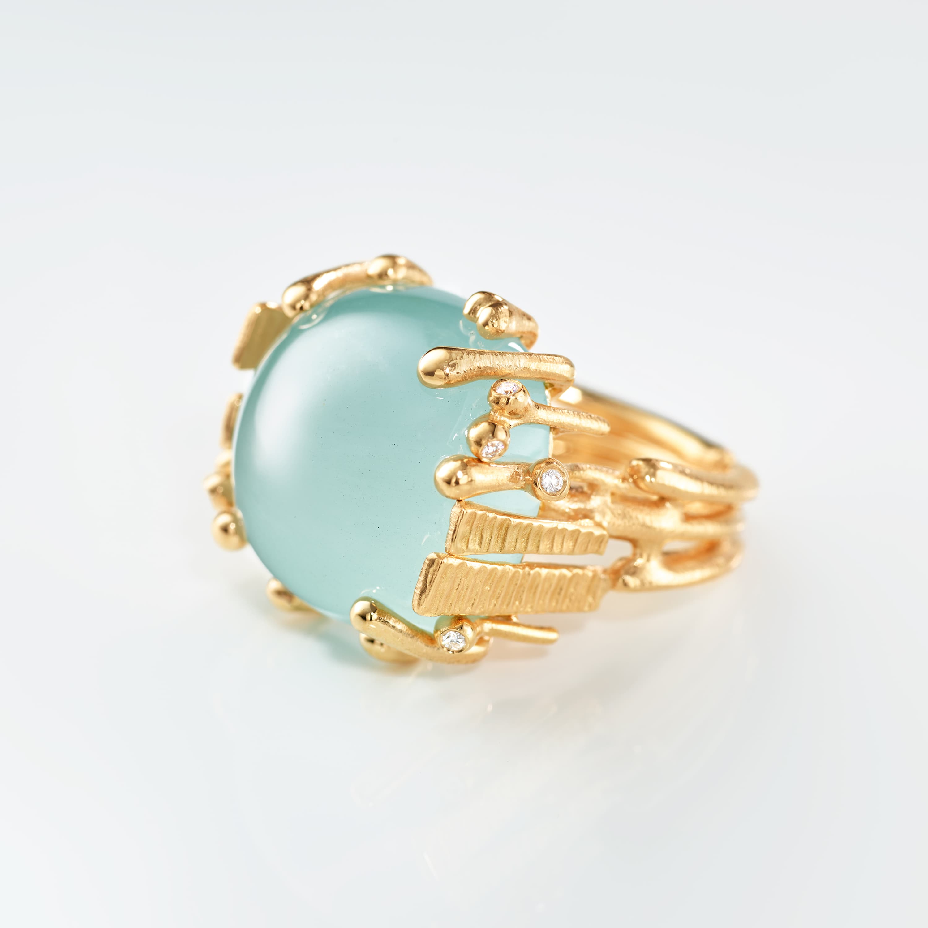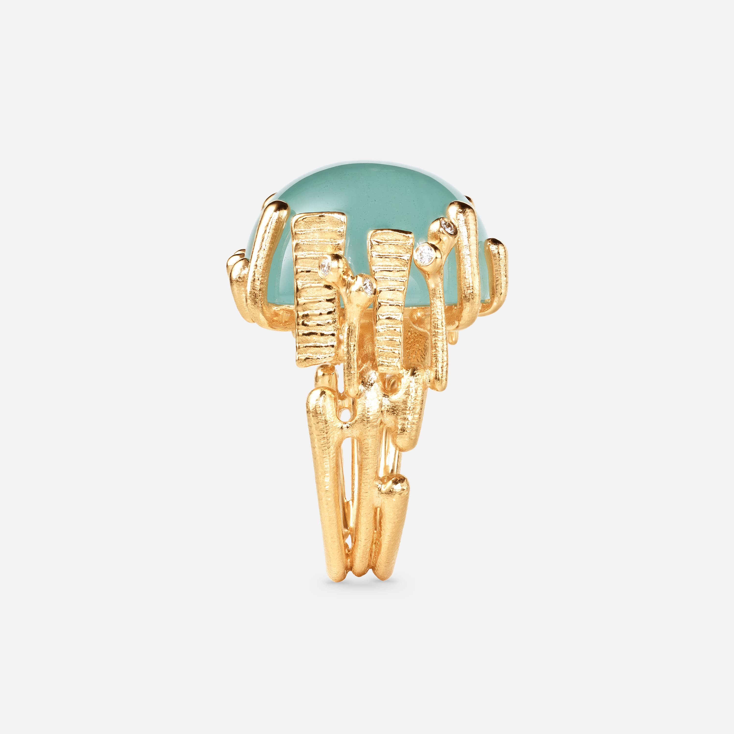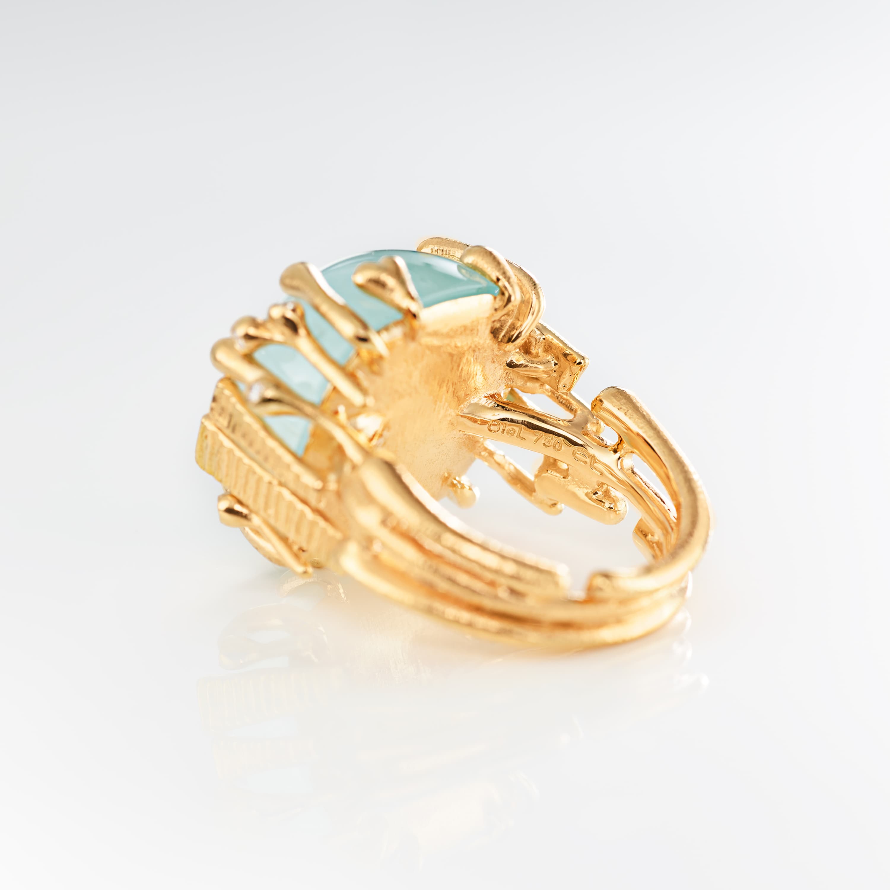 Designed by Charlotte Lynggaard, the BoHo ring large is crafted from 18 karat yellow gold with a 31 carat, 18x18 mm blue-green aquamarine and 8 hand-set diamonds 0,06 carat TW. VS. The aquamarine is hand-selected, and the hammered and polished gold surfaces are hand-finished by master goldsmiths. Part of the BoHo Collection.