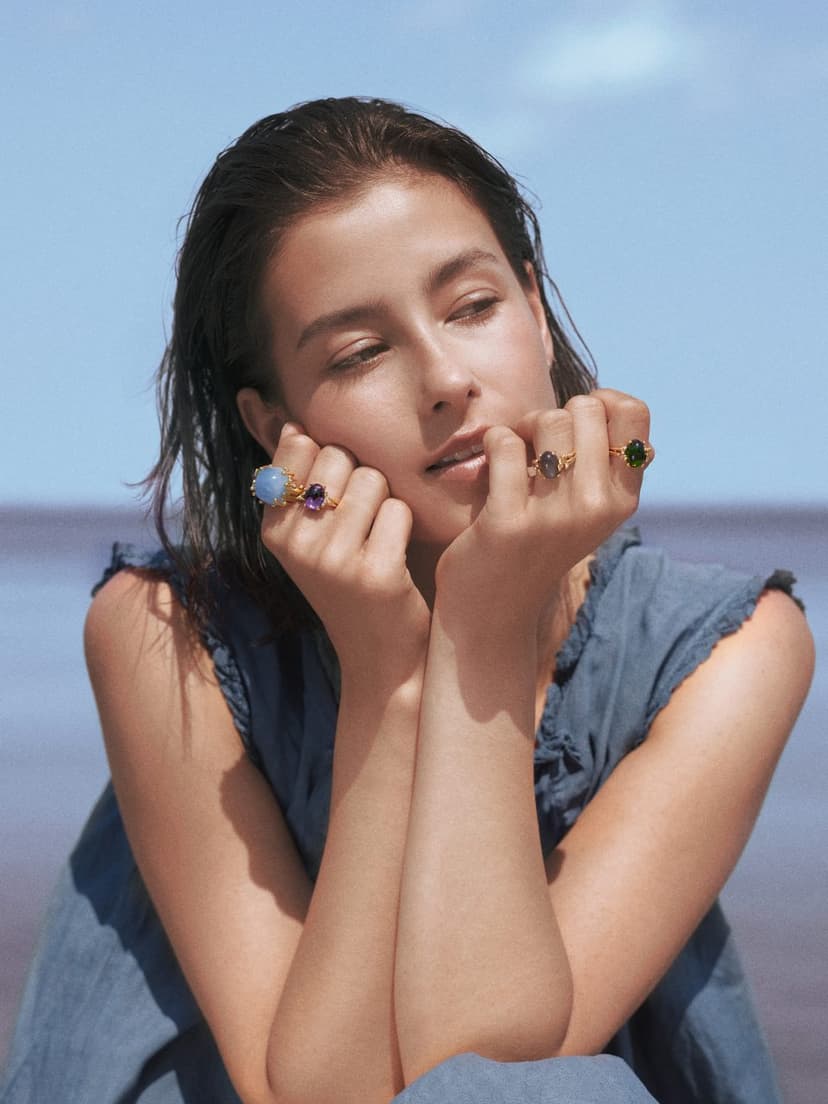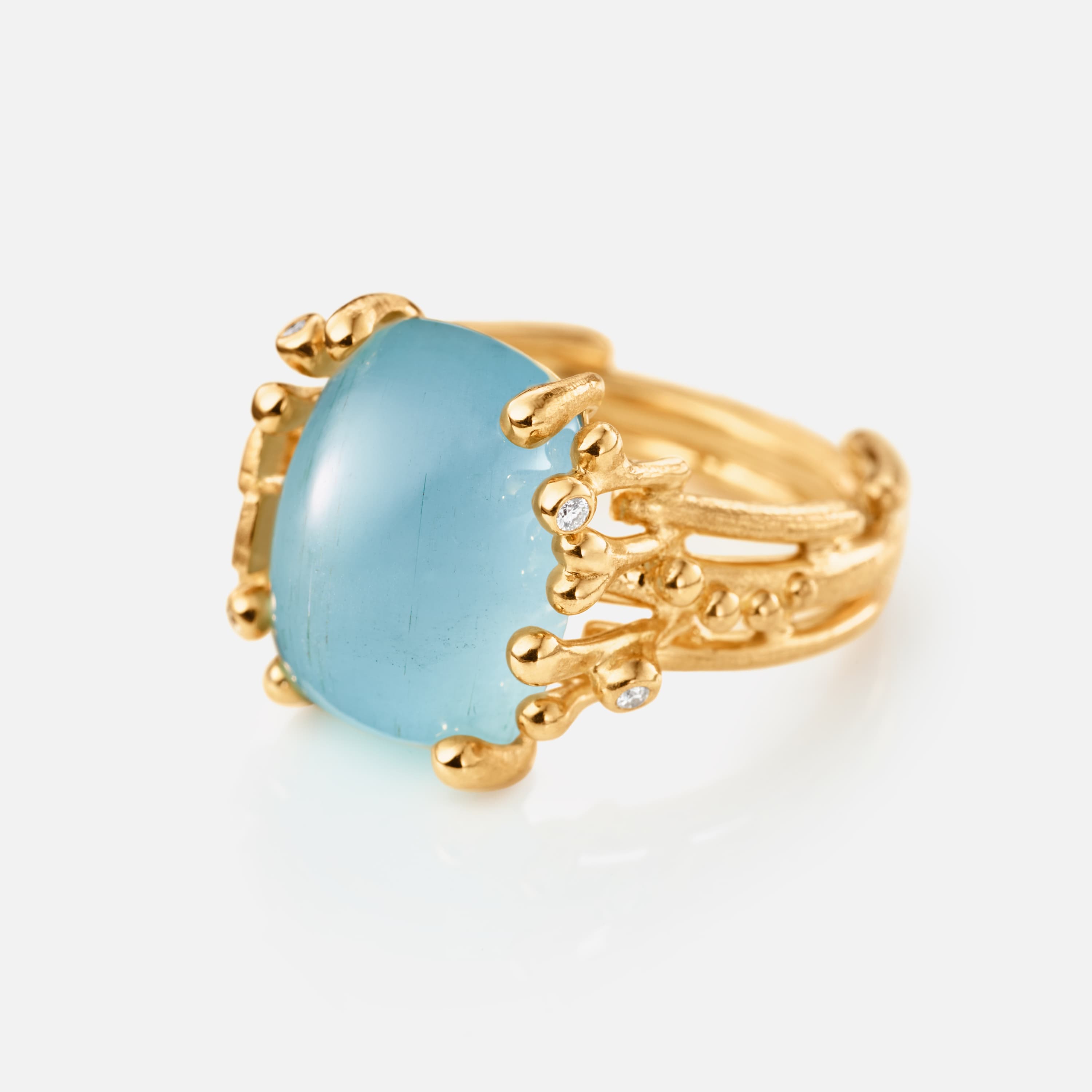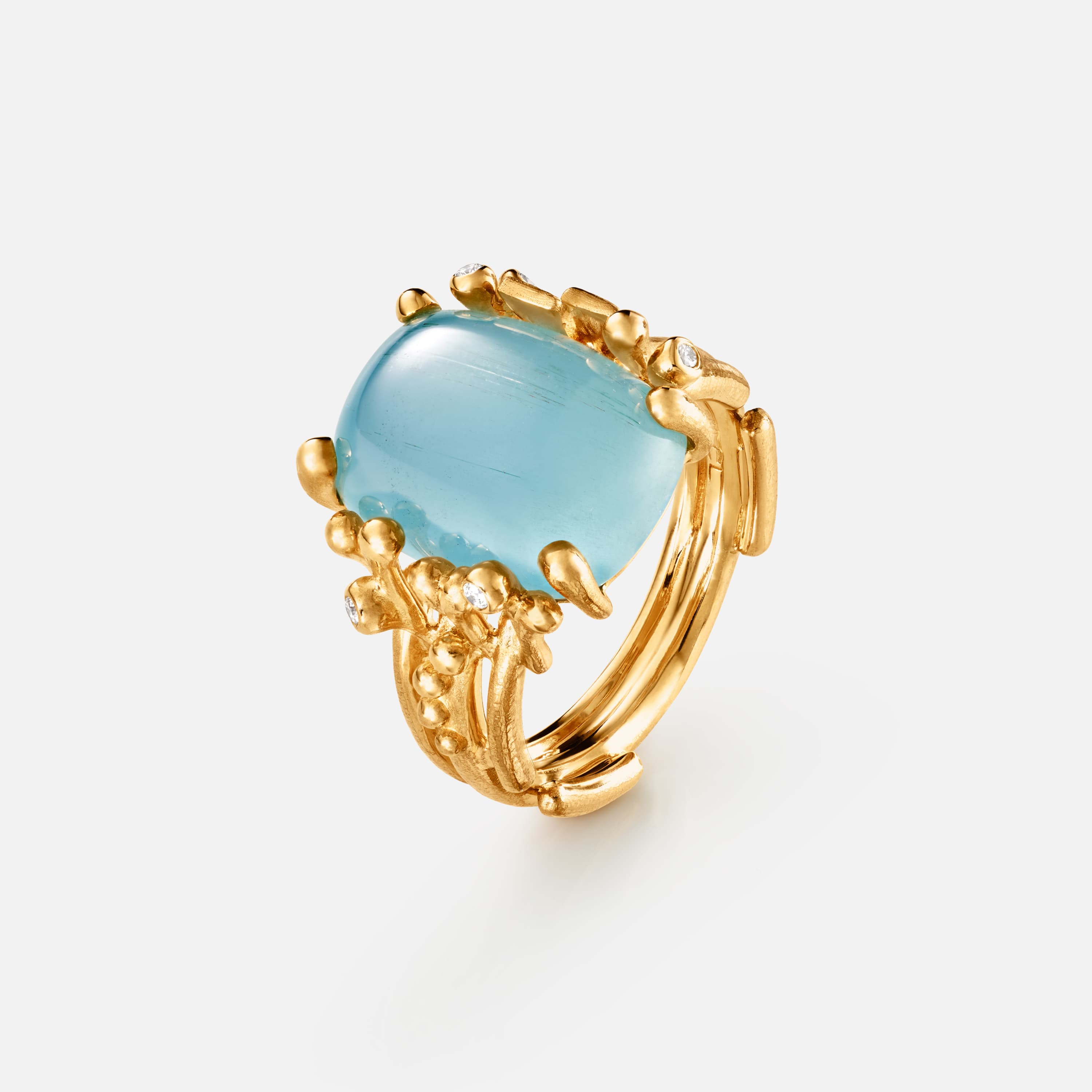 Designed by Charlotte Lynggaard, the BoHo ring medium is crafted from 18 karat yellow gold with an 8,3 carat, 15x11 mm blue aquamarine and 5 hand-set diamonds 0,04 carat TW. VS. The hammered and polished gold surfaces are hand-finished by master goldsmiths. Part of the BoHo Collection. Please note: As gemstones are natural materials, each stone is absolutely unique. They will vary in colour and have individual, unique inclusions and features. Web-images of stones are only representatives of the unique stone you will receive when ordering the product, not the exact stone.