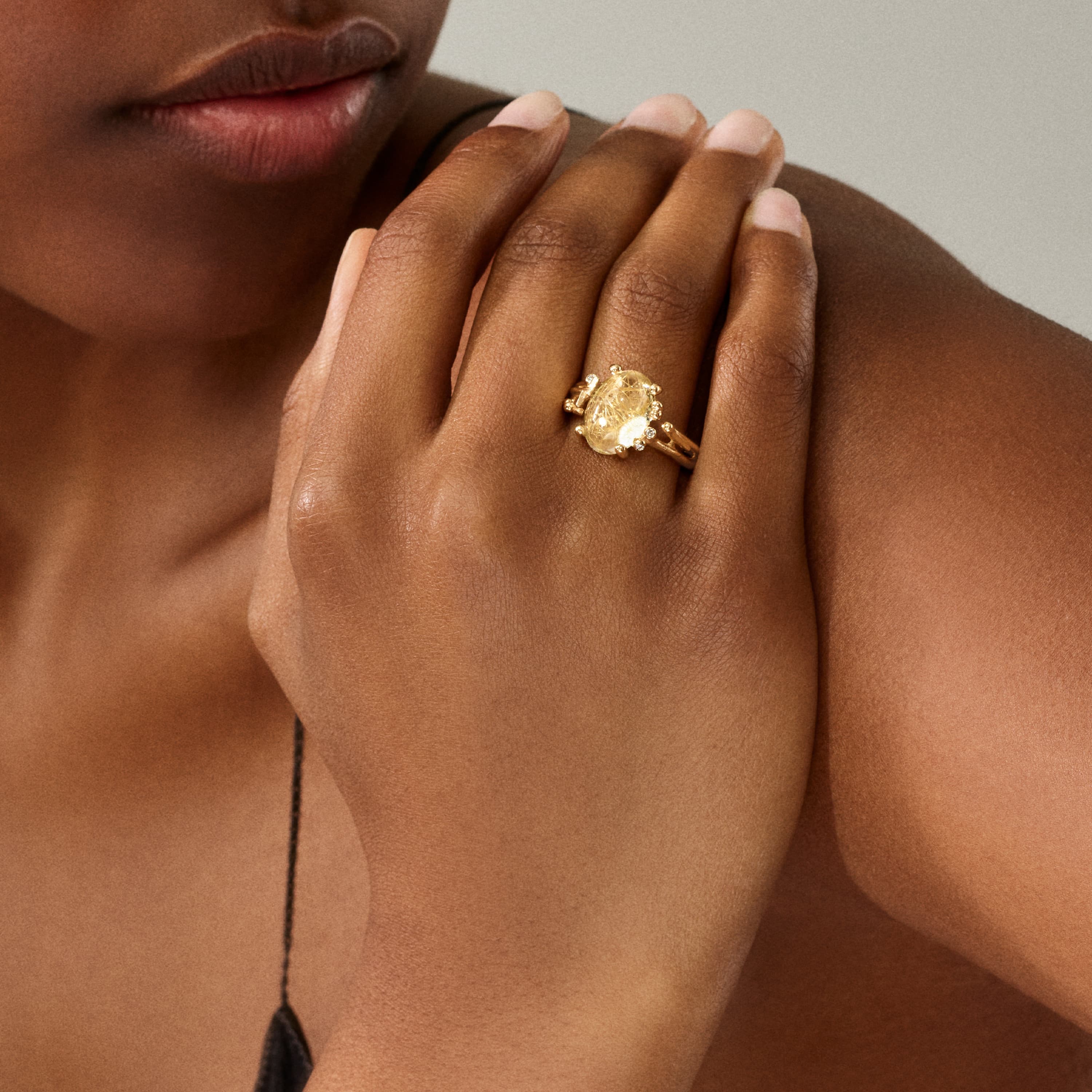 Designed by Charlotte Lynggaard, the BoHo ring small is crafted from 18 karat yellow gold with a 9x13 mm Rutile quartz, and 3 hand-set diamonds totalling 0.02 carat TW. VS. The hammered and polished gold surfaces are hand-finished by master goldsmiths. Part of the BoHo Collection. Please note: As gemstones are natural materials, each stone is absolutely unique. They will vary in colour and have individual, unique inclusions and features. Web-images of stones are only representatives of the unique stone you will receive when ordering the product, not the exact stone.