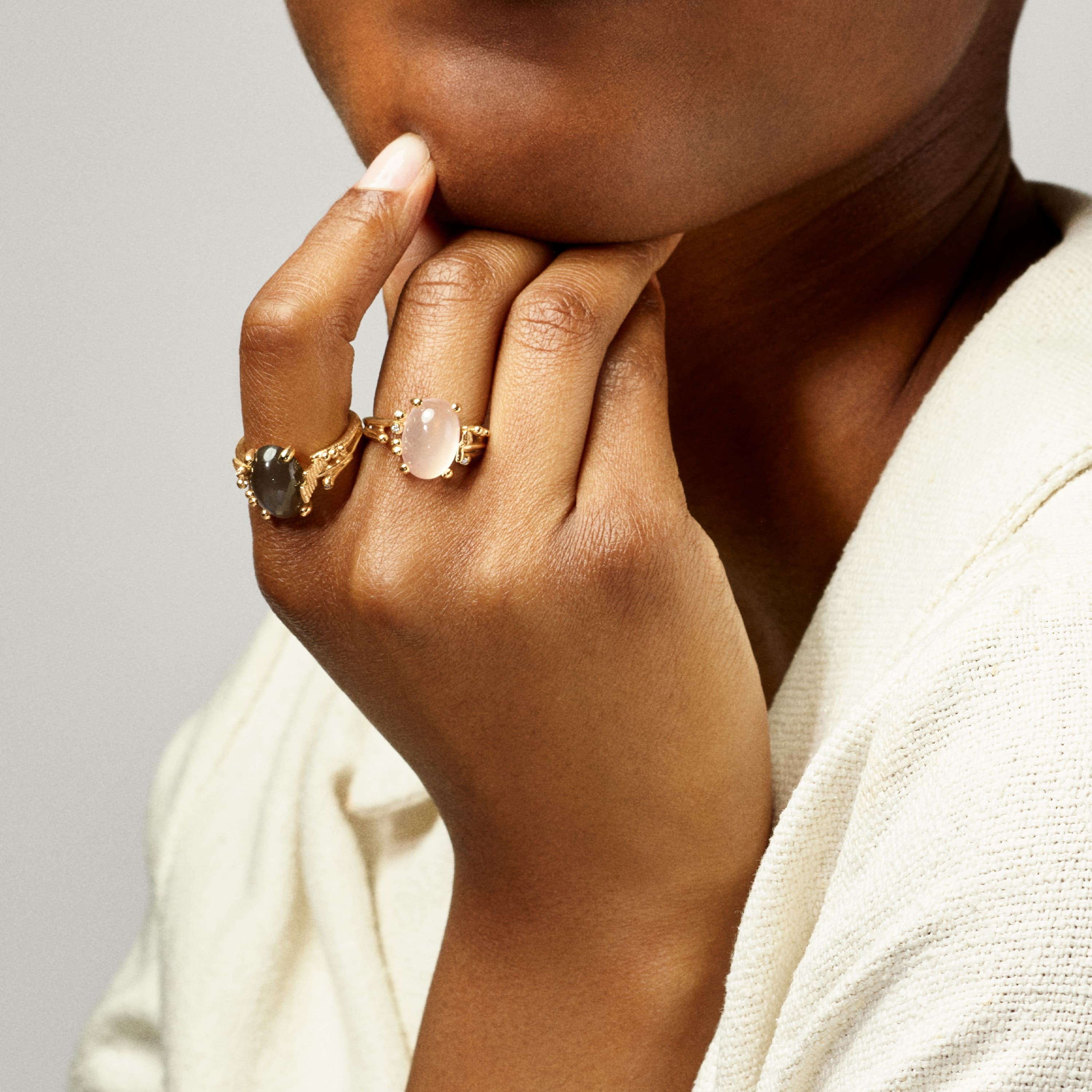 Designed by Charlotte Lynggaard, the BoHo ring small is crafted from 18 karat yellow gold with a 9x13 mm grey moonstone, and 3 hand-set diamonds 0.02 carat TW. VS. The hammered and polished gold surfaces are hand-finished by master goldsmiths. Part of The BoHo Collection. Please note: As gemstones are natural materials, each stone is absolutely unique. They will vary in colour and have individual, unique inclusions and features. Web-images of stones are only representatives of the unique stone you will receive when ordering the product, not the exact stone.