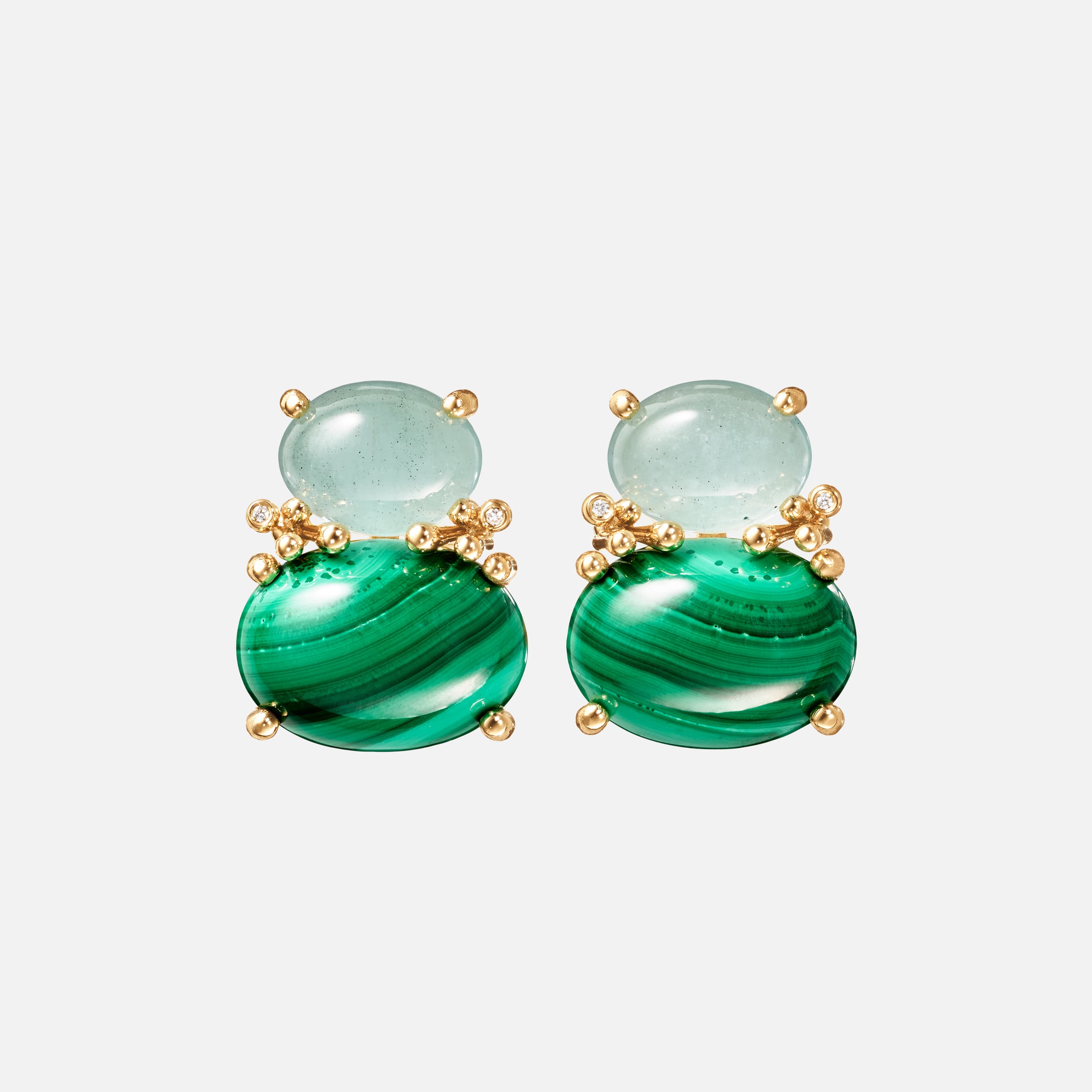 These BoHo stud earrings, designed by Charlotte Lynggaard, are crafted from 18 karat yellow gold, two aquamarines, two malachites, and four diamonds totalling 0.01 ct. TW VS. Each earring features a small eyelet for earring pendants. Please note: As gemstones are natural materials, each stone is truly unique. They will vary in colour and have individual, unique inclusions and features. The web images of the stones are only representatives of the unique stones you will receive when ordering the product, not the exact stones. Sold as a pair. Part of The BoHo Collection.