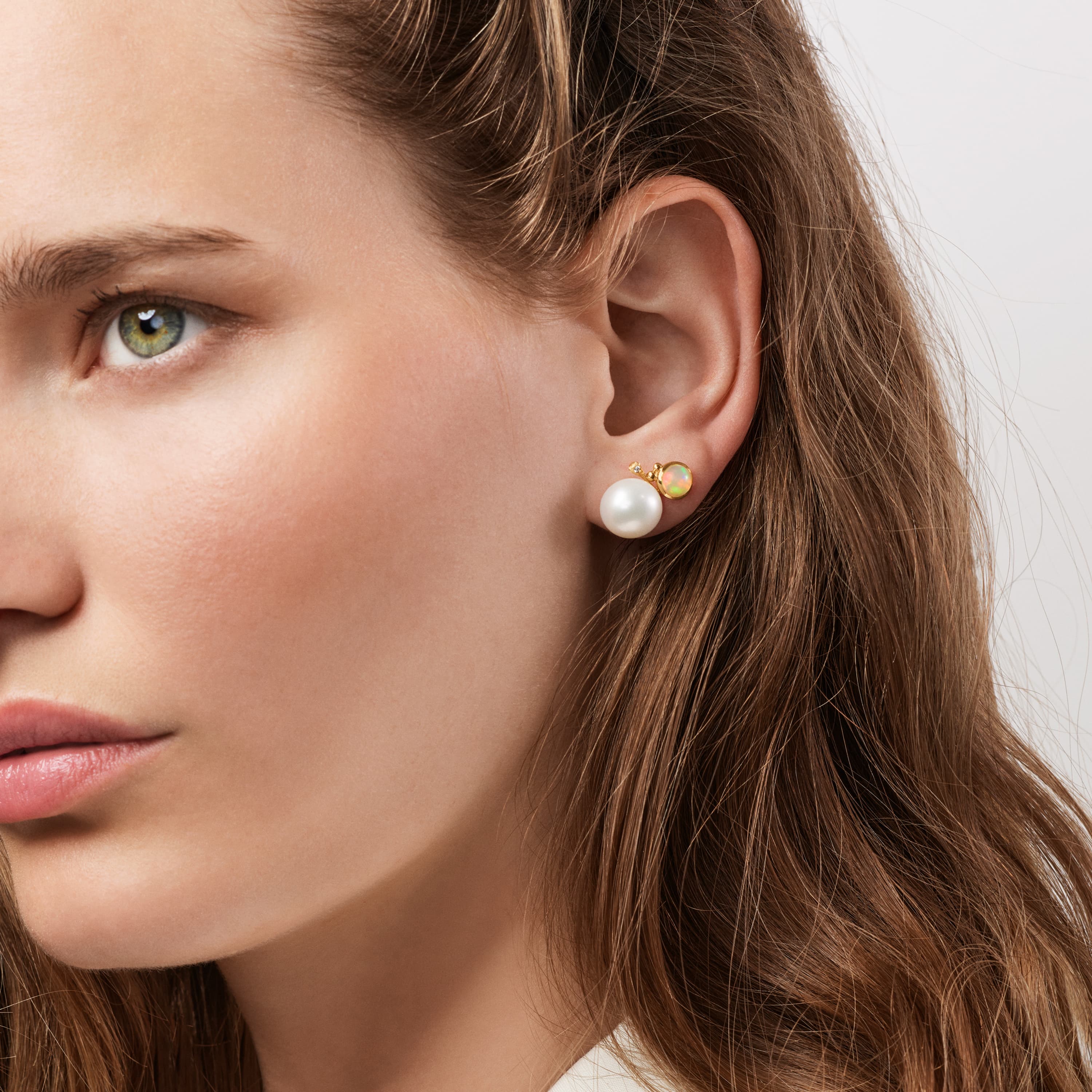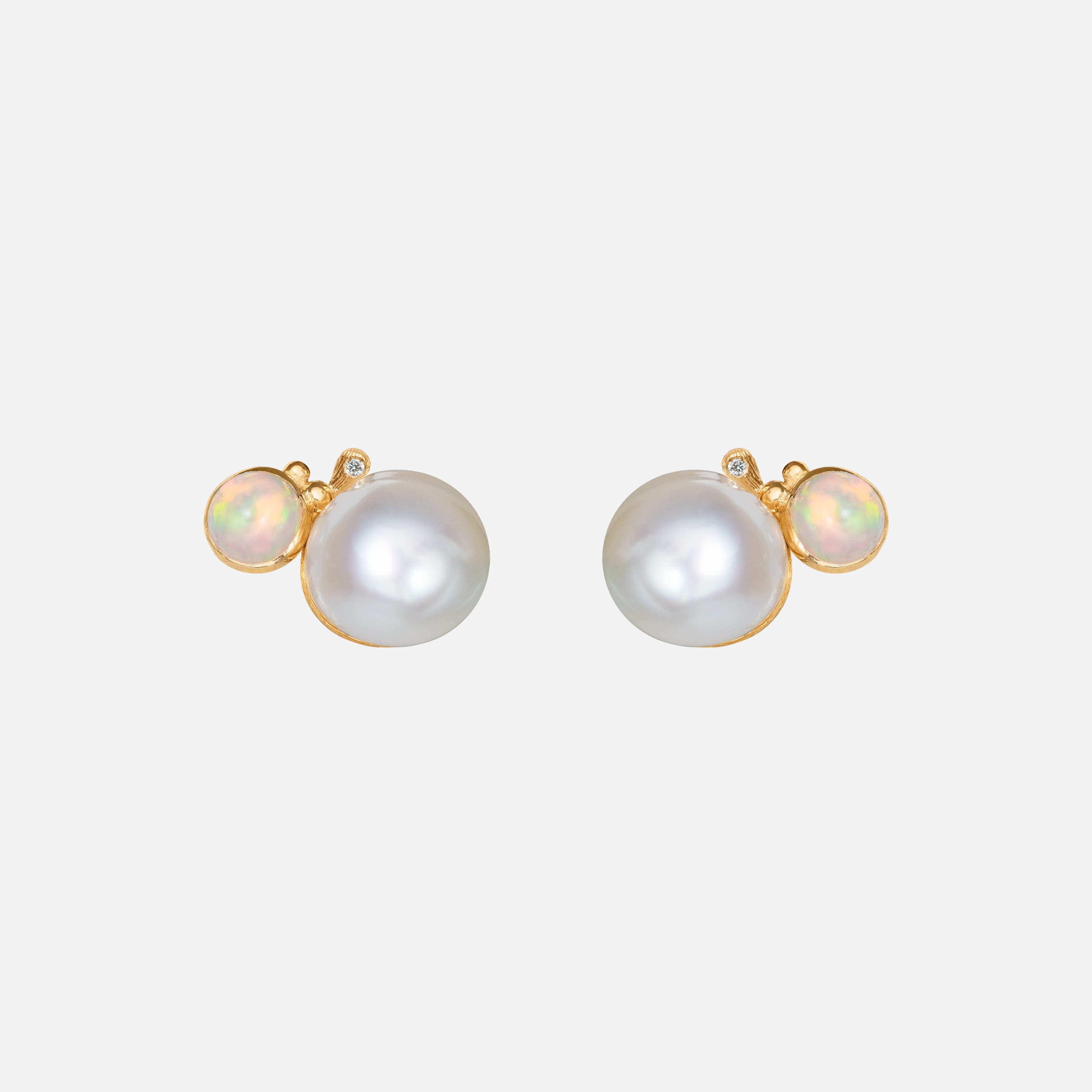 Designed by Charlotte Lynggaard, the BoHo stud earrings are crafted from 18 karat yellow gold with two freshwater pearls, approximately 10-11 mm each, two 6 mm opals, and two diamonds 0.02 carat TW. VS. Each earring has two eyelets for hanging pendants. Sold as a pair. Part of the BoHo Collection.