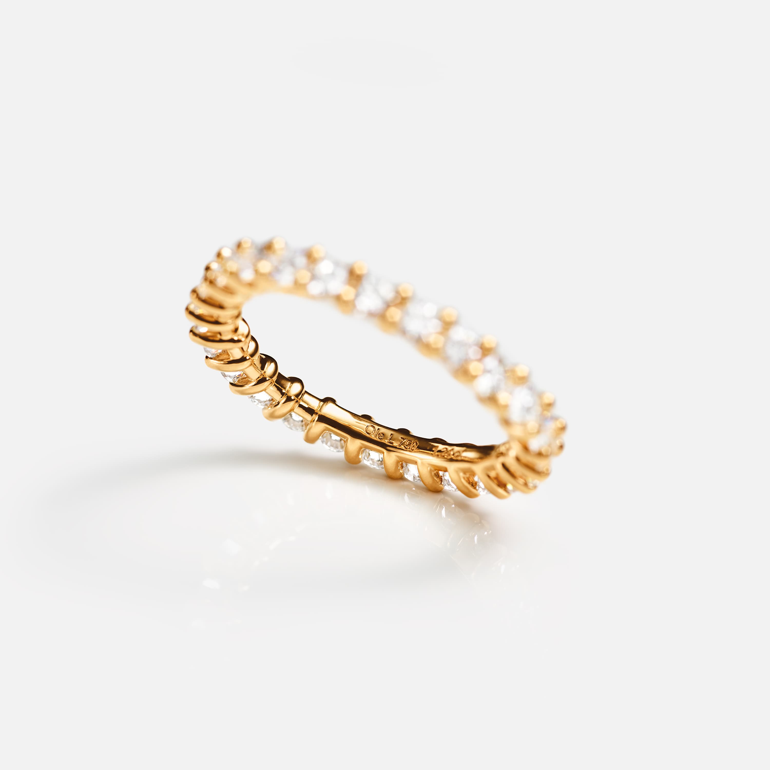 Designed by Ole Lynggaard, the Celebration eternity ring is crafted from 18 karat polished yellow gold with 24-26 prong-set diamonds, totalling 1,2-1,3 carat TW. VS. depending on ring size. Handcrafted by master goldsmiths. Part of the Ole Lynggaard Copenhagen Engagement and Wedding Collection.