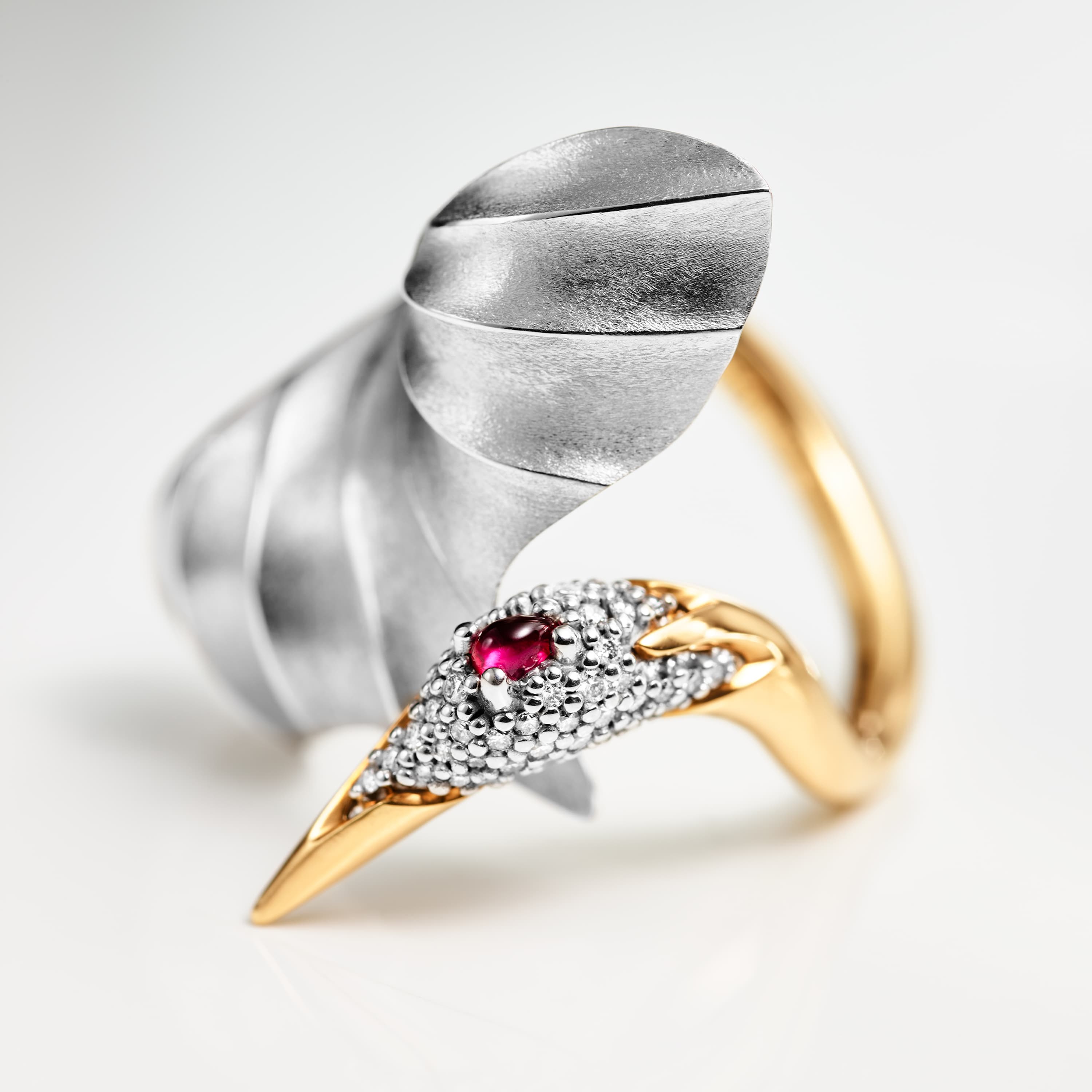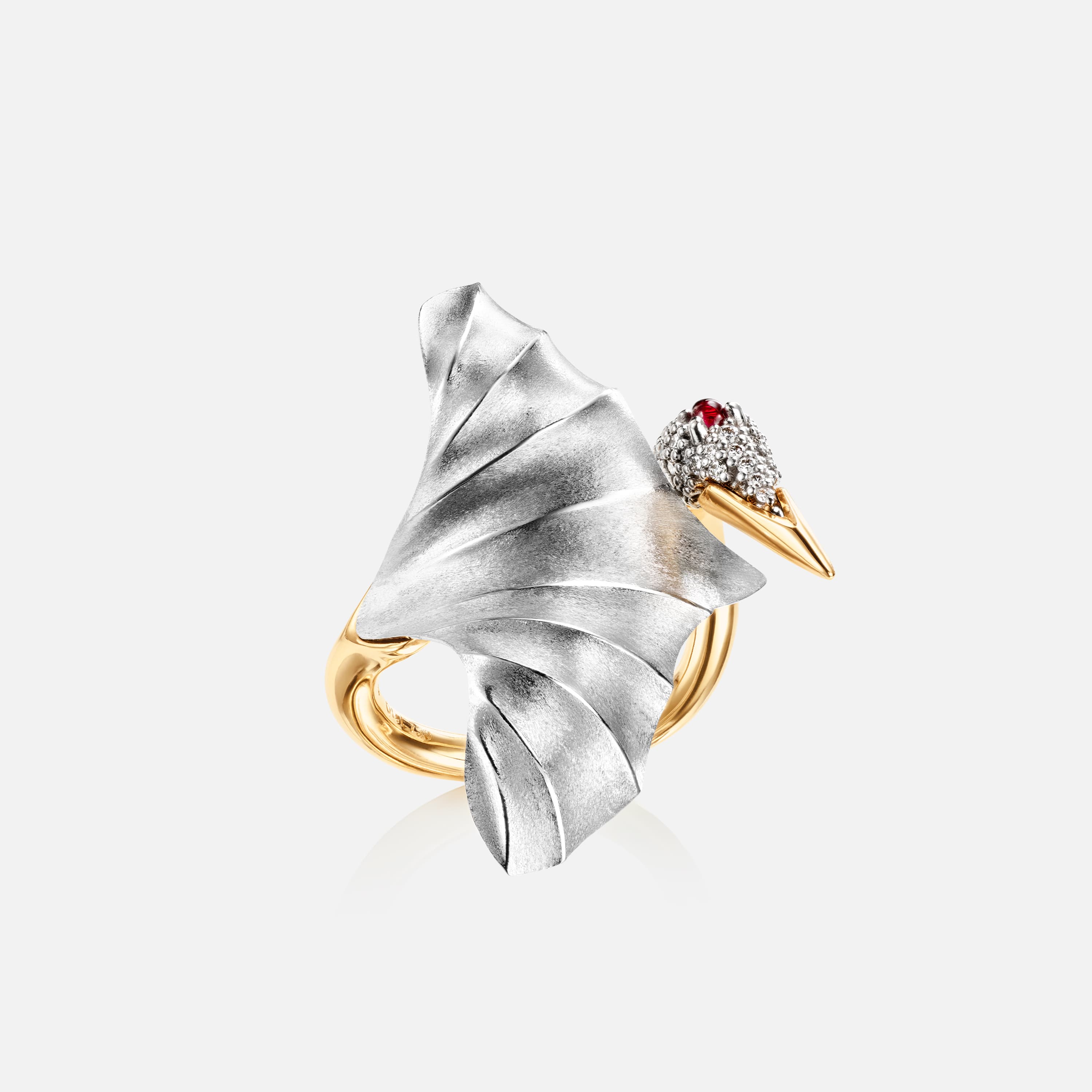 Designed by Ole Lynggaard, the Cranes ring medium is crafted from 18 karat yellow and white gold, a 0,09 carat ruby, and 56 pavé-set diamonds of different sizes to create and follow the curves of the piece, totalling 0,26 carat TW. VS. Master goldsmiths hammer the white gold wings to achieve a matt appearance, whilst the visible yellow gold surfaces are hand-polished. Part of the Cranes Collection.