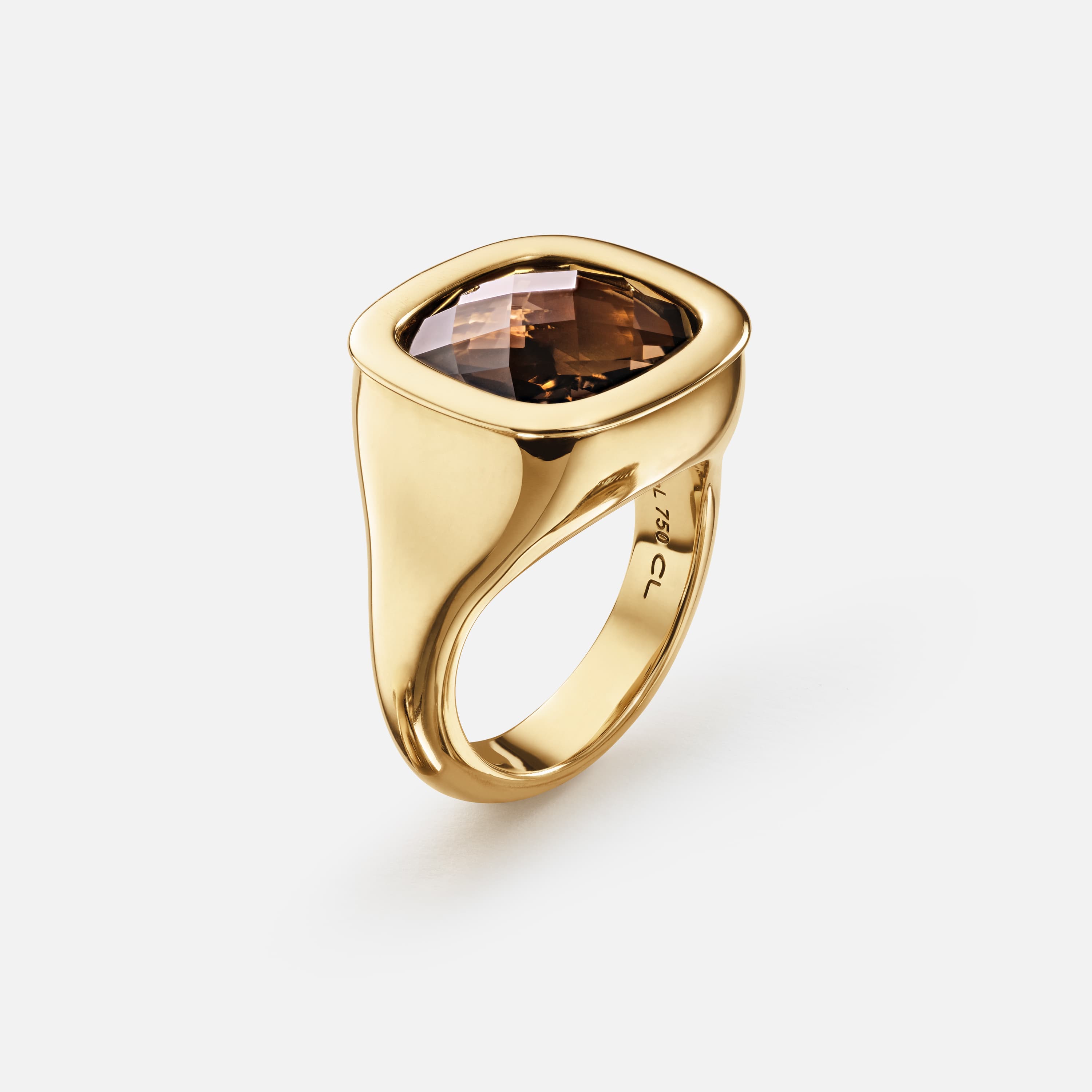 Designed by Charlotte Lynggaard, the Cushion ring is crafted from 18 karat yellow gold and set with a 12x13 mm smoky quartz. The inside of the ring has a hidden pattern of stars that allows light to permeate the gemstone, and the outside is hand polished by master goldsmiths. Part of the Cushion Collection.