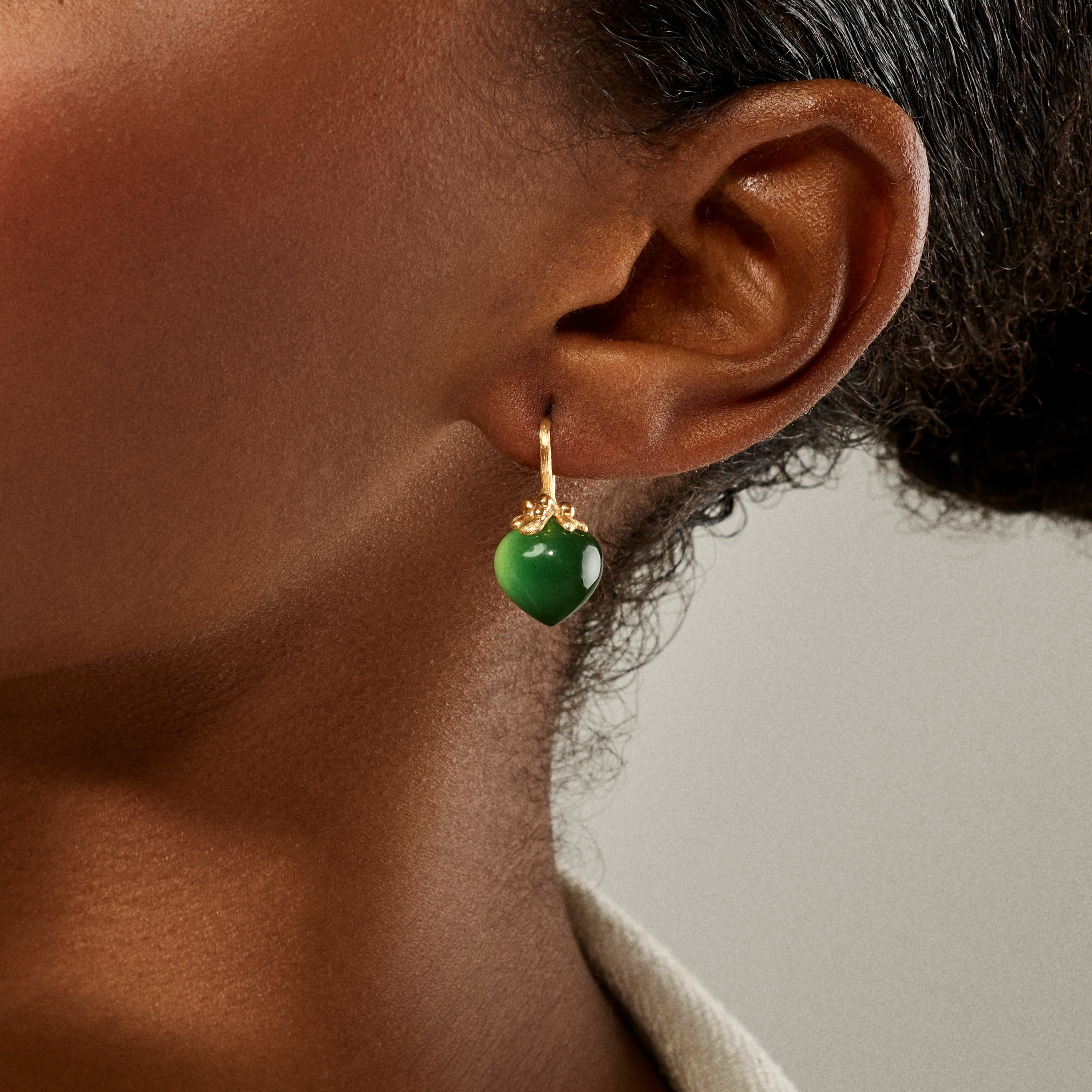 Designed by Charlotte Lynggaard, the Dew Drops Filigree earrings are crafted from 18 karat yellow gold with green serpentine cabochon drops. Handcrafted by master goldsmiths, the visible gold surfaces are hand-satinised, whilst the hook fastening is polished for a smooth finish. Sold as a pair. Part of the Ole Lynggaard Copenhagen Dew Drops Collection.