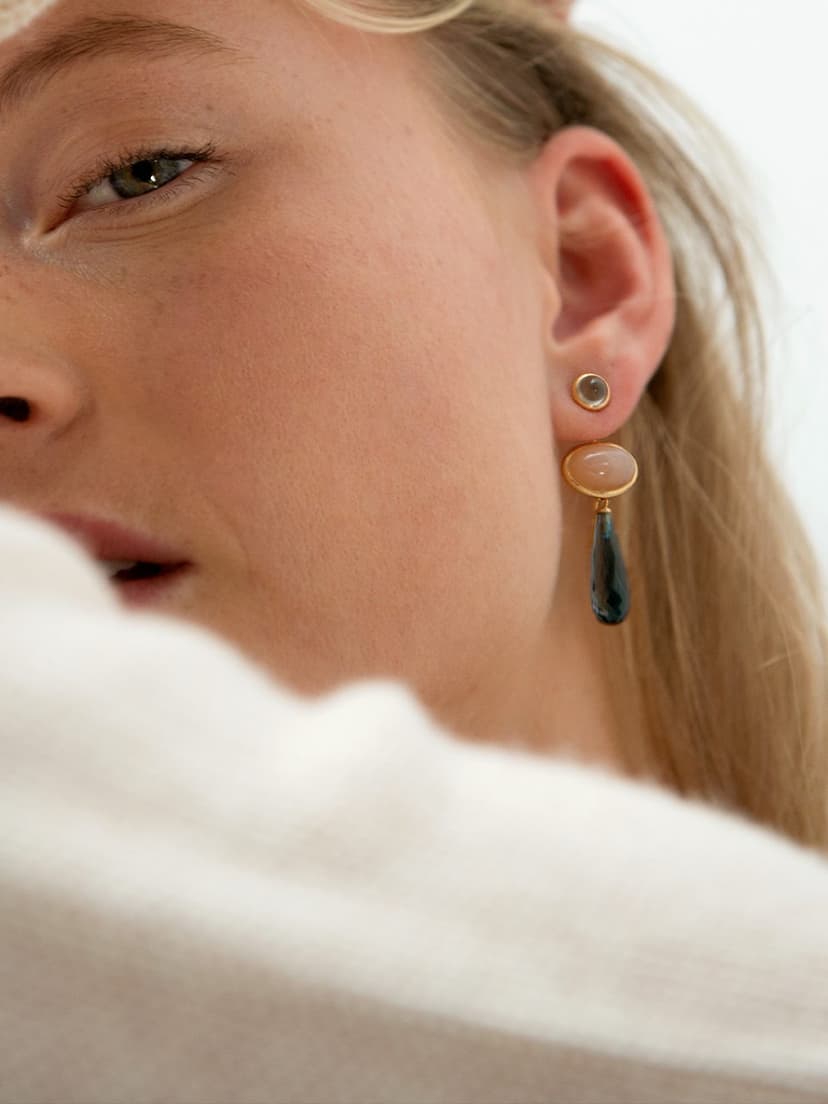 Designed by Charlotte Lynggaard, the earring pendant drop is crafted from 18 karat yellow gold with a facetted, 20x7 mm London blue topaz cabochon drop. Handcrafted by master goldsmiths, the pendant drop is made for hanging in earrings and pendants with eyelets. Sold as a single piece. Part of the Lotus Collection.