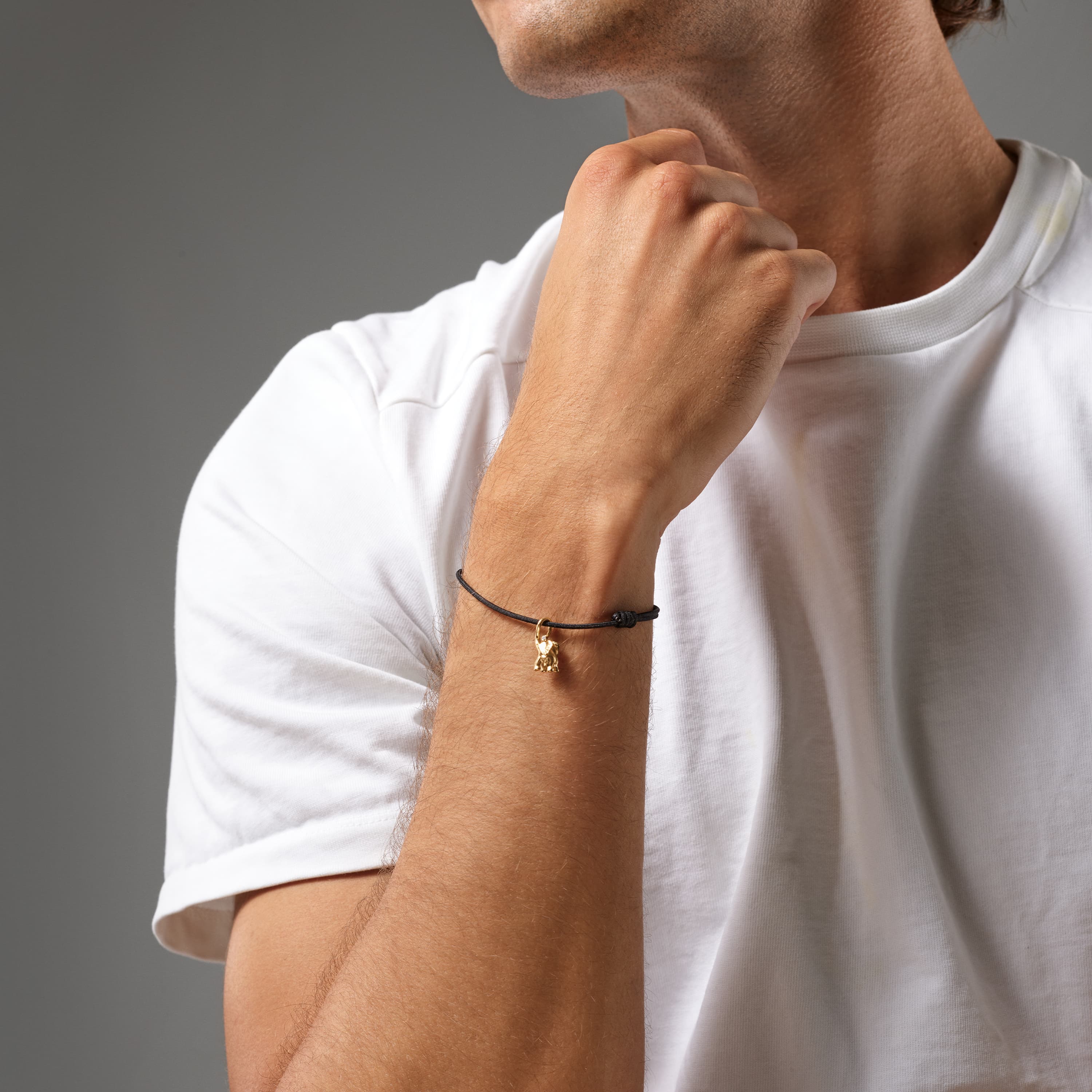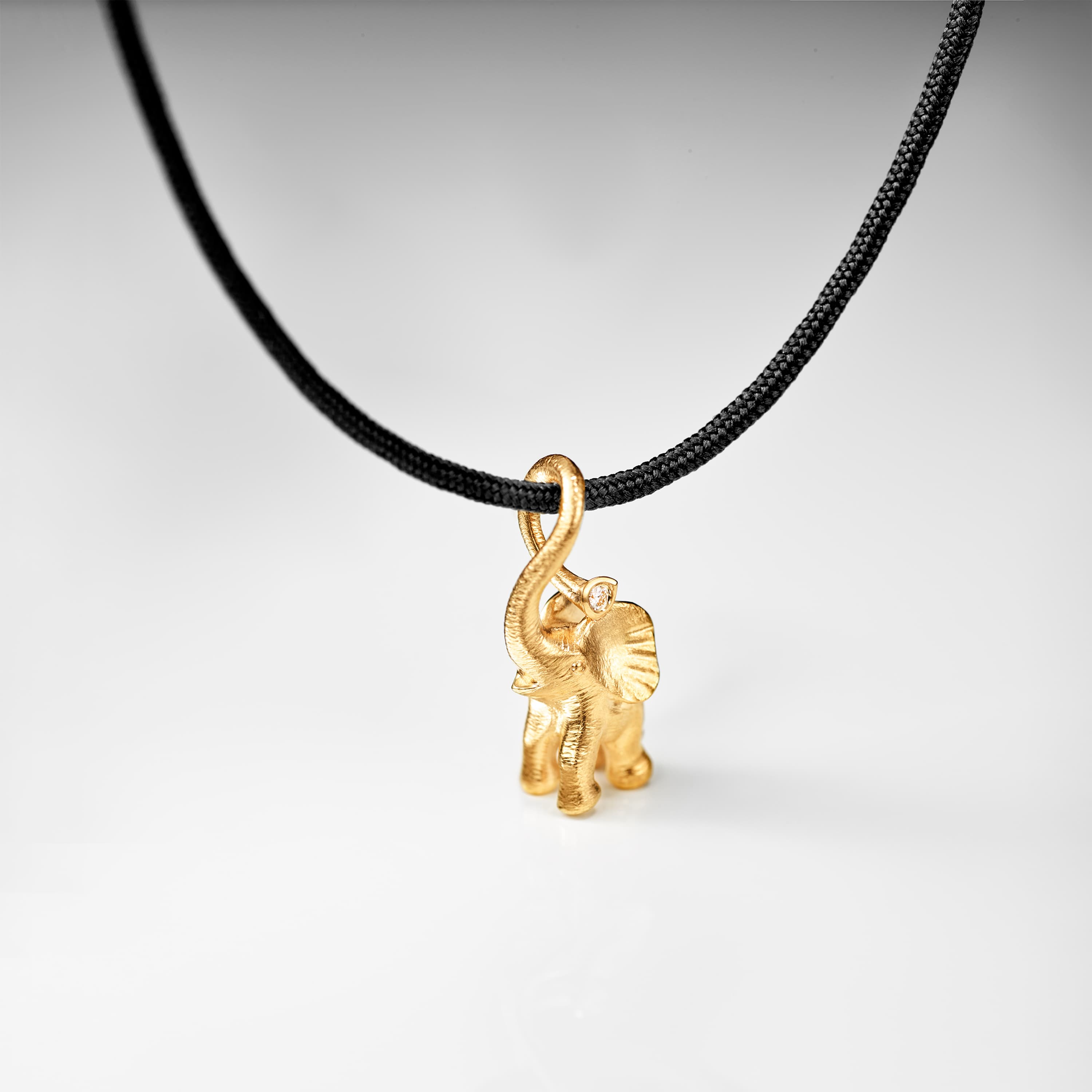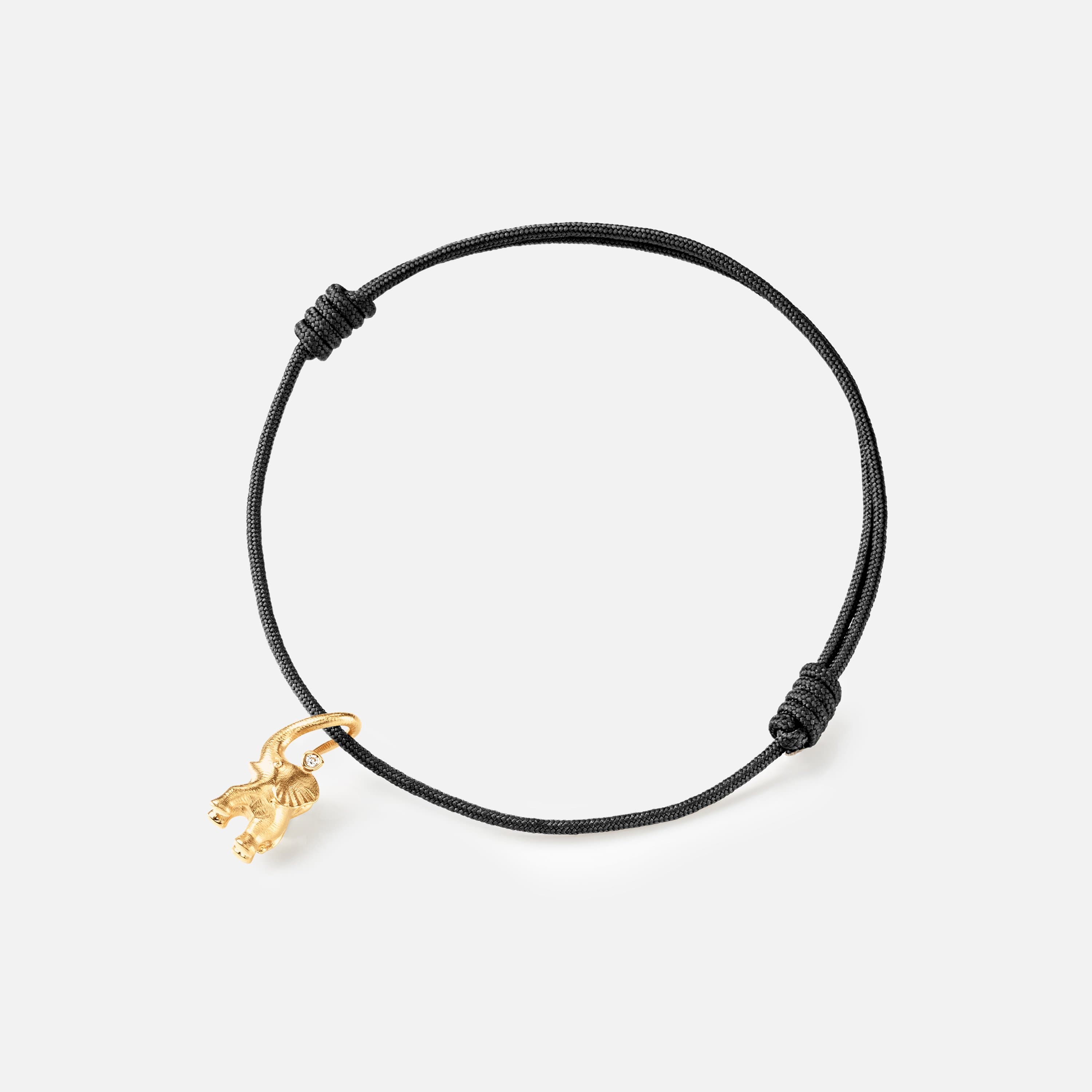 Designed by Ole Lynggaard, the My Little World Elephant bracelet comprises an 18 karat yellow gold charm, set with a diamond 0.01 carat TW. VS. and adjustable black cord. The contrasting hammered and polished surfaces are hand-crafted by master goldsmiths. Part of the Elephant Collection.