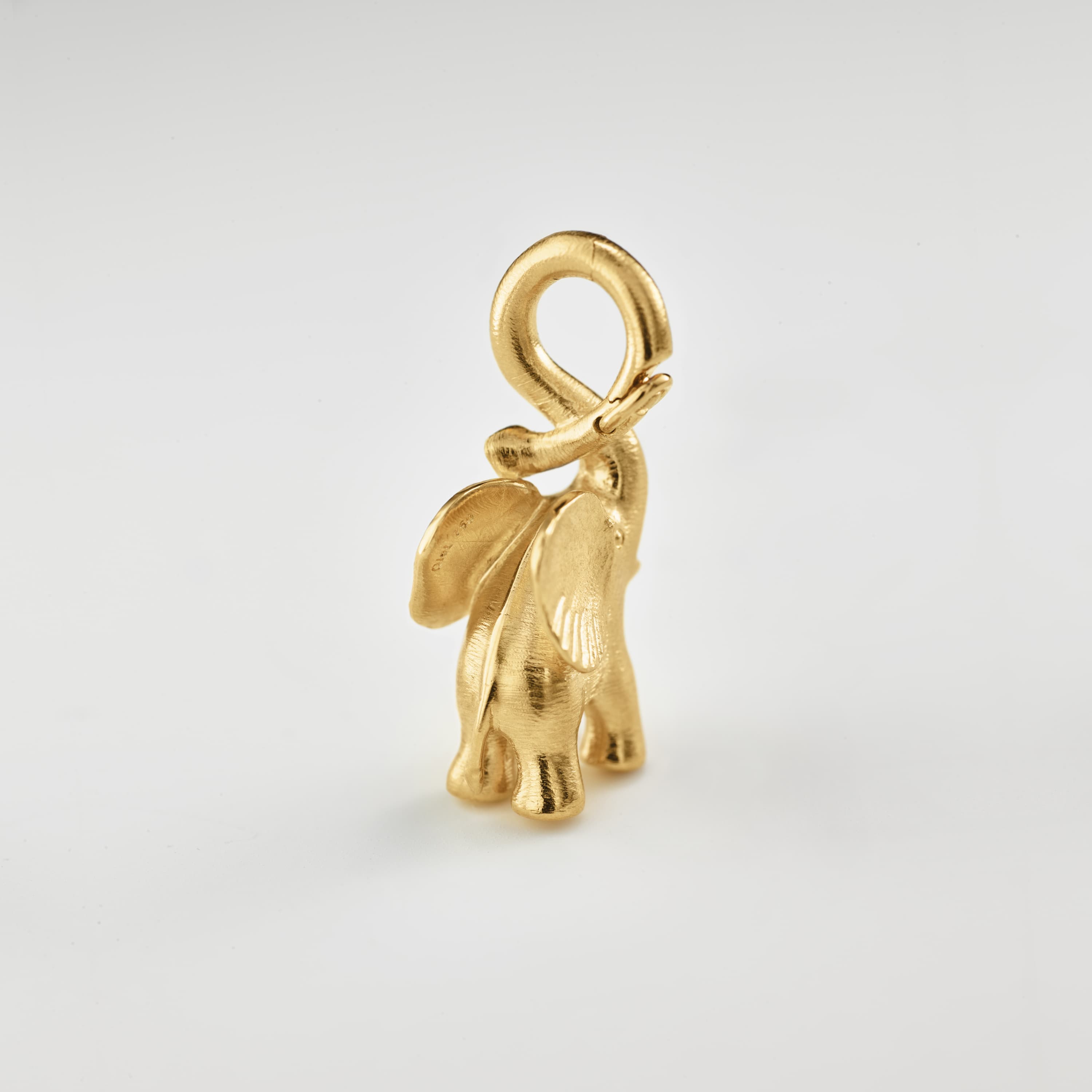 Designed by Ole Lynggaard, the Elephant pendant medium is 25 mm high, crafted from 18 karat yellow gold, and set with a diamond 0.01 carat TW. VS. The trunk is the lock mechanism allowing it to be worn on any collier or bracelet. The contrasting hammered and polished surfaces are hand-crafted by master goldsmiths. Part of the Elephant Collection.