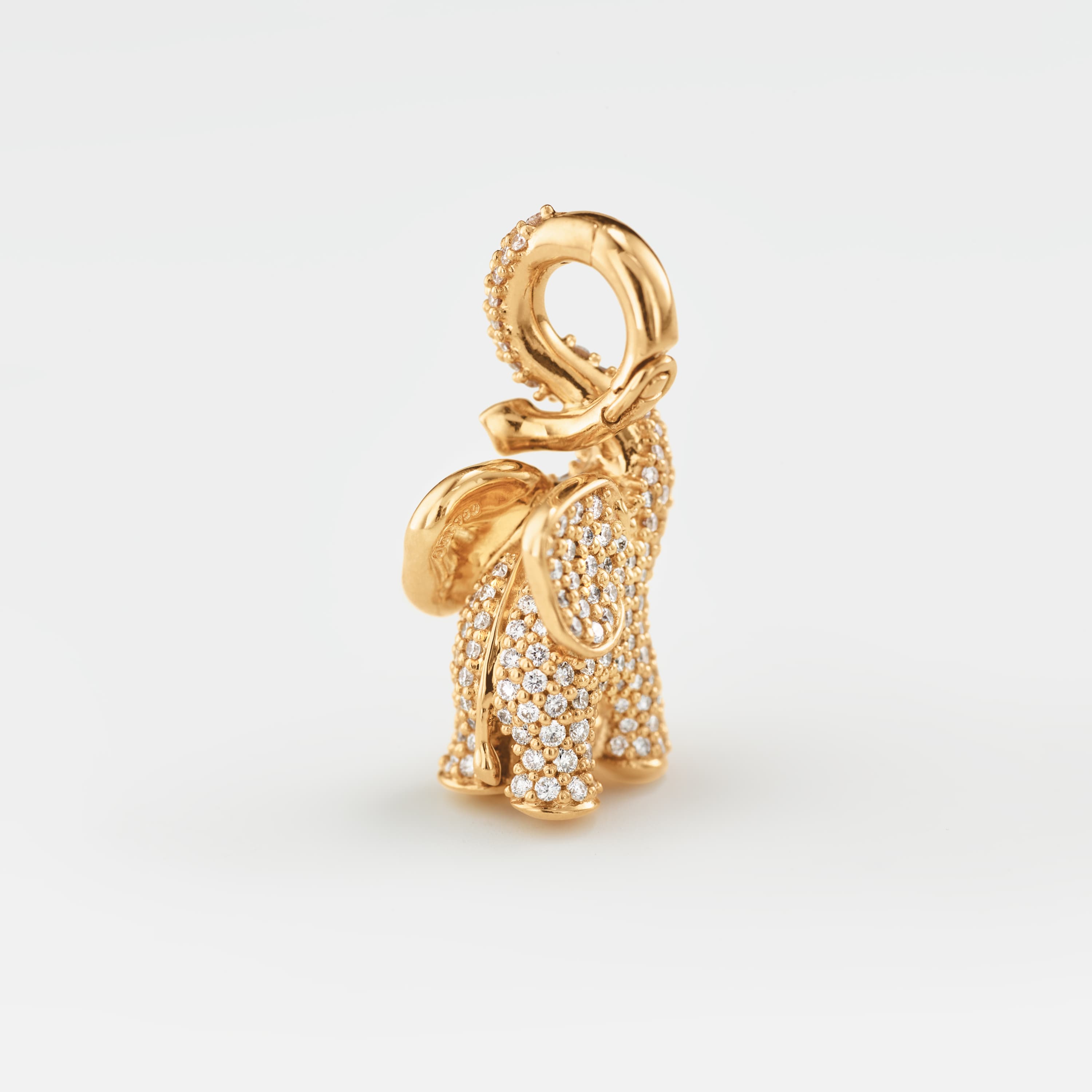 Designed by Ole Lynggaard, the Elephant pavé diamond pendant medium is 25 mm high, and crafted from 18 karat yellow gold with 260 hand-set pavé diamonds, varying in size to create and follow the shape of the pendant, totalling 0.88 carat TW. VS. The trunk is the lock mechanism allowing it to be worn on any collier or bracelet. Hand-sculpted and finished by master goldsmiths. Part of the Elephant Collection.