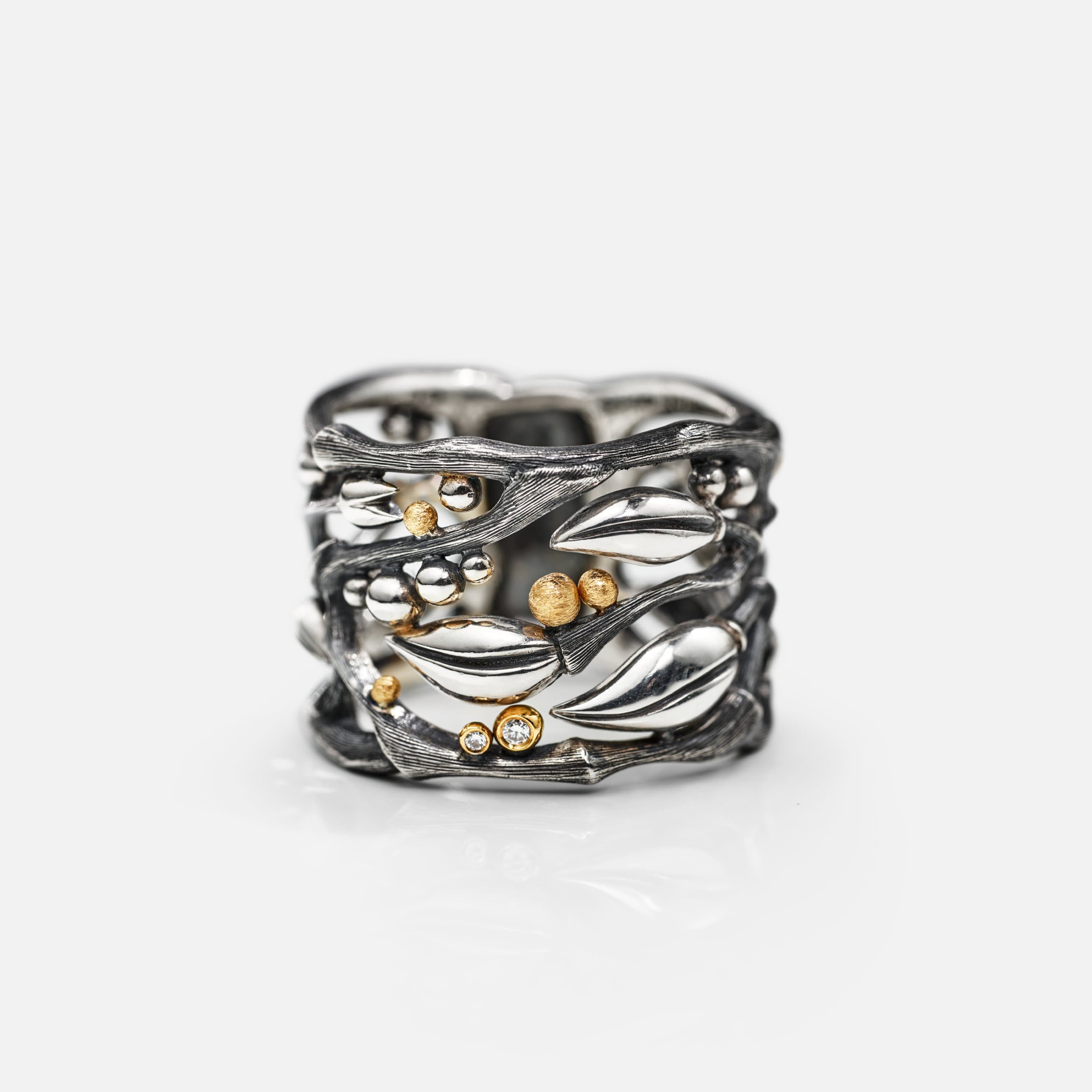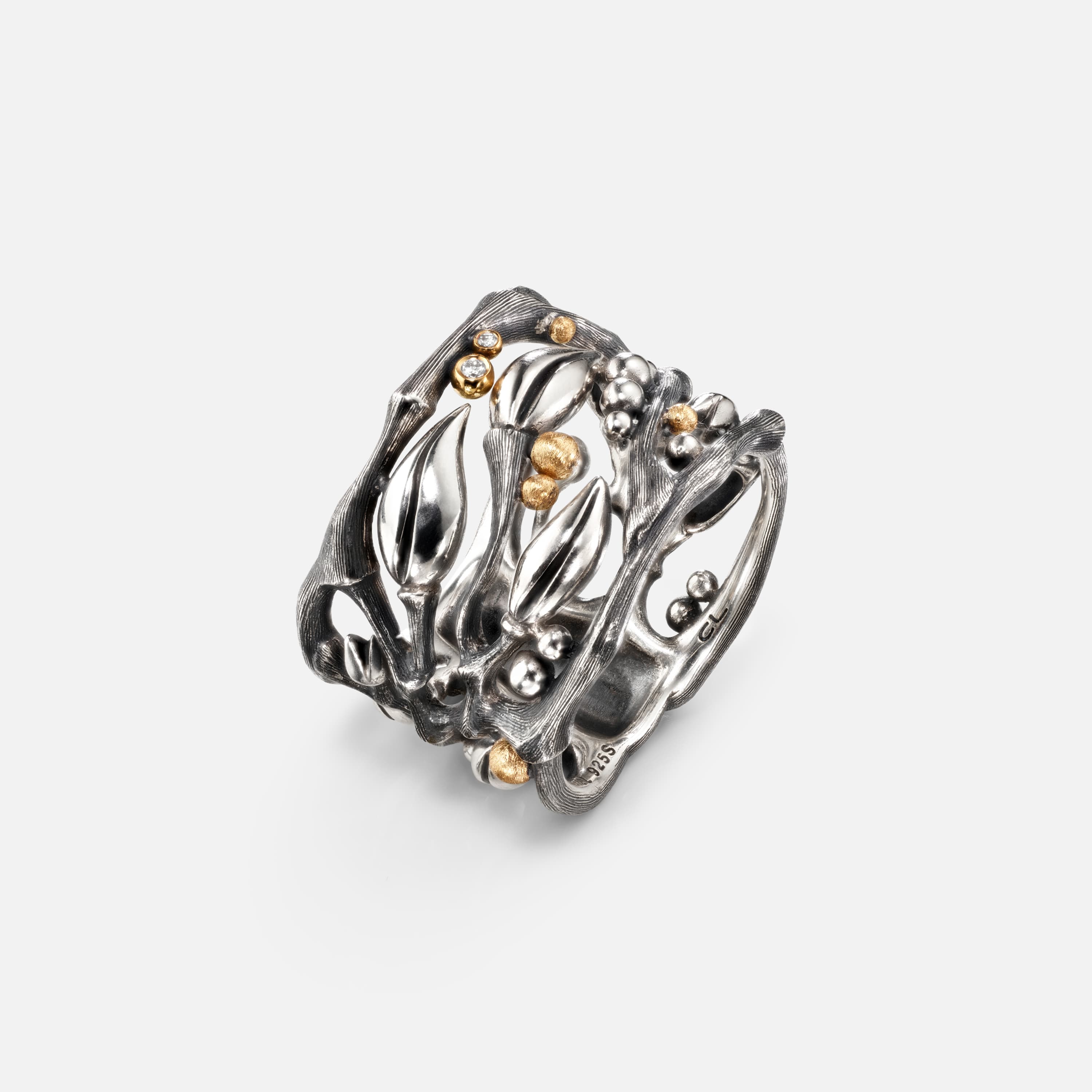 Designed by Charlotte Lynggaard, the Forest ring is crafted from lightly oxidized Sterling silver, 18 karat yellow gold and two bezel-set diamonds 0.02 carat TW. VS. The precious metal surfaces are hand-finished using different techniques to create contrast. Part of the Forest Collection.