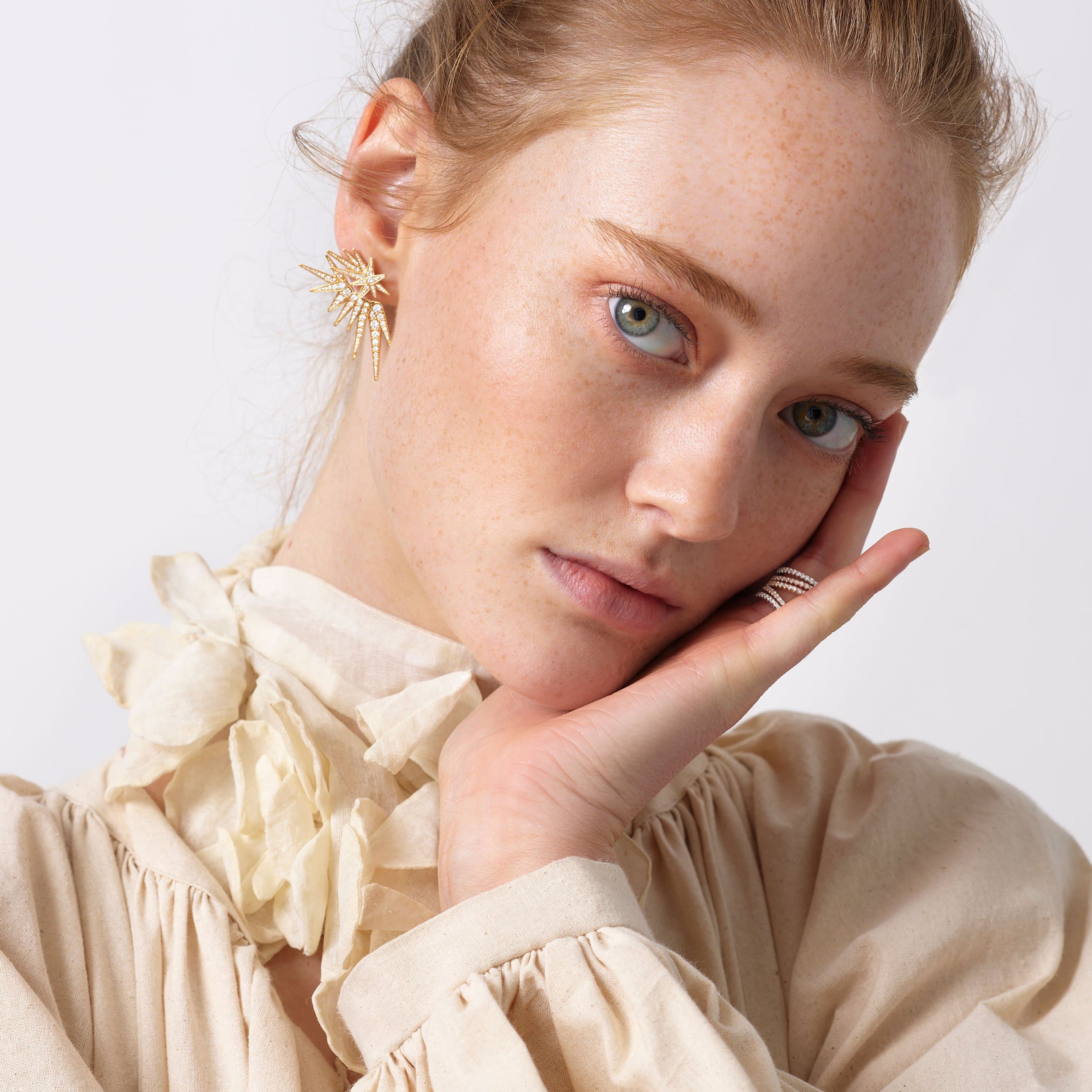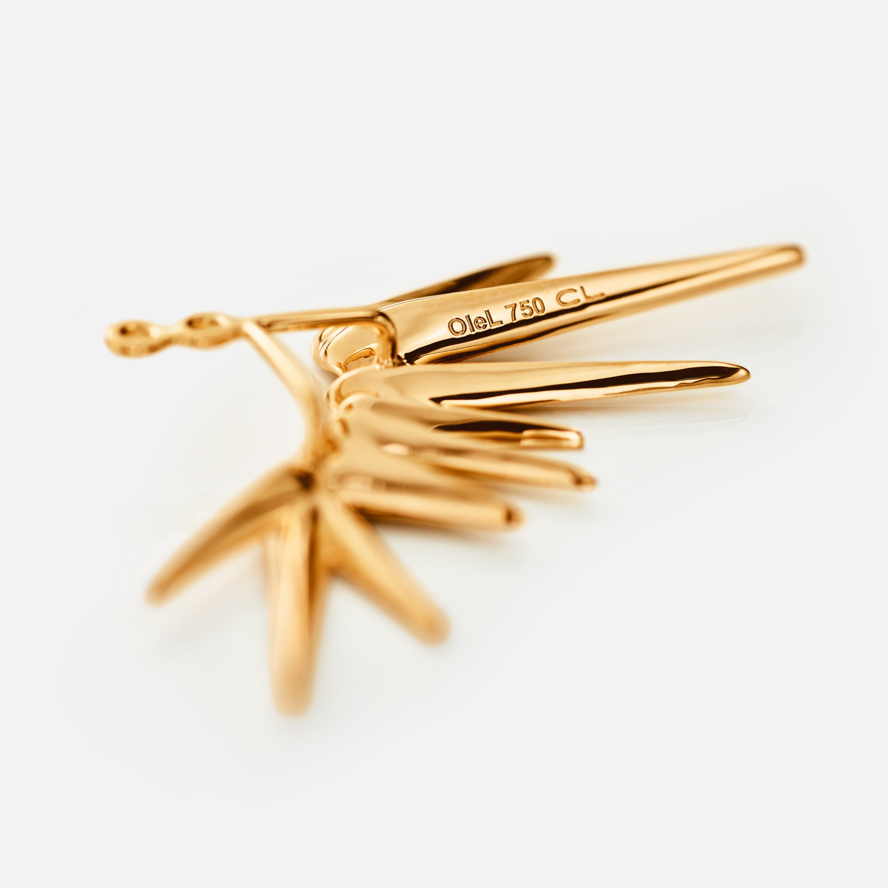 Designed by Charlotte Lynggaard. This Funky Stars 9-pointed earring pendant is crafted from 18 karat yellow gold and 70 diamonds totalling 0.99 carat TW. VS. The Funky Stars Collection is brought to life by new, intricate techniques creating a range of edgy expressions. Composed by layers of brilliant-cut diamonds, the Funky Stars have a multidimensional structure of exceptional sparkle. 32 mm at the widest point.
