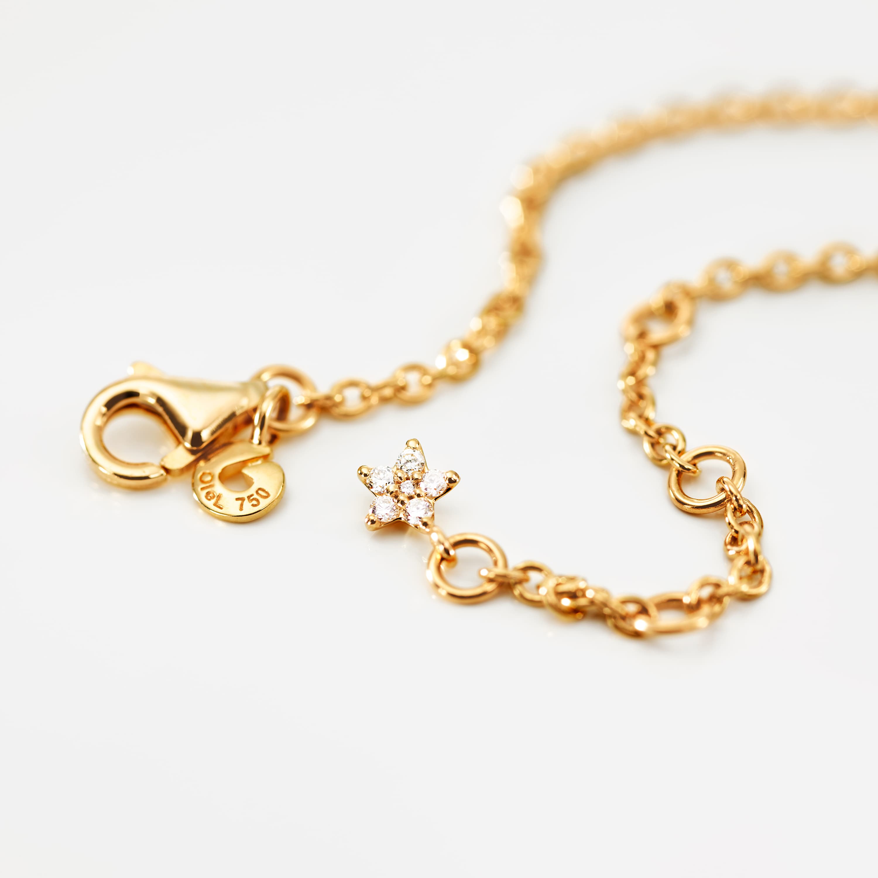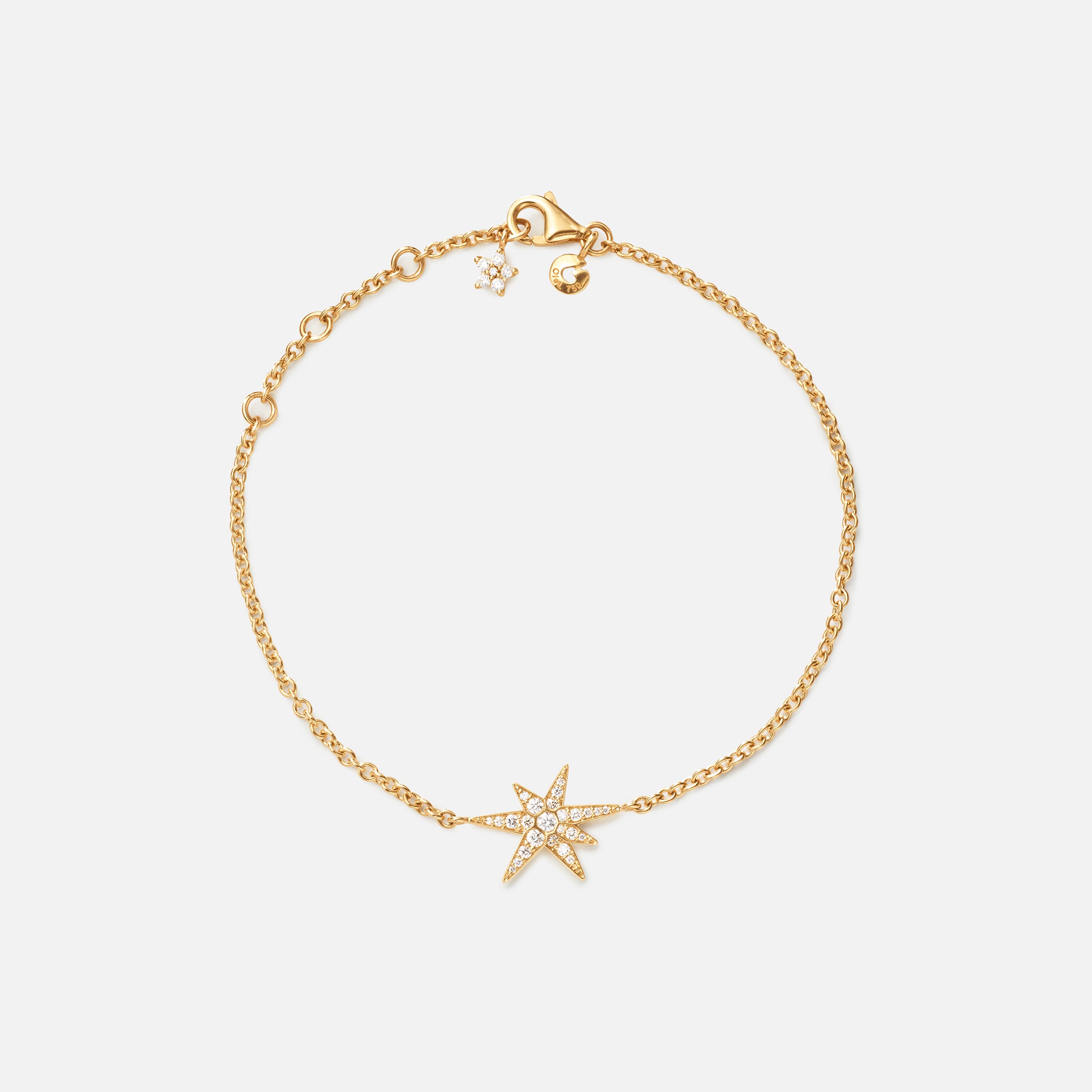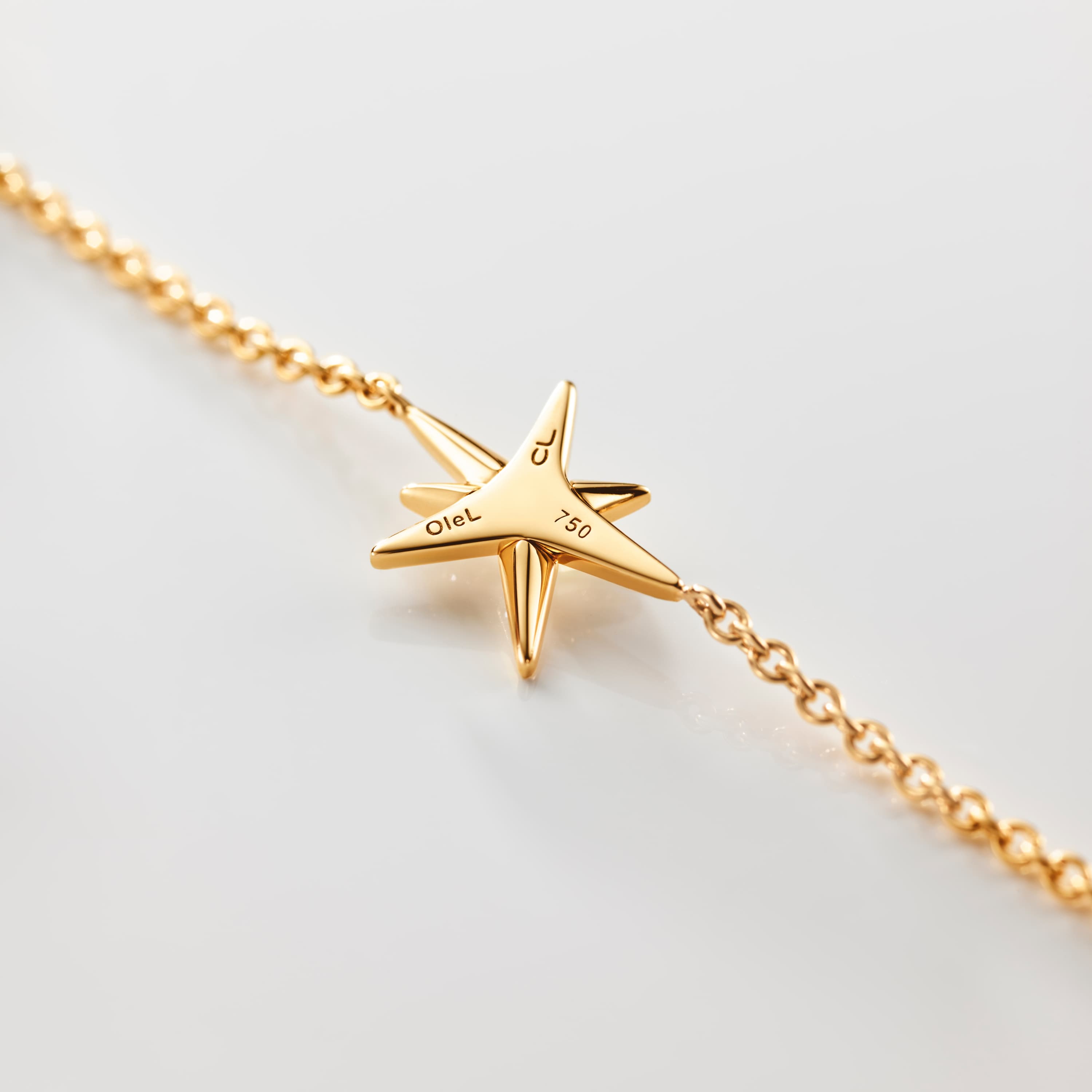 The Funky Stars bracelet small, designed by Charlotte Lynggaard, is crafted from 18 karat yellow gold and diamonds. With their sharp lines and brilliance, Funky Stars are edgy expressions echoing stardust and timeless glamour. This Funky Stars bracelet features 31 diamonds totalling 0.15 ct. TW VS. The bracelet can be adjusted to 17, 16, or 15 cm in length using the additional eyes on the chain. The adjustable end of the bracelet is adorned with a petite Shooting Star composed of diamonds, adding a sophisticated extra sparkle. Part of The Funky Stars Collection.