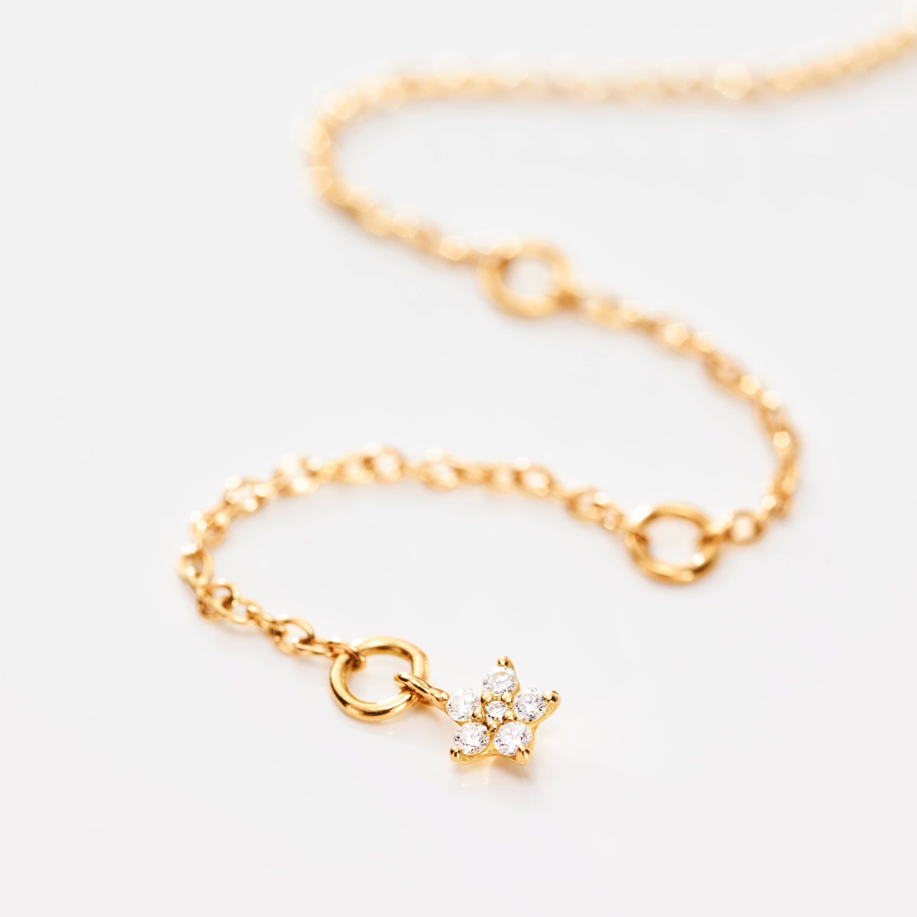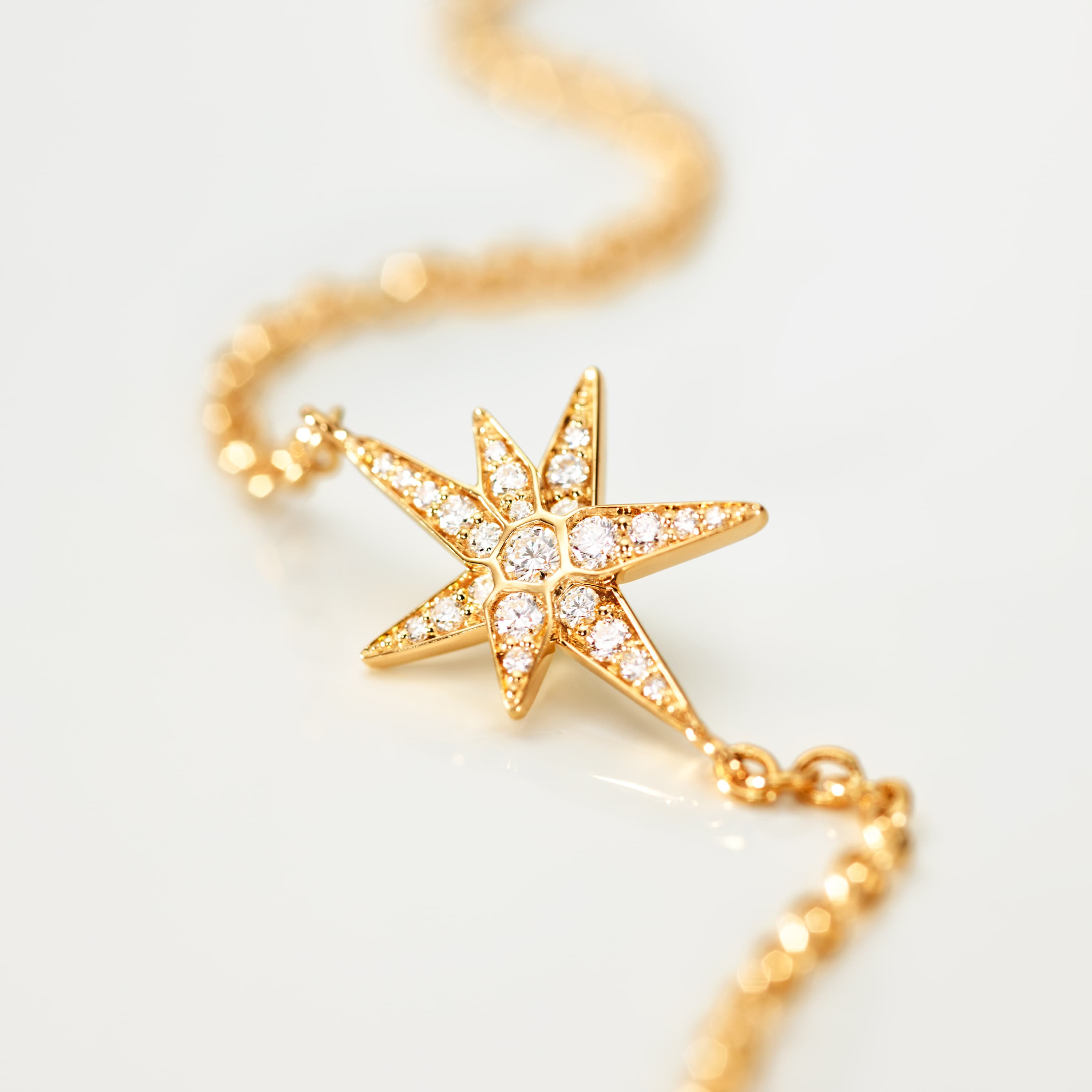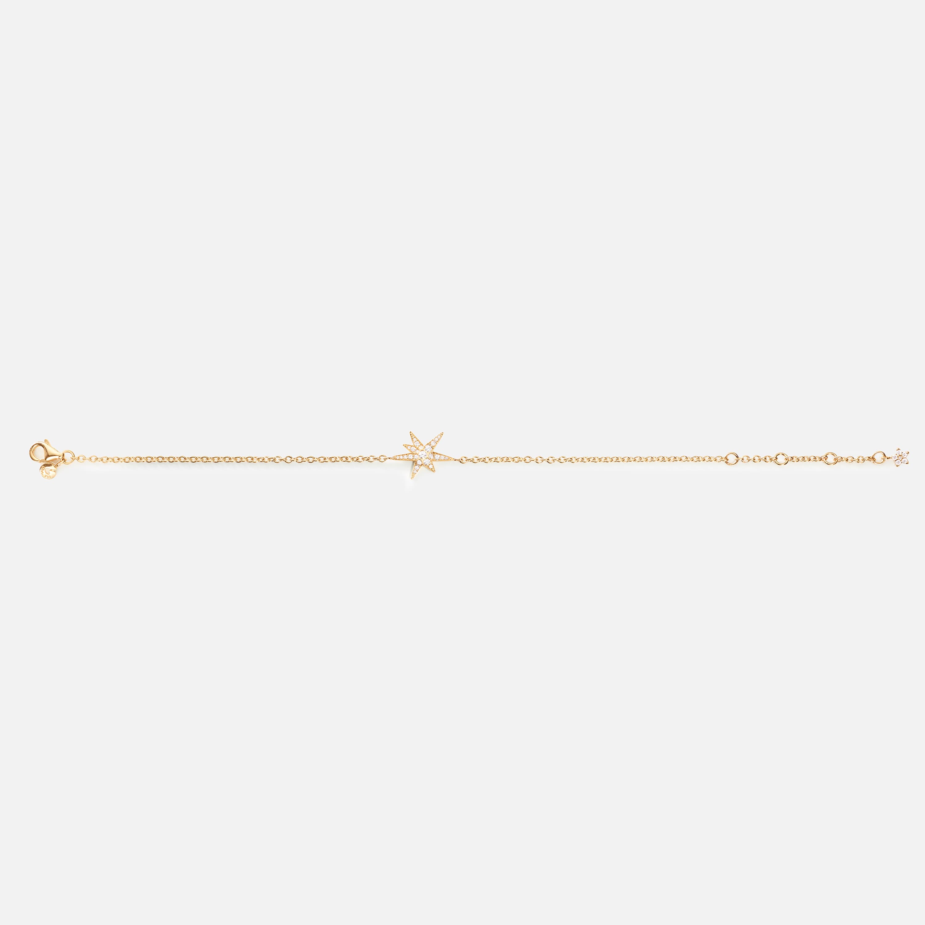 The Funky Stars bracelet small, designed by Charlotte Lynggaard, is crafted from 18 karat yellow gold and diamonds. With their sharp lines and brilliance, Funky Stars are edgy expressions echoing stardust and timeless glamour. This Funky Stars bracelet features 31 diamonds totalling 0.15 ct. TW VS. The bracelet can be adjusted to 17, 16, or 15 cm in length using the additional eyes on the chain. The adjustable end of the bracelet is adorned with a petite Shooting Star composed of diamonds, adding a sophisticated extra sparkle. Part of The Funky Stars Collection.