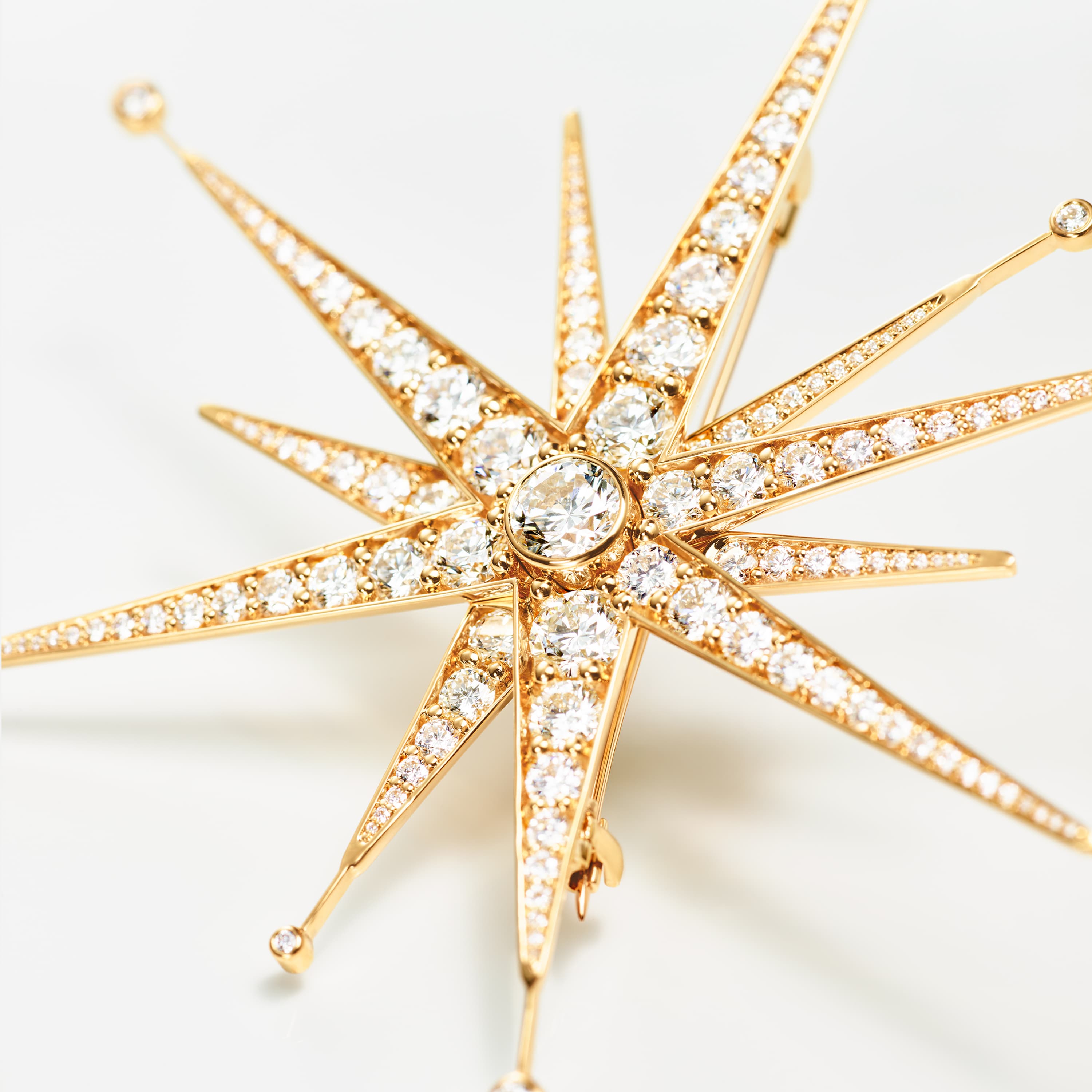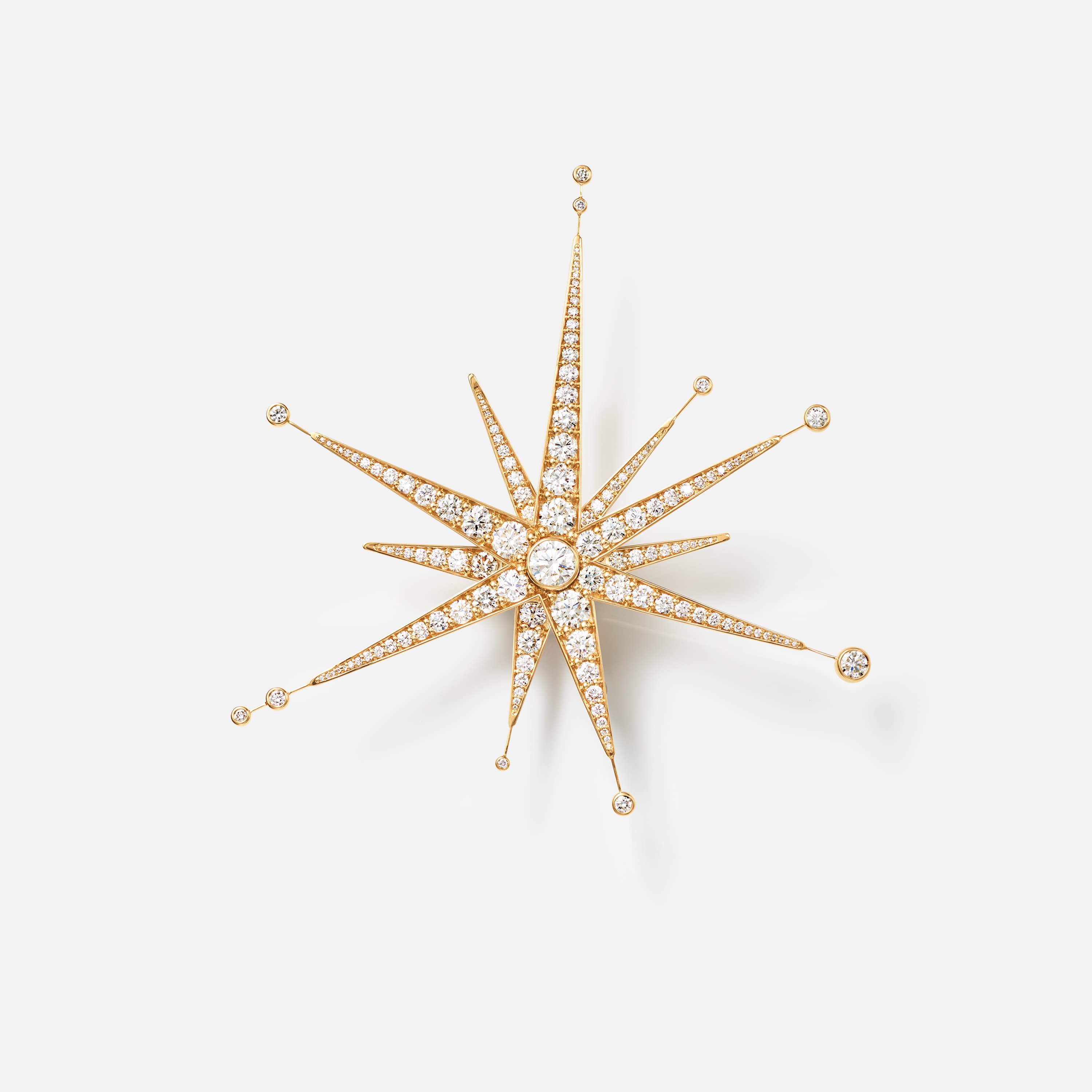 Designed by Charlotte Lynggaard, the Funky Stars brooch is crafted in 18 karat yellow gold set with 148 diamonds totalling 8.38 carat. TW VS. Diamonds of varying sizes come together in a captivating, one-of-a-kind formation. Handcrafted by master goldsmiths. Part of The Funky Stars Collection.