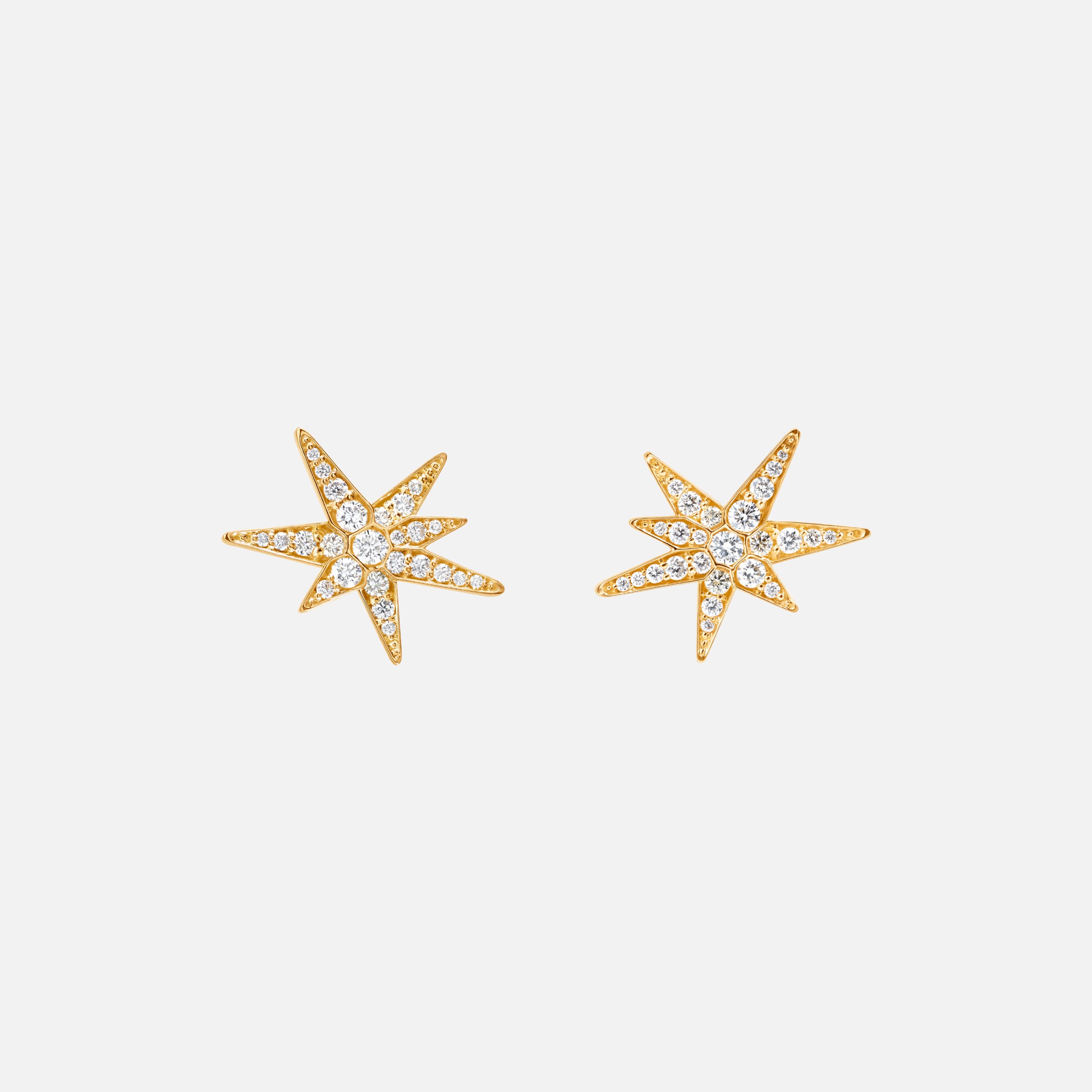 Designed by Charlotte Lynggaard. The Funky Stars stud earrings small are crafted from 18 karat yellow gold and 50 diamonds totalling 0.24 carat TW. VS. The Funky Stars Collection is brought to life by new, intricate techniques creating a range of edgy expressions. Composed by layers of brilliant-cut diamonds, the Funky Stars have a multidimensional structure of exceptional sparkle. 13.5 mm at the widest point.