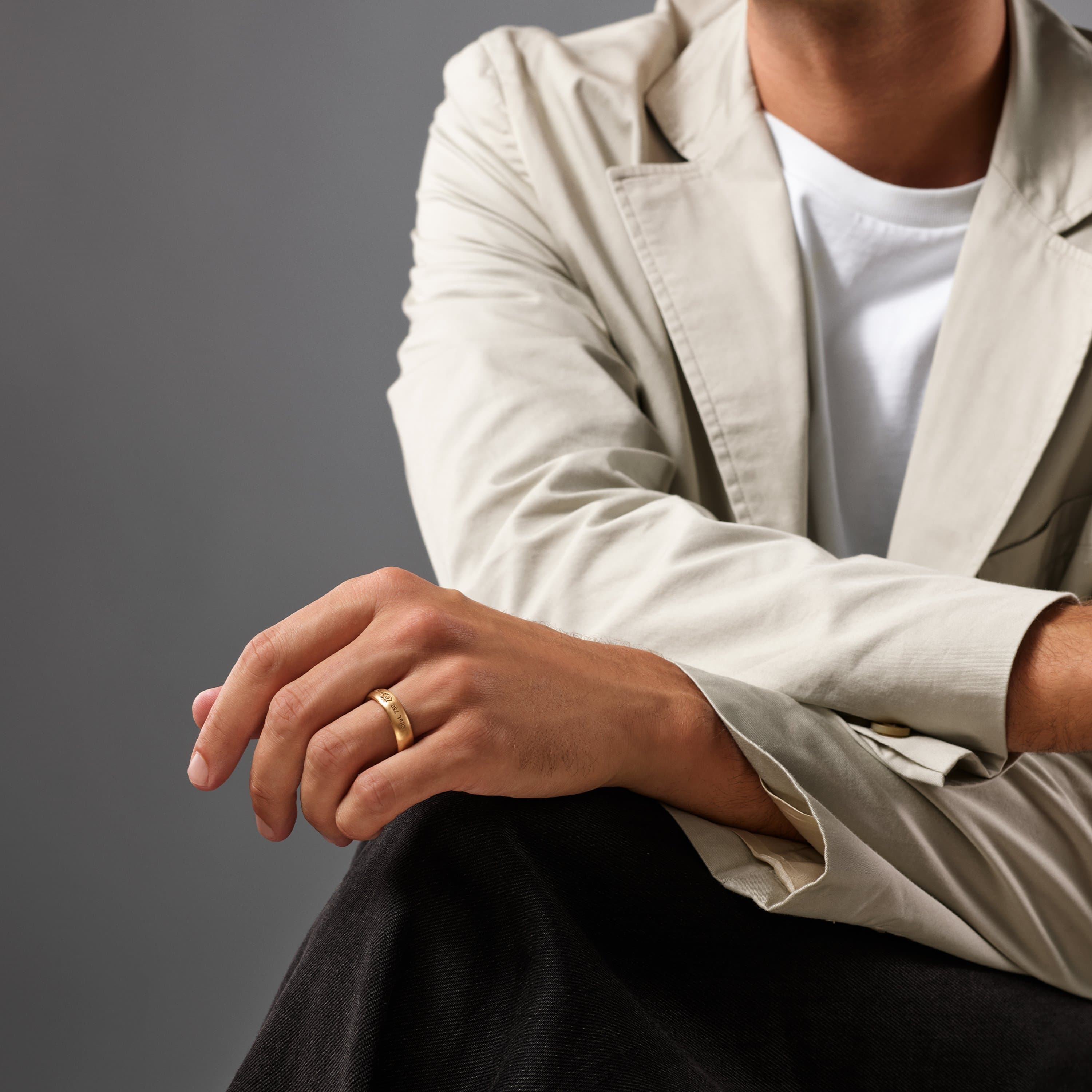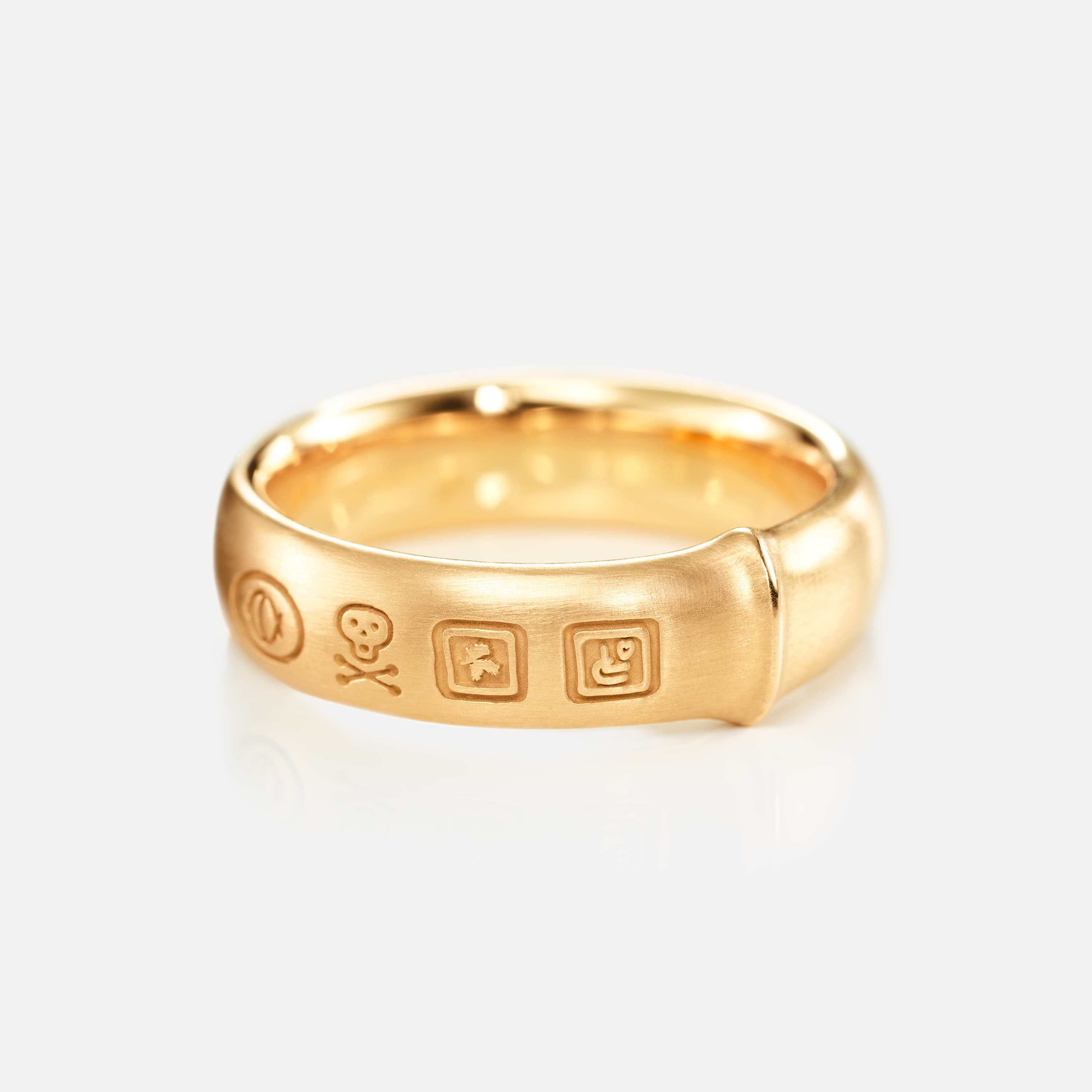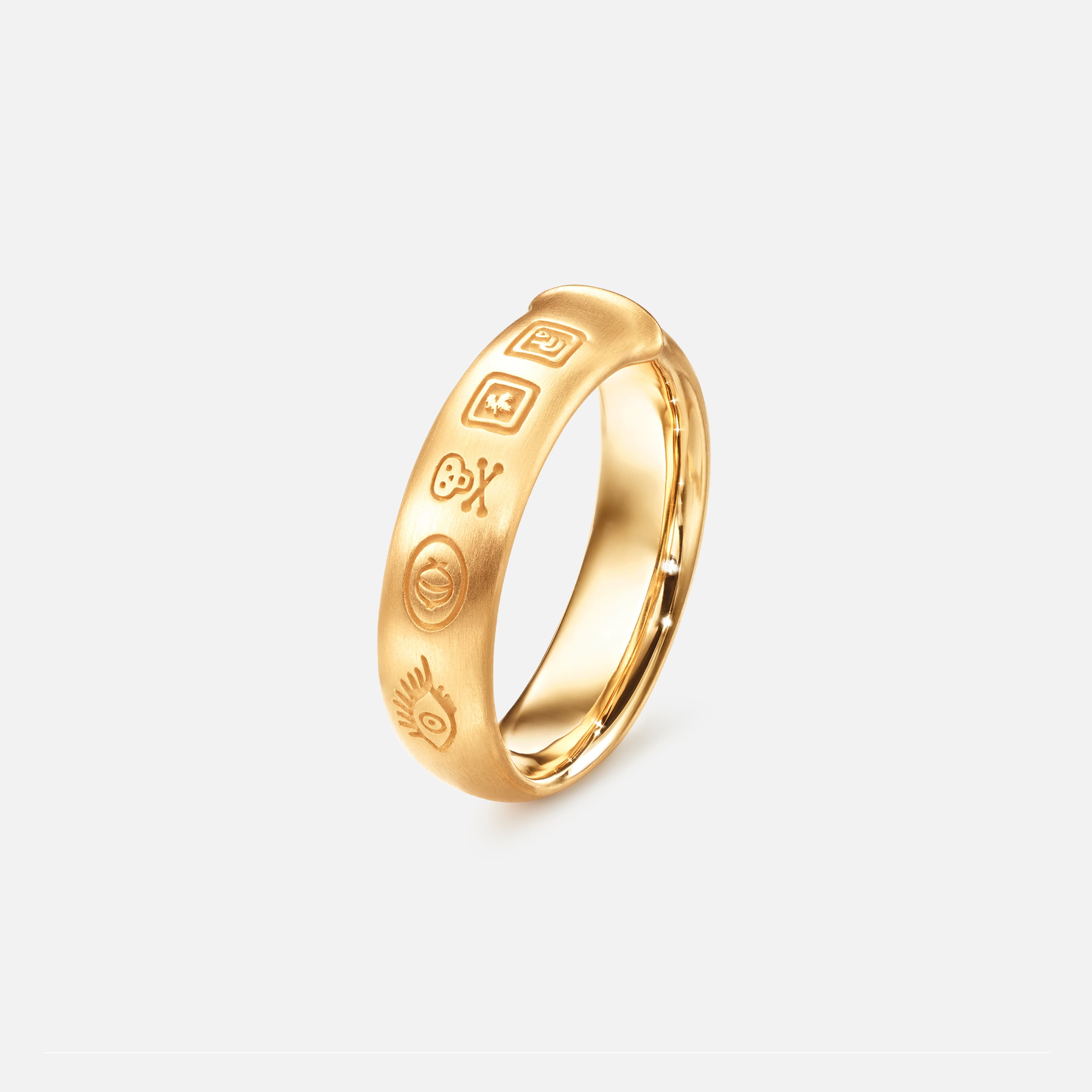 Designed by Charlotte Lynggaard, the Julius ring is crafted from 18 karat yellow gold and is adorned with five stamps symbolic to the Lynggaard family. Master goldsmiths hand-brush the surfaces to achieve a textured finish. Part of the Julius Collection.