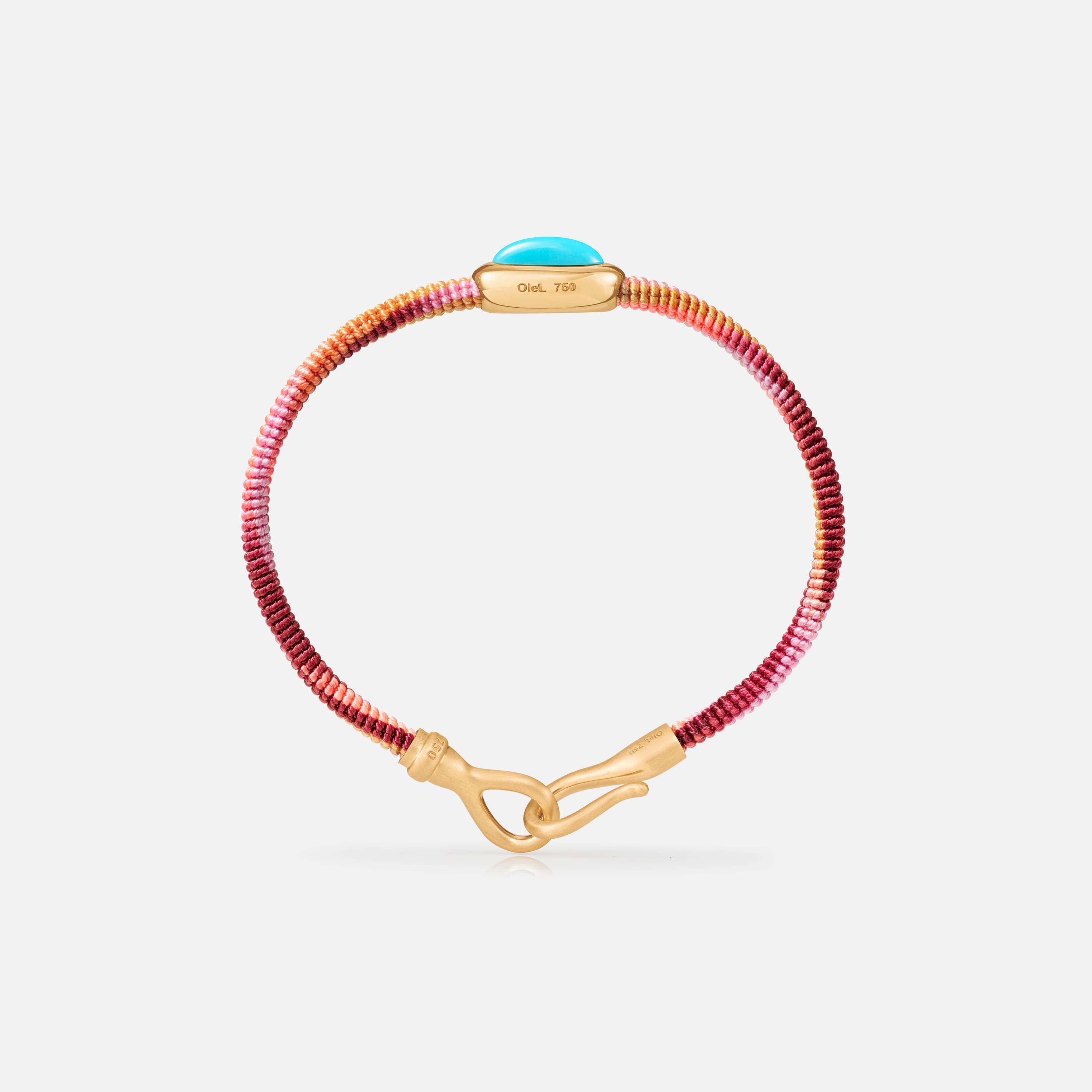 Designed by Charlotte Lynggaard, the Life Berry bracelet with turquoise charm is hand-knotted using 7 strings, each one woven from 6 hand-dyed threads. The brand-stamped hook fastening is hand-crafted by master goldsmiths from 18 karat, brushed yellow gold. The 12x6x4 mm turquoise is set in 18 karat, polished yellow gold. The bracelet measures 4,5 mm in width and is available in lengths of 15, 16, 17, 18, 19, 20, or 21 cm. Part of the Life Collection.