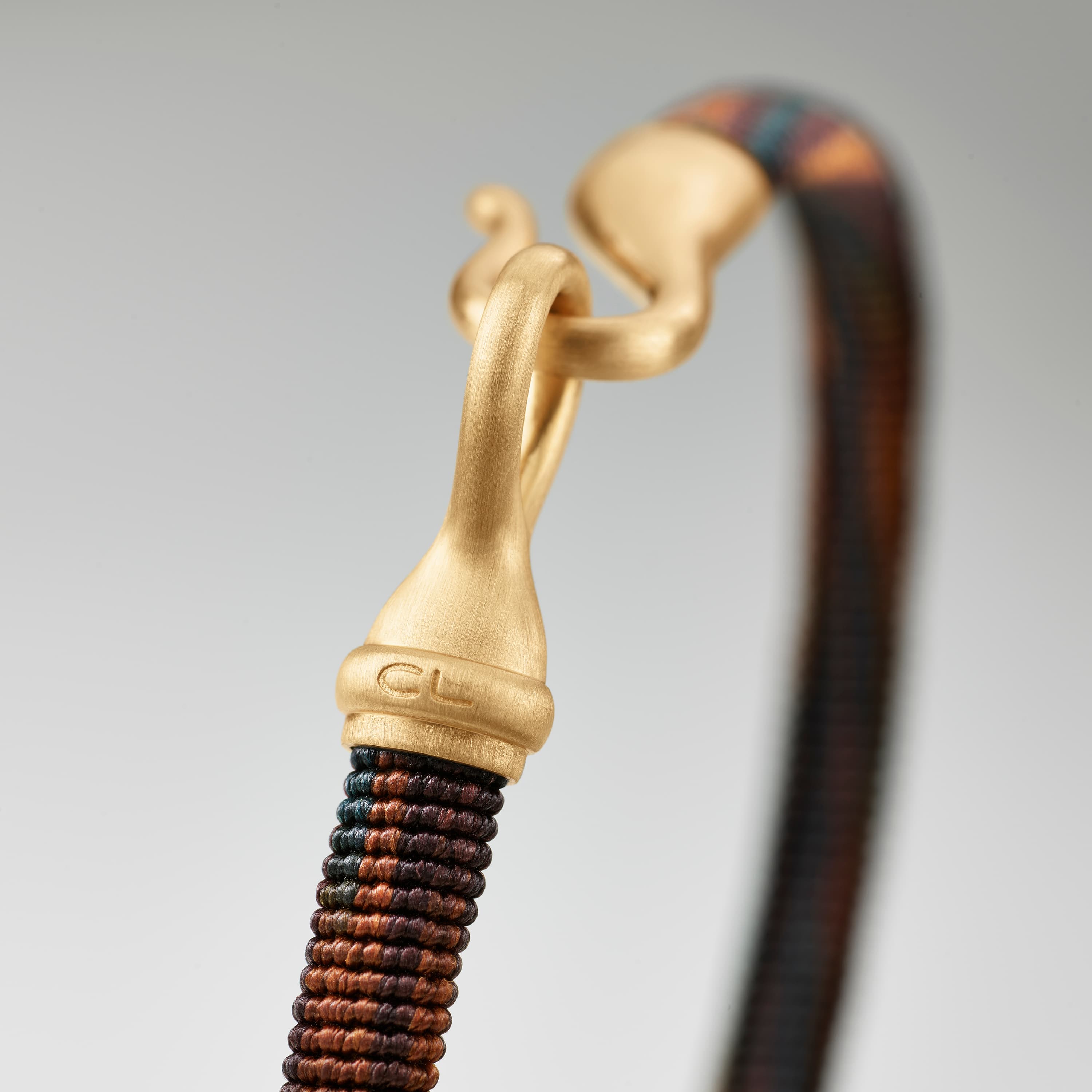 Designed by Charlotte Lynggaard, the Life Maroon bracelet with evil eye charm is hand-knotted using 11 strings, each one woven from 6 hand-dyed threads. The brand-stamped hook fastening is hand-crafted by master goldsmiths from 18 karat, brushed yellow gold. The 13x9x2,5 mm evil eye and is set in 18 karat, polished yellow gold. The bracelet measures 6 mm in width and is available in lengths of 15, 16, 17, 18, 19, 20, or 21 cm. Part of the Life Collection.