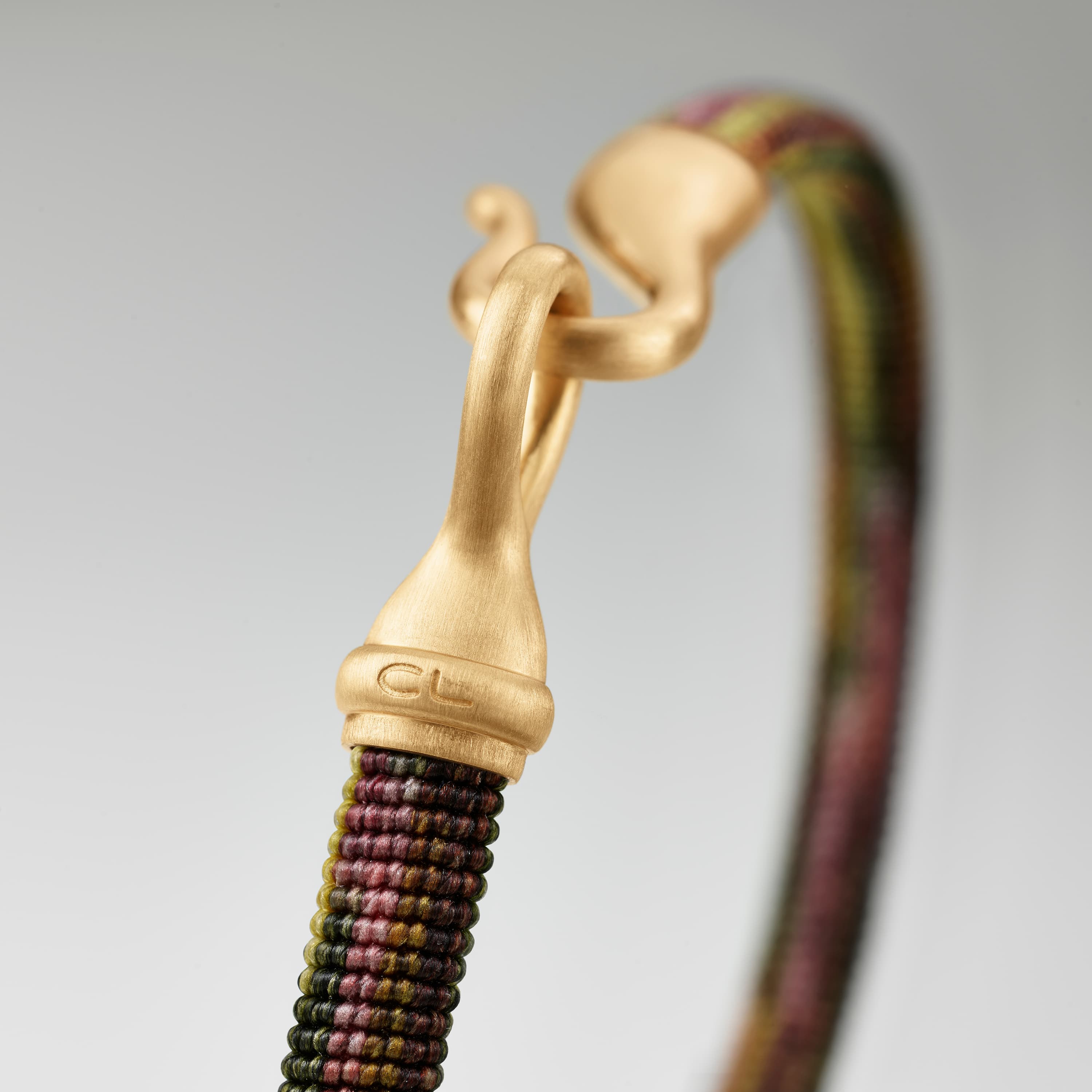 Designed by Charlotte Lynggaard, the Life Plum bracelet with evil eye charm is hand-knotted using 11 strings, each one woven from 6 hand-dyed threads. The brand-stamped hook fastening is hand-crafted by master goldsmiths from 18 karat, brushed yellow gold. The 13x9x2,5 mm evil eye and is set in 18 karat, polished yellow gold. The bracelet measures 6 mm in width and is available in lengths of 15, 16, 17, 18, 19, 20, or 21 cm. Part of the Life Collection.