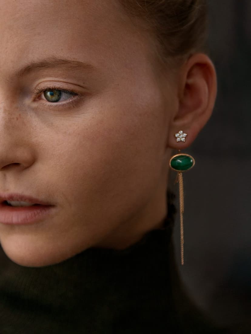 Designed by Charlotte Lynggaard, the Lotus earring pendants small are crafted from 18 karat yellow gold with malachite cabochons. The visible gold surfaces are hand-satinised by master goldsmiths. Suitable for use with stud earrings. Extra eyelets on the backs for hanging pendants with hook fastenings. Sold as a pair. Part of the Lotus Collection. Measures: L9 x W13 mm.
