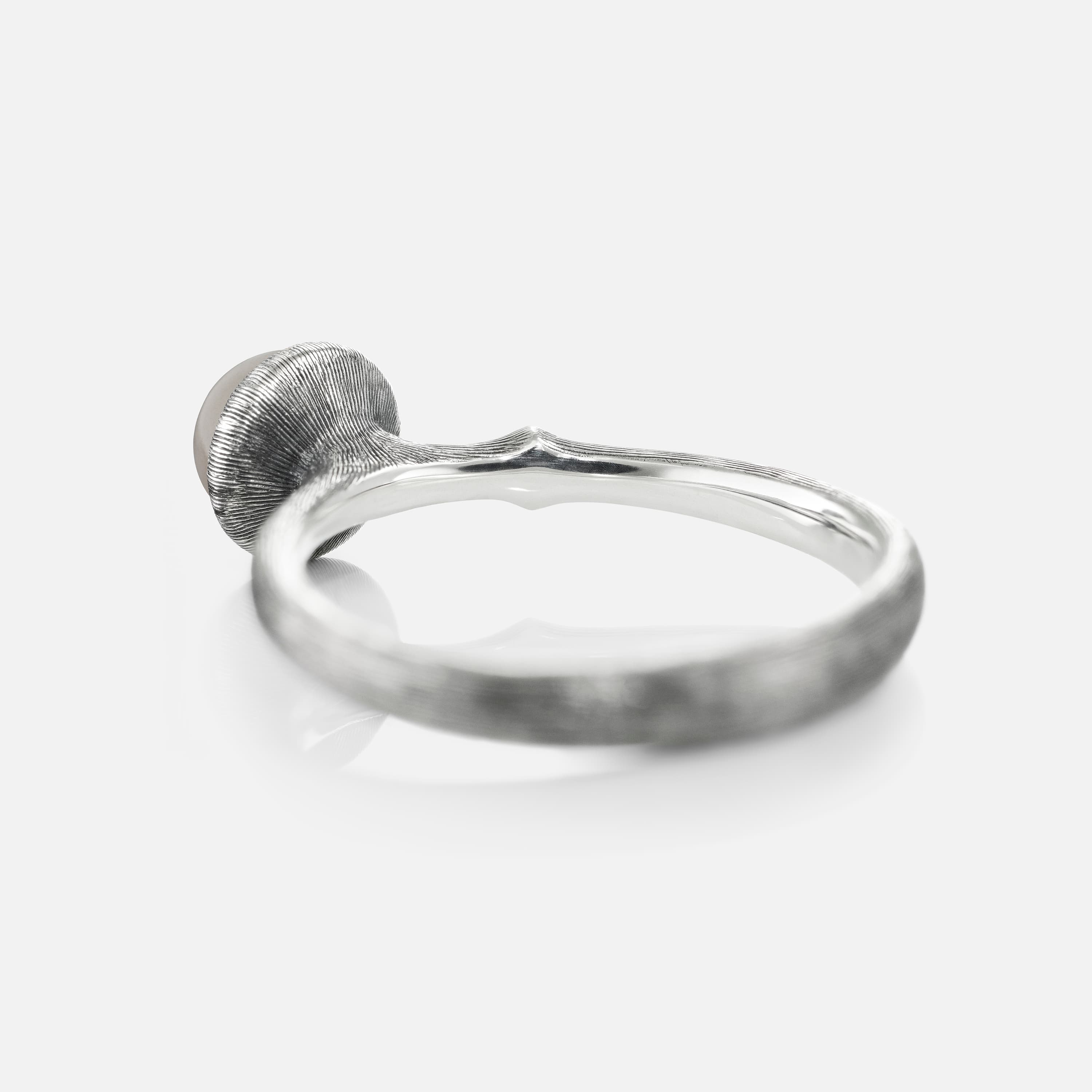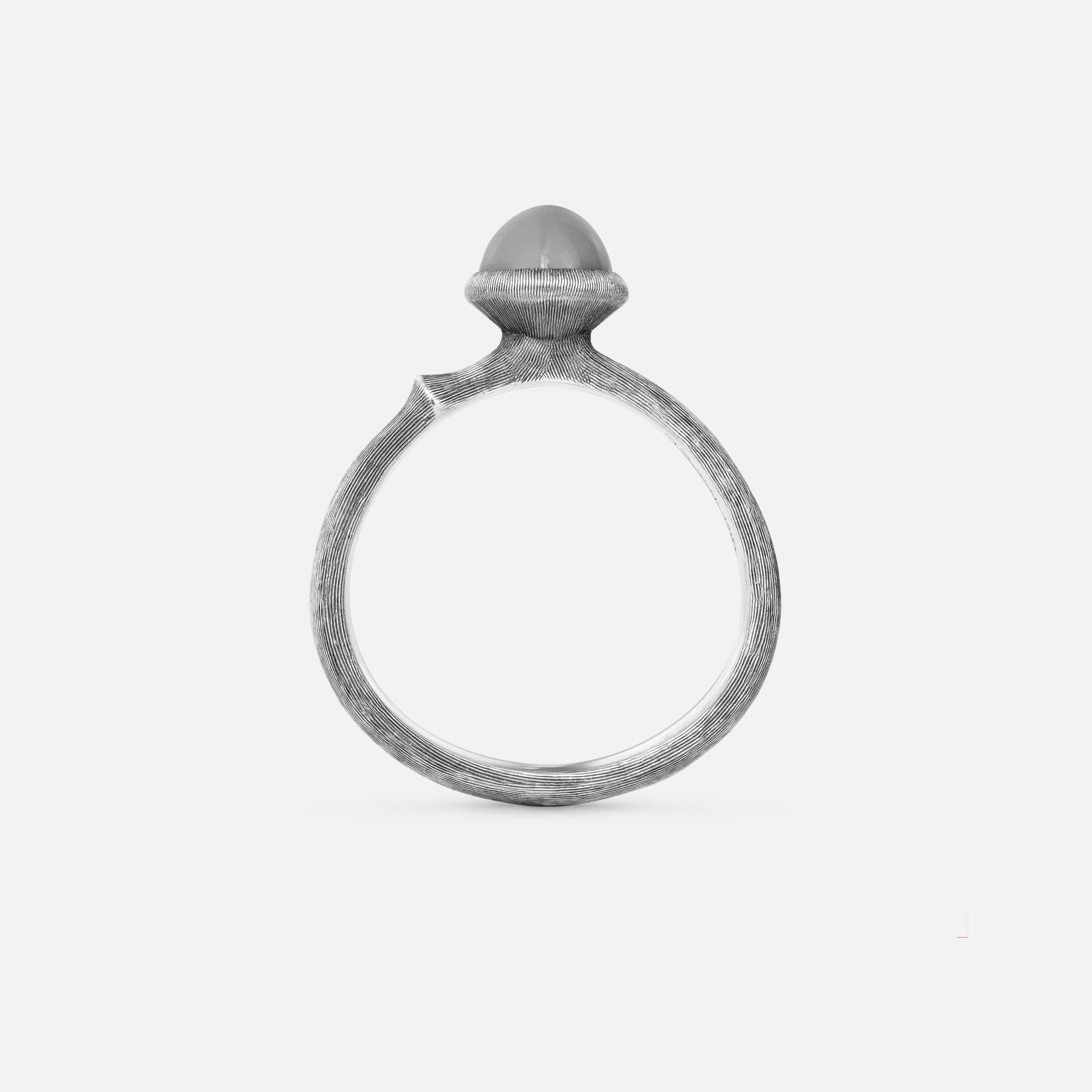 Designed by Charlotte Lynggaard, the Lotus ring, size 0, is crafted from oxidized Sterling silver and is set with a grey moonstone cabochon. Handcrafted by master goldsmiths, the visible silver surface is hand-satinised, whilst the inside of the ring has a polished finish. Part of the Lotus Collection.