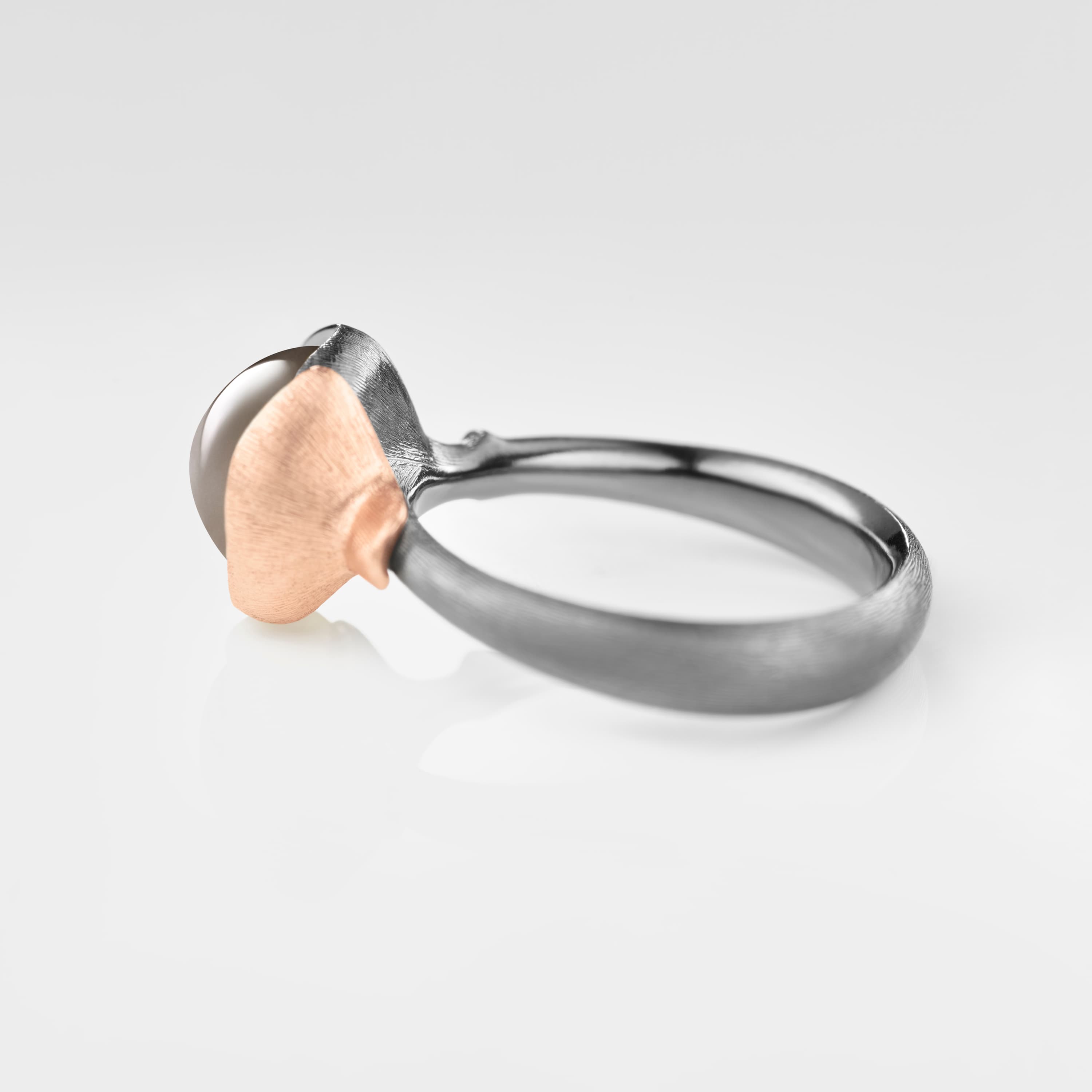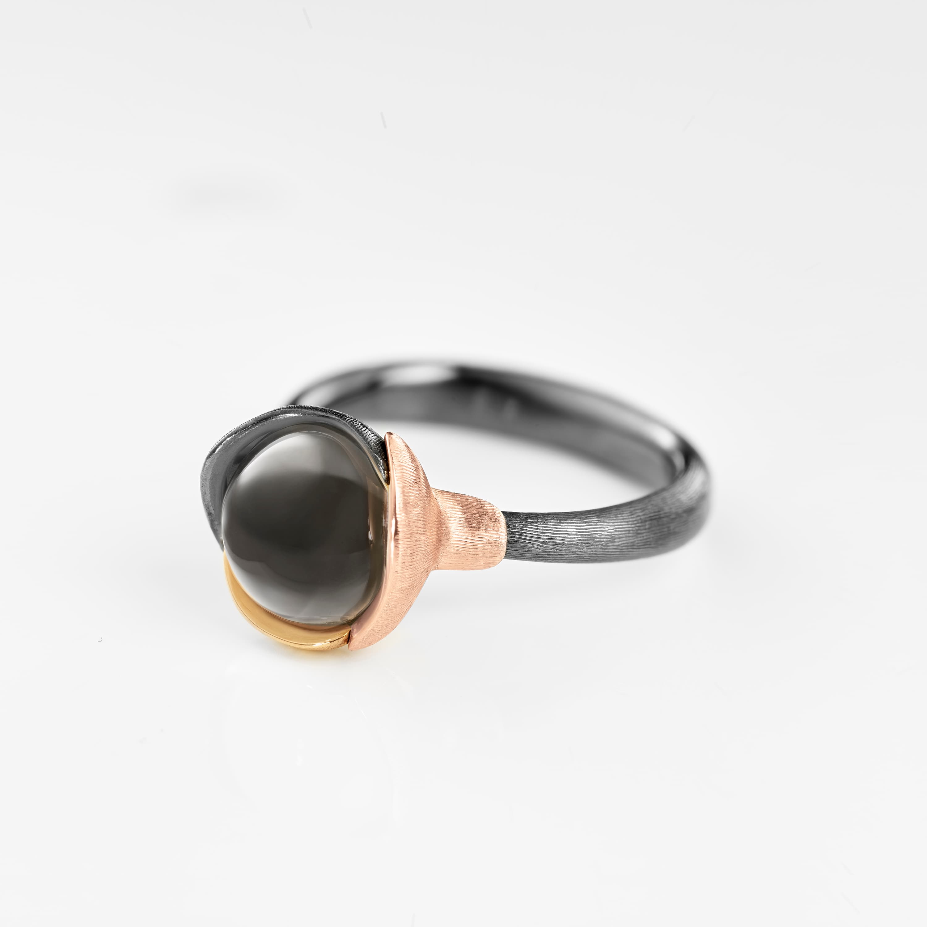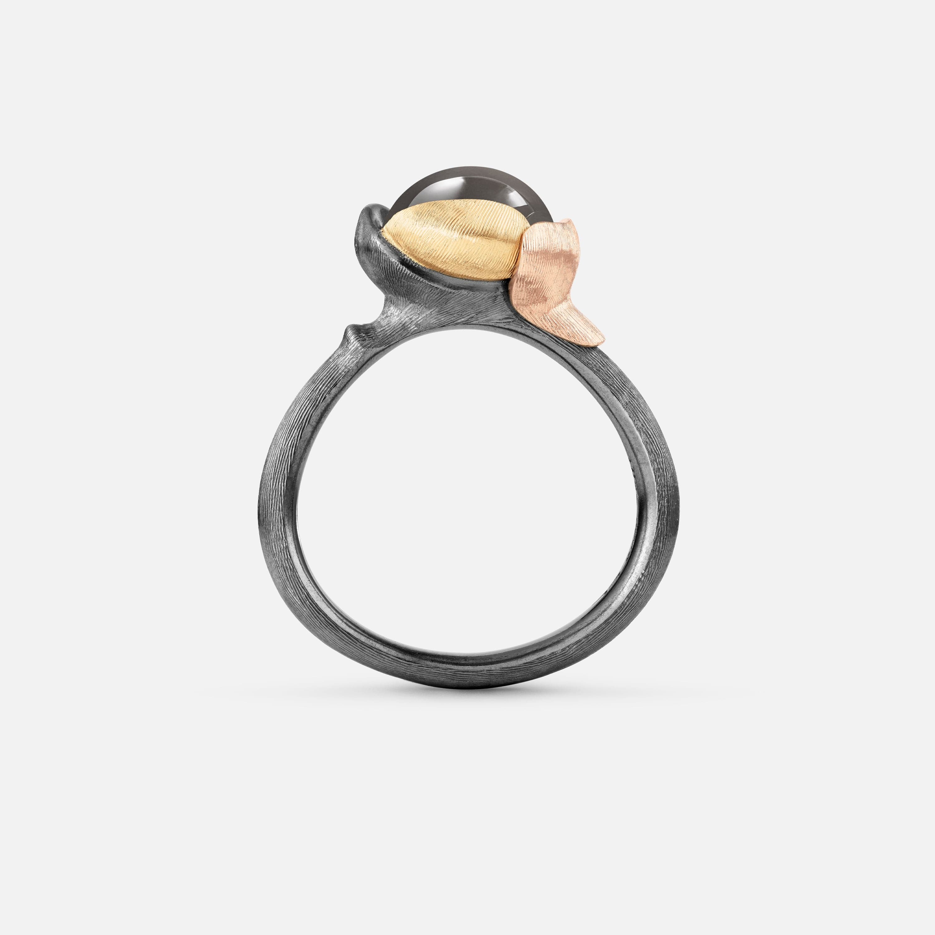 Designed by Charlotte Lynggaard, the Lotus ring, size 1, is crafted from 18 karat yellow and rose gold and oxidized Sterling silver, with a grey moonstone cabochon. Handcrafted by master goldsmiths, the precious metal surfaces are hand-satinised, whilst the inside of the ring has a polished finish. Part of the Lotus Collection.