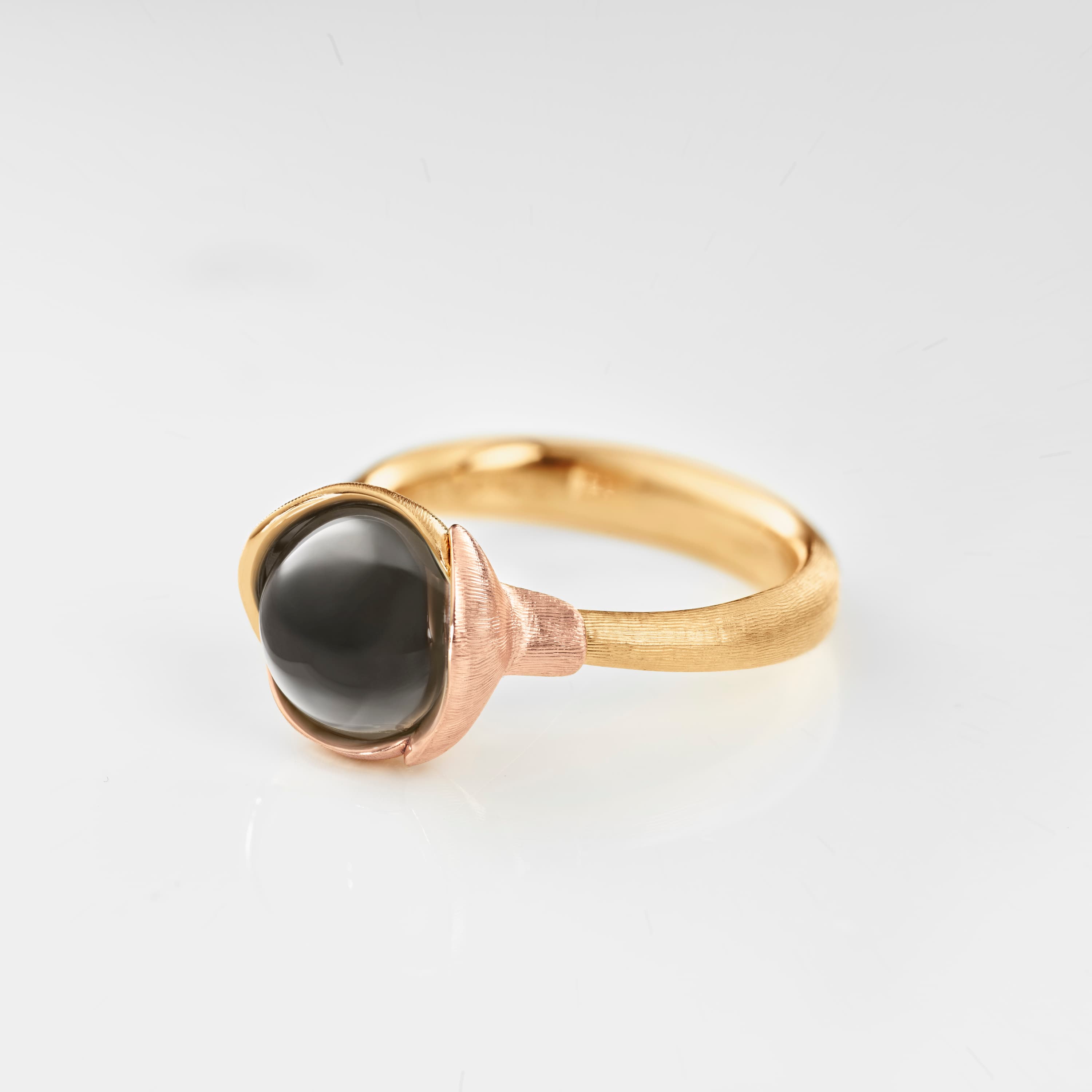 Designed by Charlotte Lynggaard, the Lotus ring, size 1, is crafted from 18 karat yellow and rose gold with a grey moonstone cabochon. Handcrafted by master goldsmiths, the visible gold surfaces are hand-satinised, whilst the inside of the ring has a polished finish. Part of the Lotus Collection. Please note: As gemstones are natural materials, each stone is absolutely unique. They will vary in colour and have individual, unique inclusions and features. Web-images of stones are only representatives of the unique stone you will receive when ordering the product, not the exact stone.