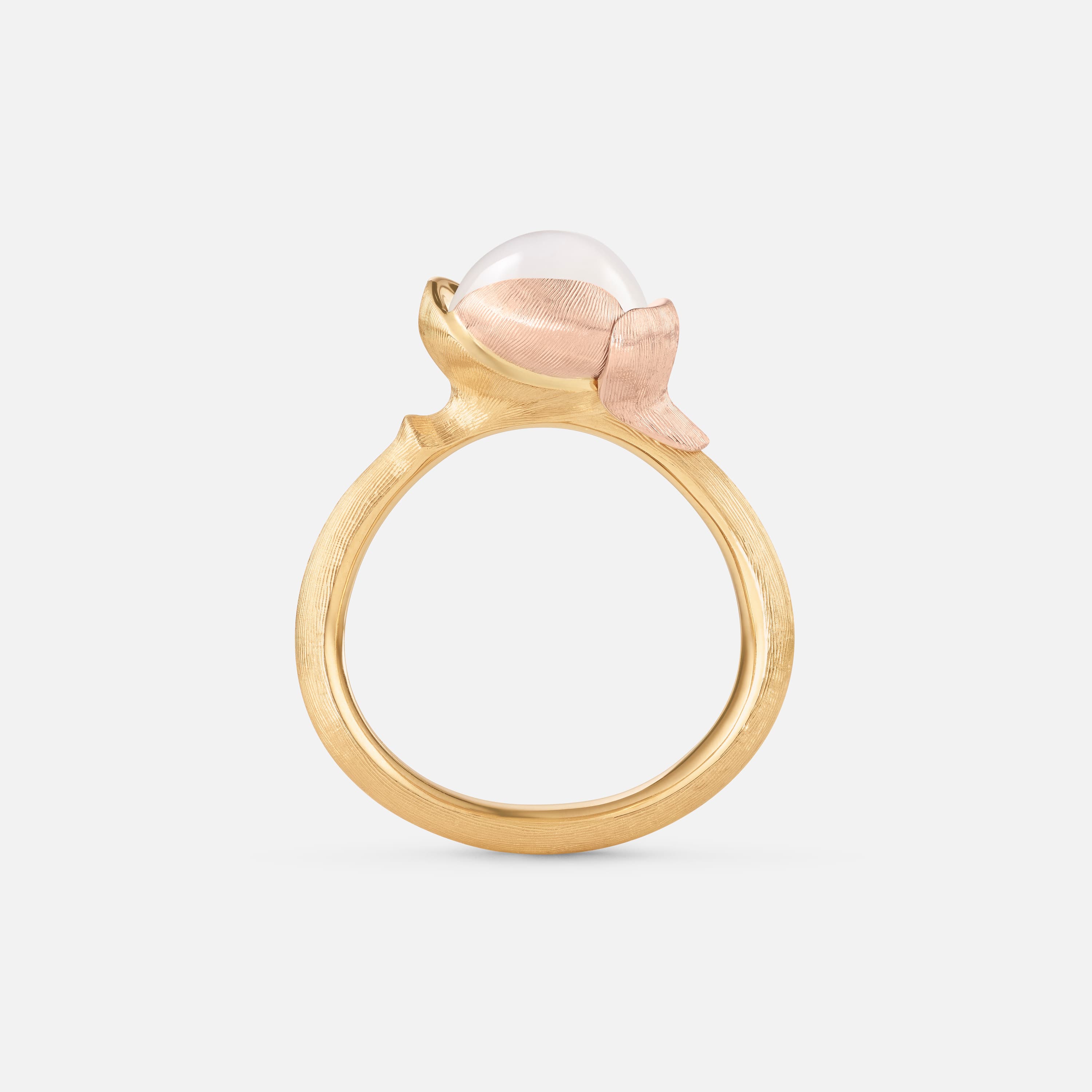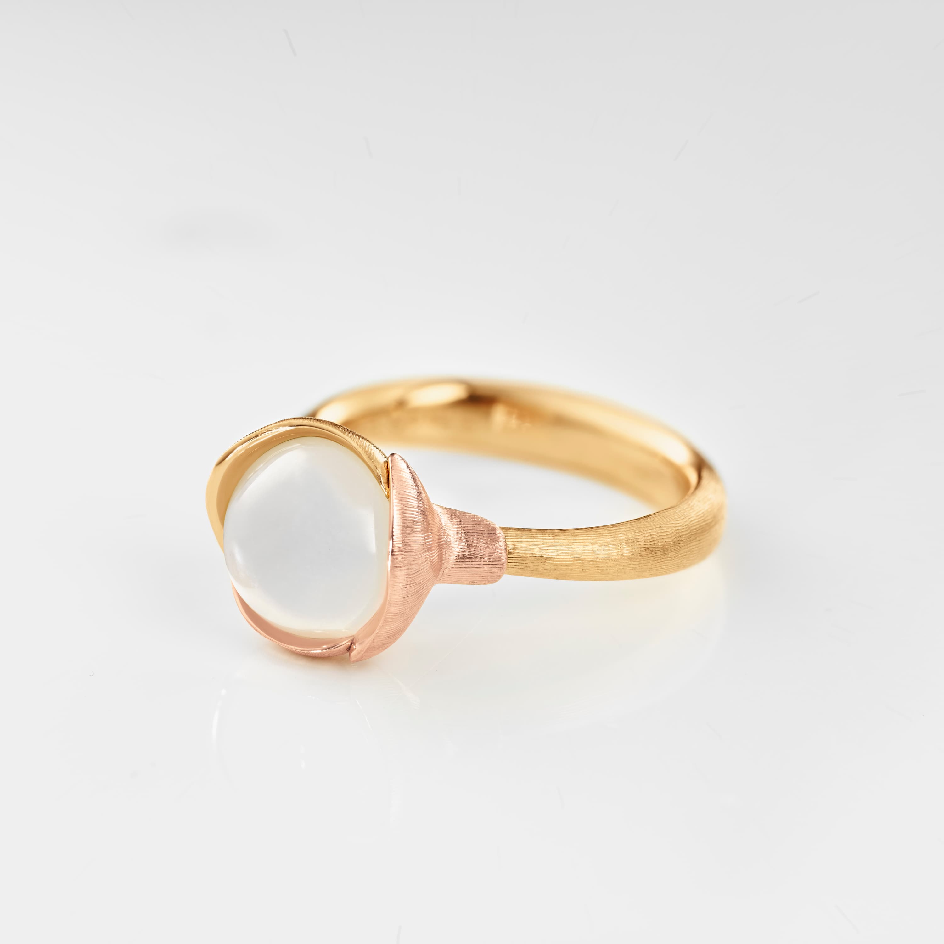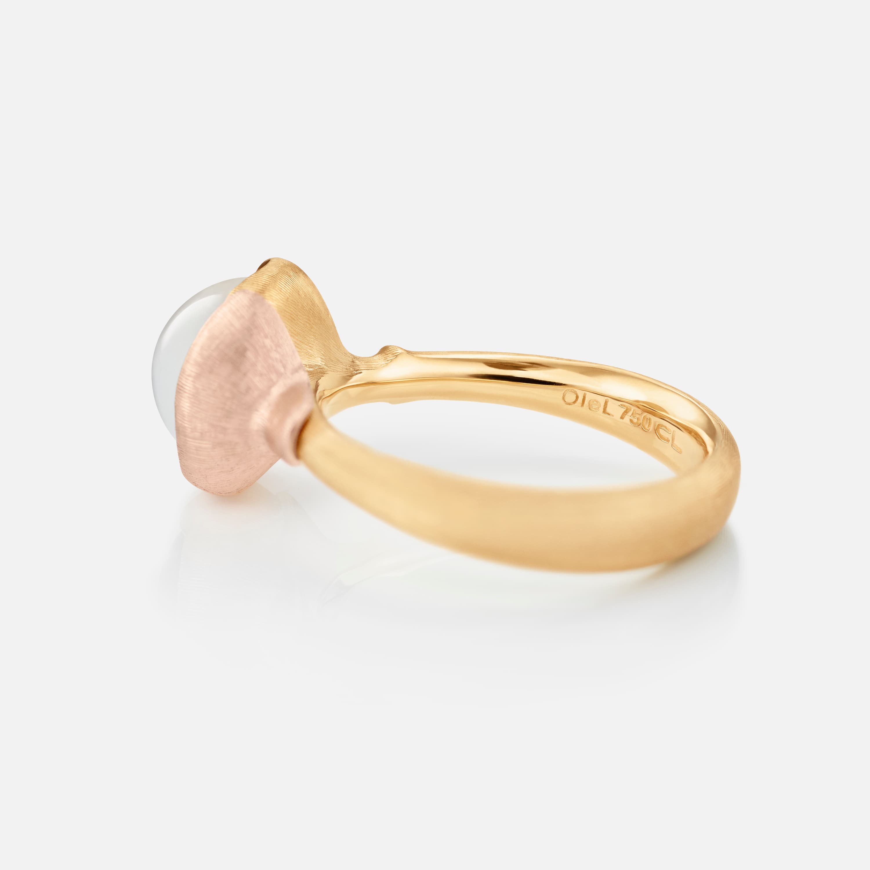 Designed by Charlotte Lynggaard, the Lotus ring, size 1, is crafted from 18 karat yellow and rose gold with a white moonstone cabochon. Handcrafted by master goldsmiths, the visible gold surfaces are hand-satinised, whilst the inside of the ring has a polished finish. Part of the Lotus Collection. Please note: As gemstones are natural materials, each stone is absolutely unique. They will vary in colour and have individual, unique inclusions and features. Web-images of stones are only representatives of the unique stone you will receive when ordering the product, not the exact stone.