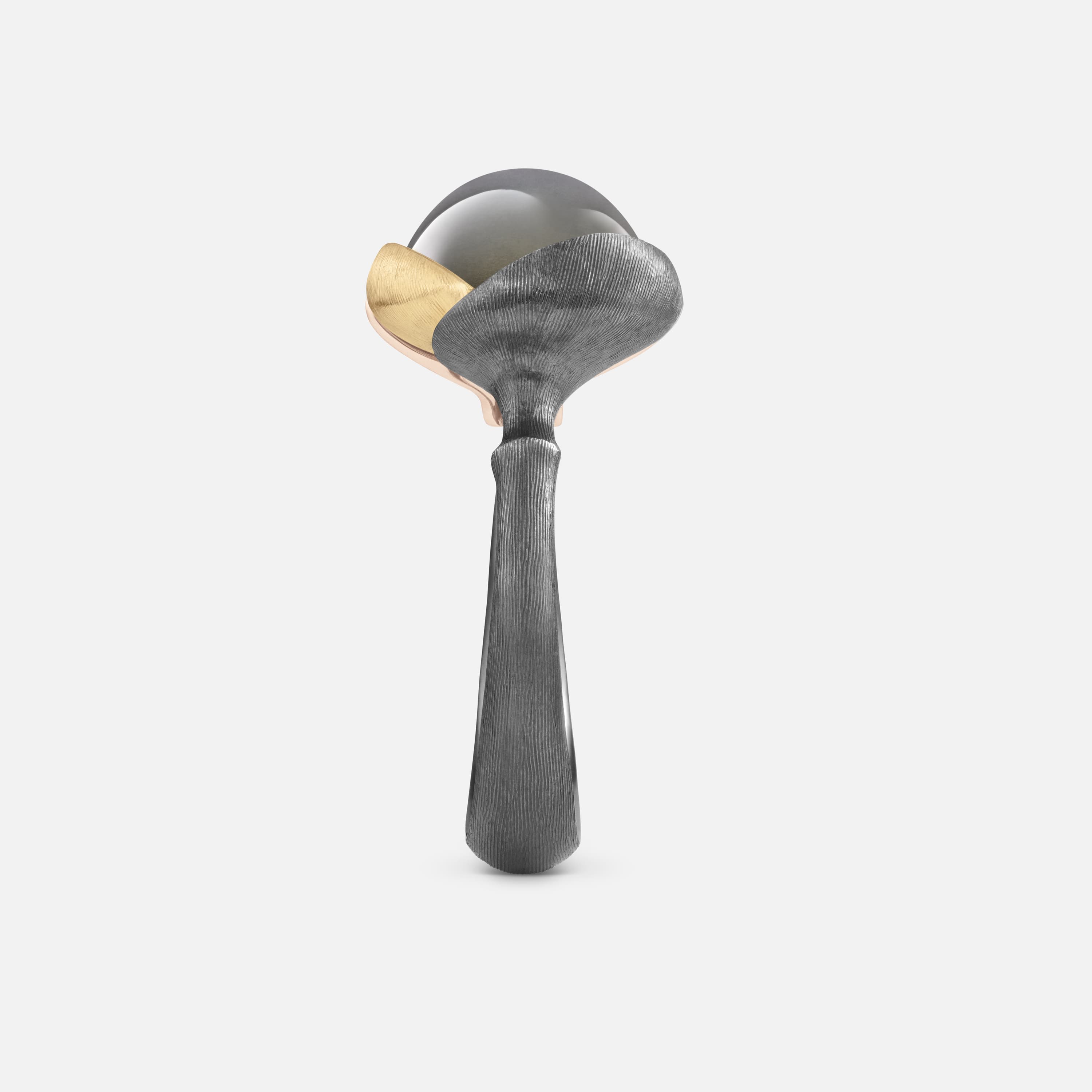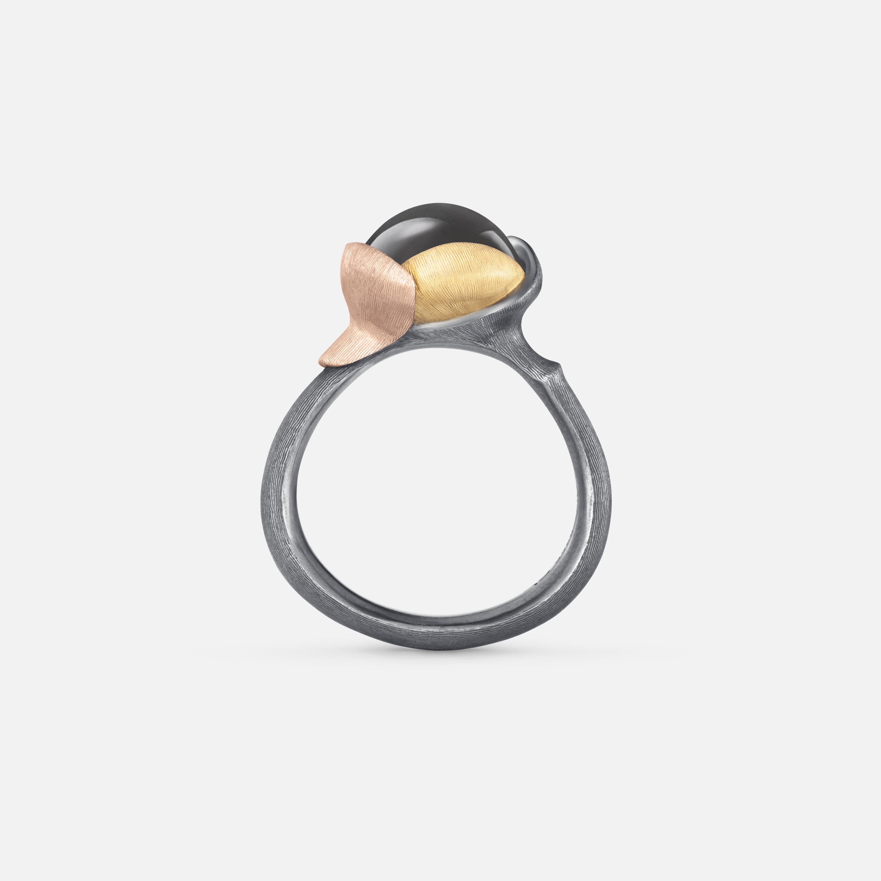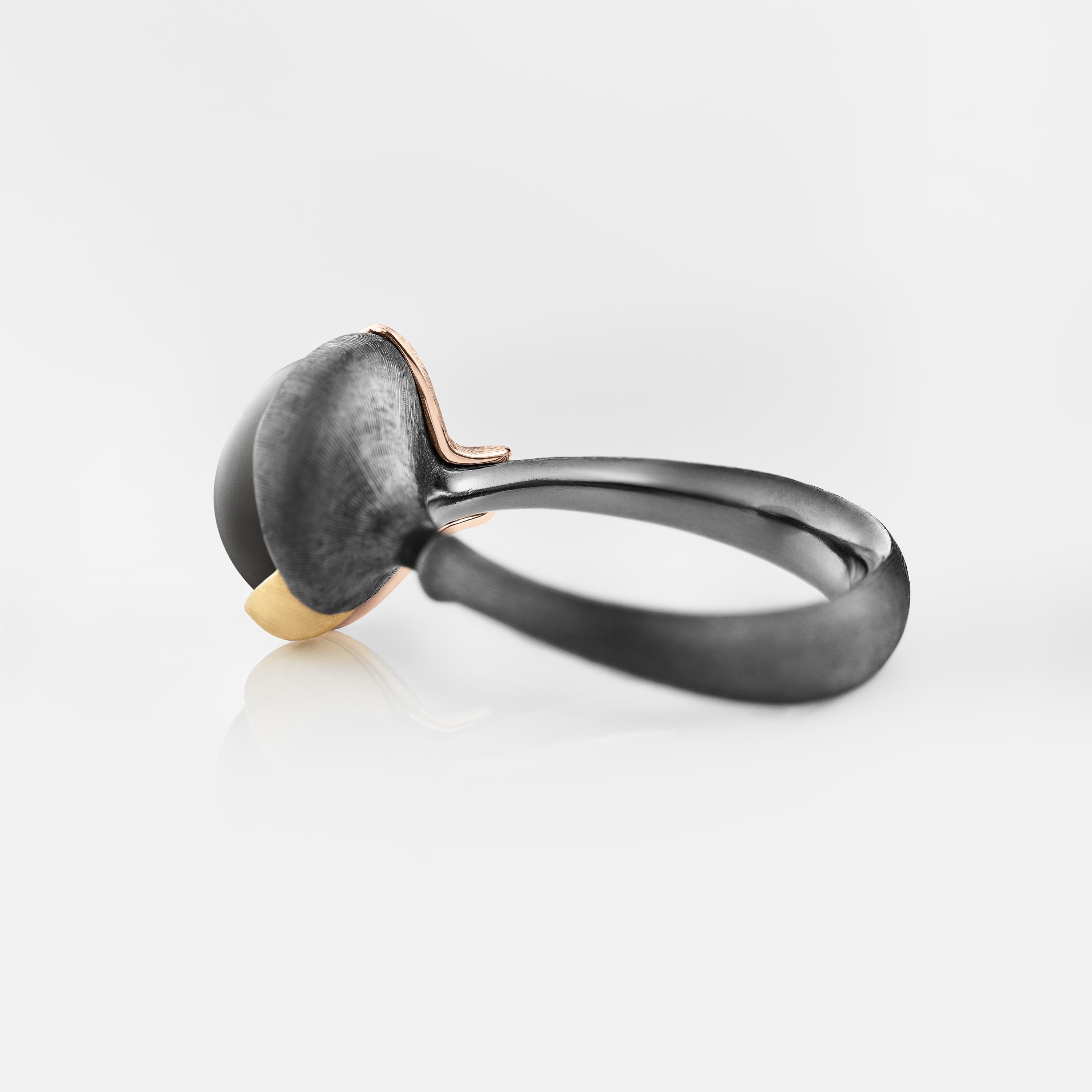 Designed by Charlotte Lynggaard, the Lotus ring, size 2, is crafted from 18 karat yellow and rose gold and oxidized Sterling silver, with a grey moonstone cabochon. Handcrafted by master goldsmiths, the precious metal surfaces are hand-satinised, whilst the inside of the ring has a polished finish. Part of the Lotus Collection.