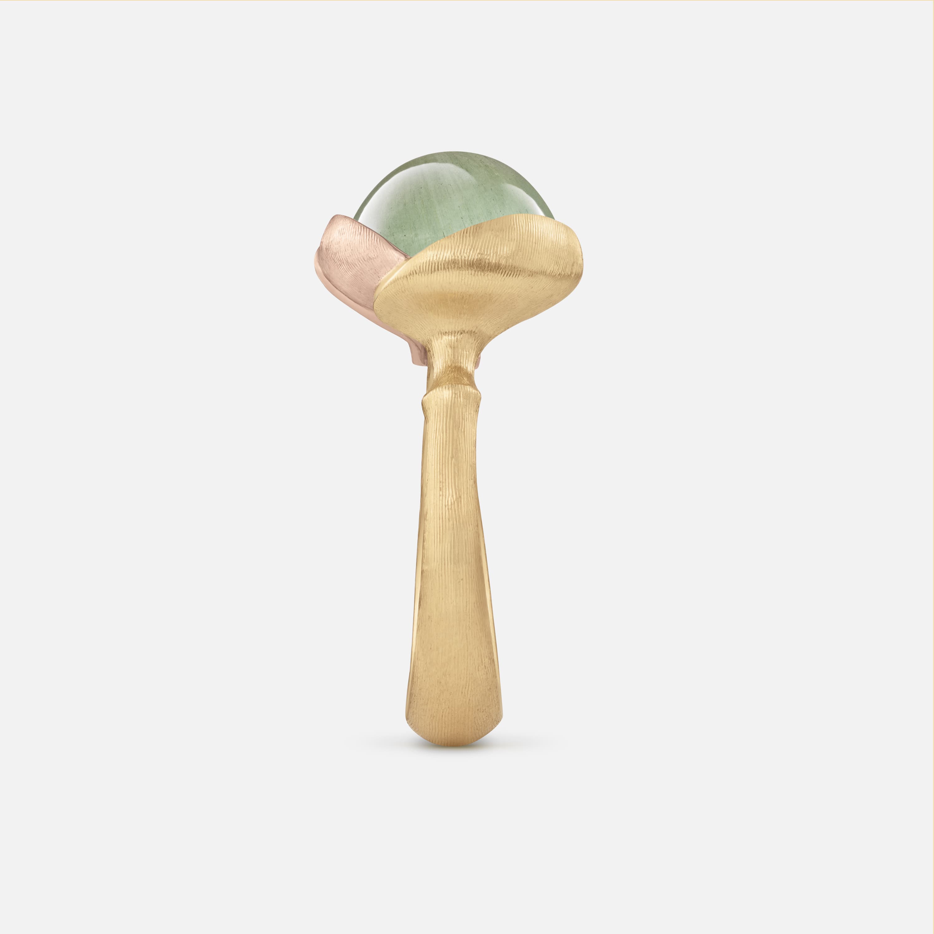 Designed by Charlotte Lynggaard, the Lotus ring size 2 is crafted from 18 karat yellow and rose gold with an aquamarine cabochon. Handcrafted by master goldsmiths, the visible gold surfaces are hand-satinised, whilst the inside of the ring has a polished finish. Part of the Lotus Collection.