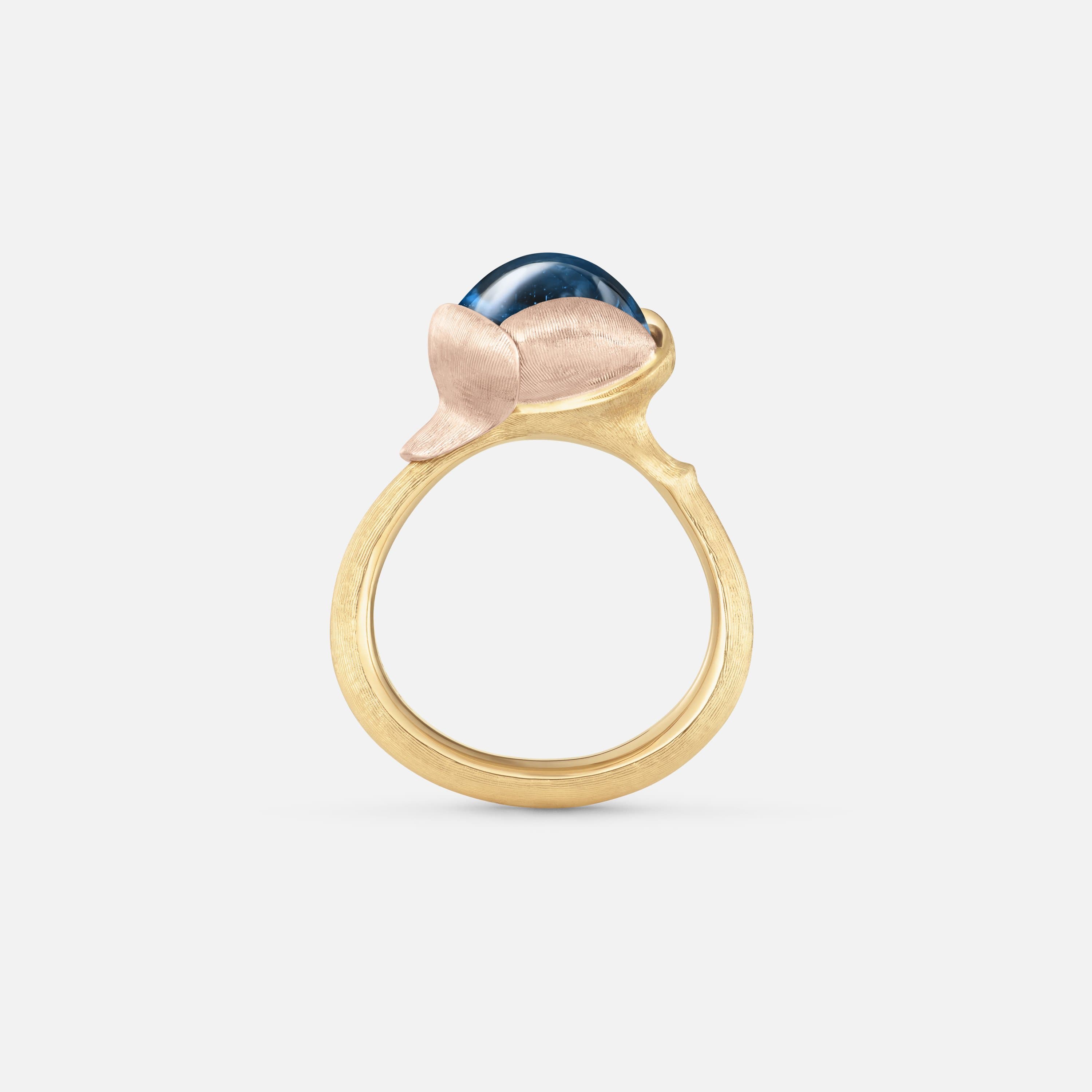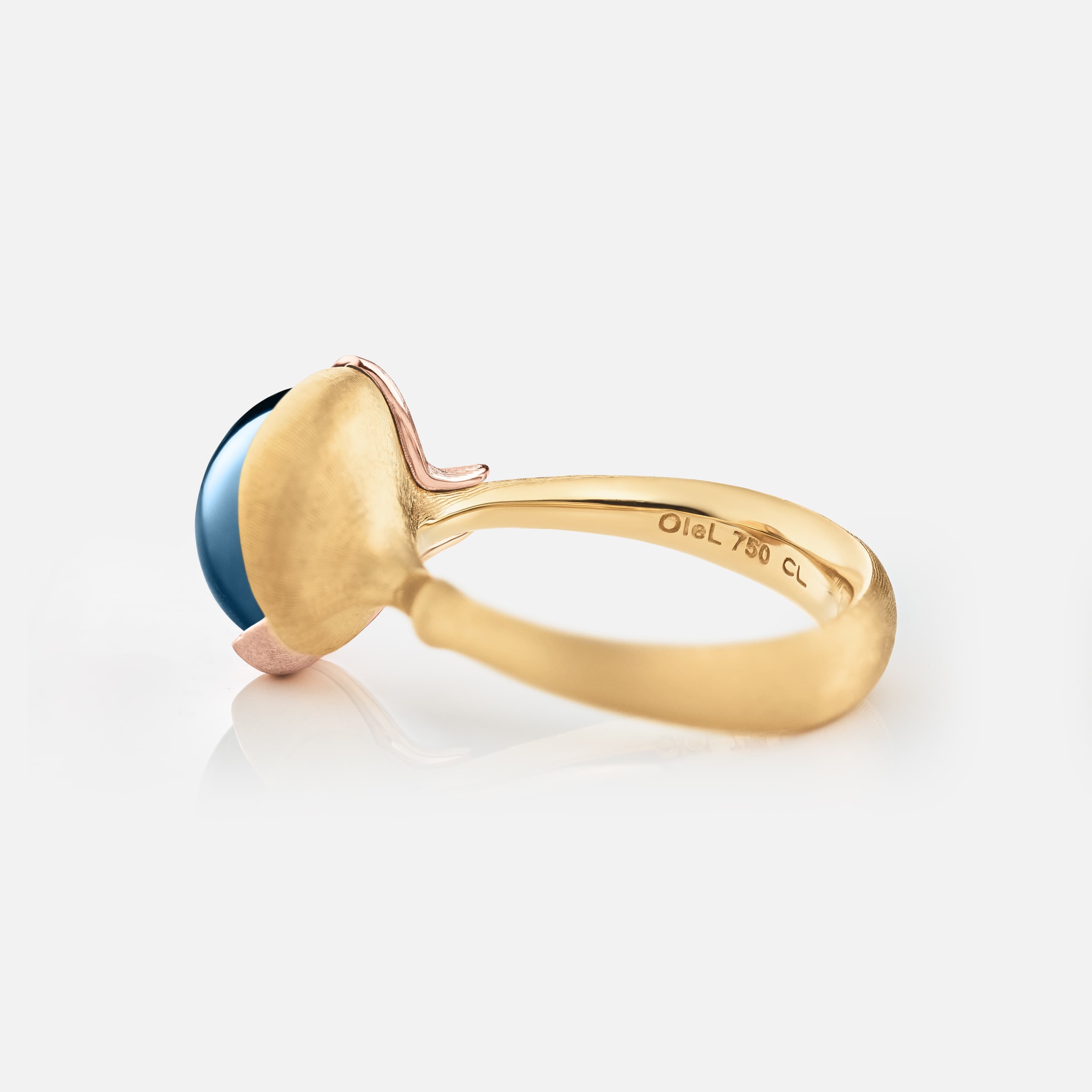 Designed by Charlotte Lynggaard, the Lotus ring, size 2, is crafted from 18 karat yellow and rose gold with a London blue topaz cabochon. Handcrafted by master goldsmiths, the visible gold surfaces are hand-satinised, whilst the inside of the ring has a polished finish. Part of the Lotus Collection. Please note: As gemstones are natural materials, each stone is absolutely unique. They will vary in colour and have individual, unique inclusions and features. Web-images of stones are only representatives of the unique stone you will receive when ordering the product, not the exact stone.
