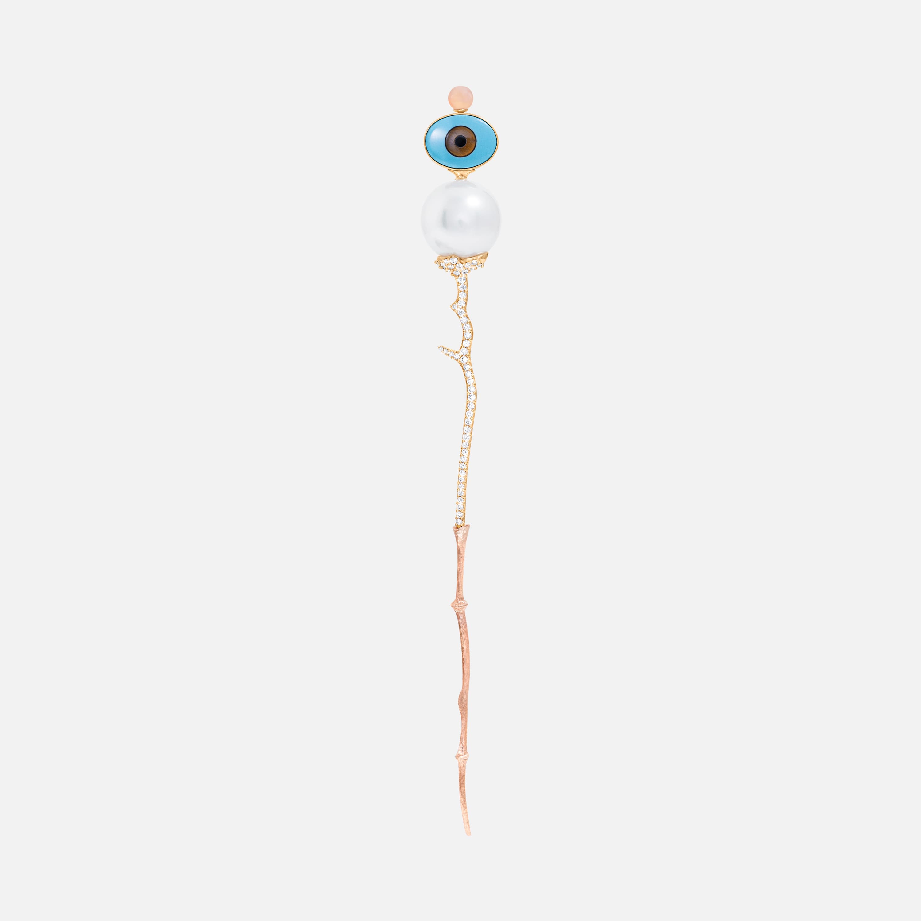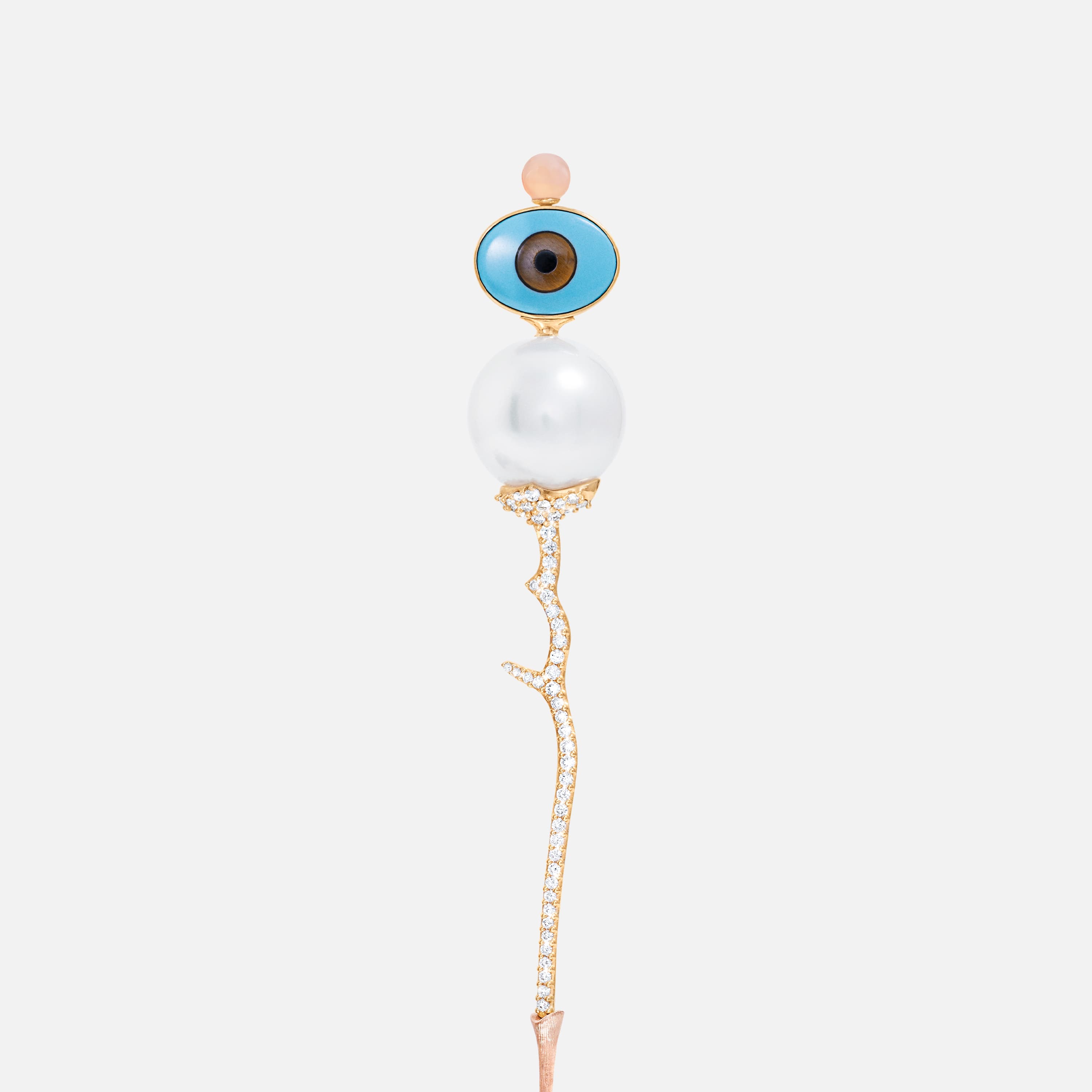 Designed by Charlotte Lynggaard, the Nature brooch is crafted from 18 karat yellow and rose gold with blush moonstone, evil eye and 52 hand-set diamonds totalling 0.35 carat TW. VS., and a 14 mm South Sea pearl that is personally approved by Charlotte Lynggaard. Handcrafted by master goldsmiths. Total length: 12.5 cm. Part of the Nature Collection.