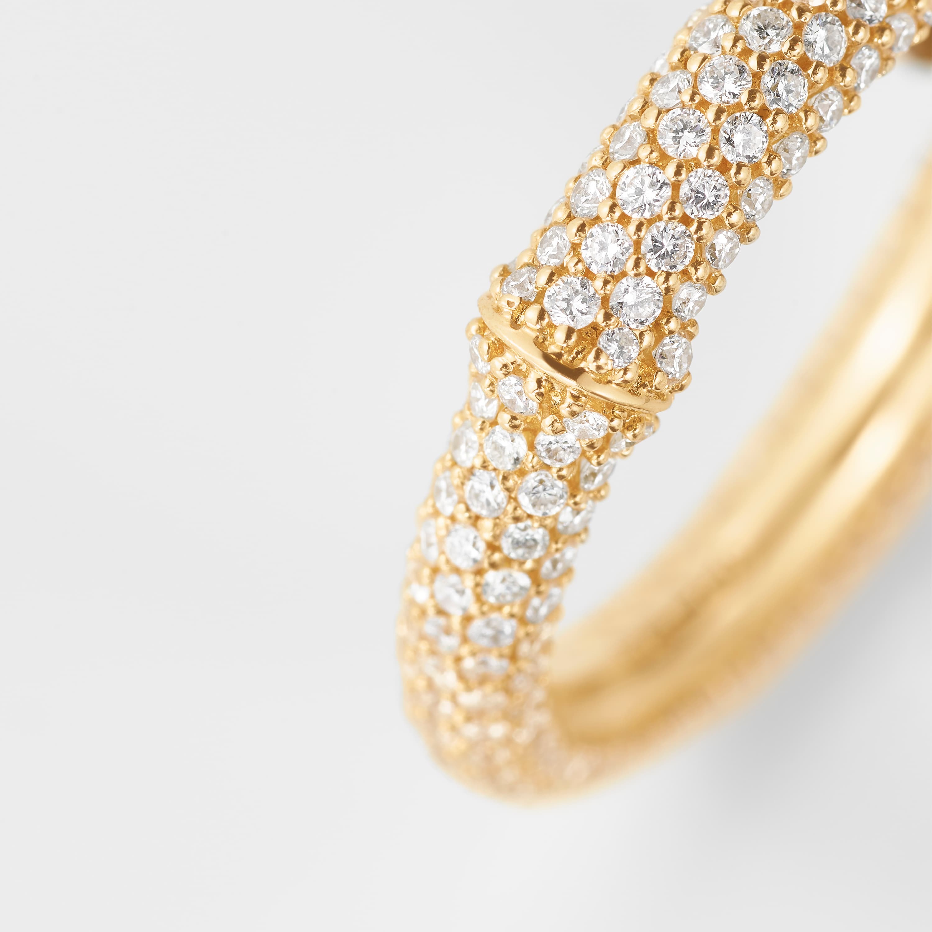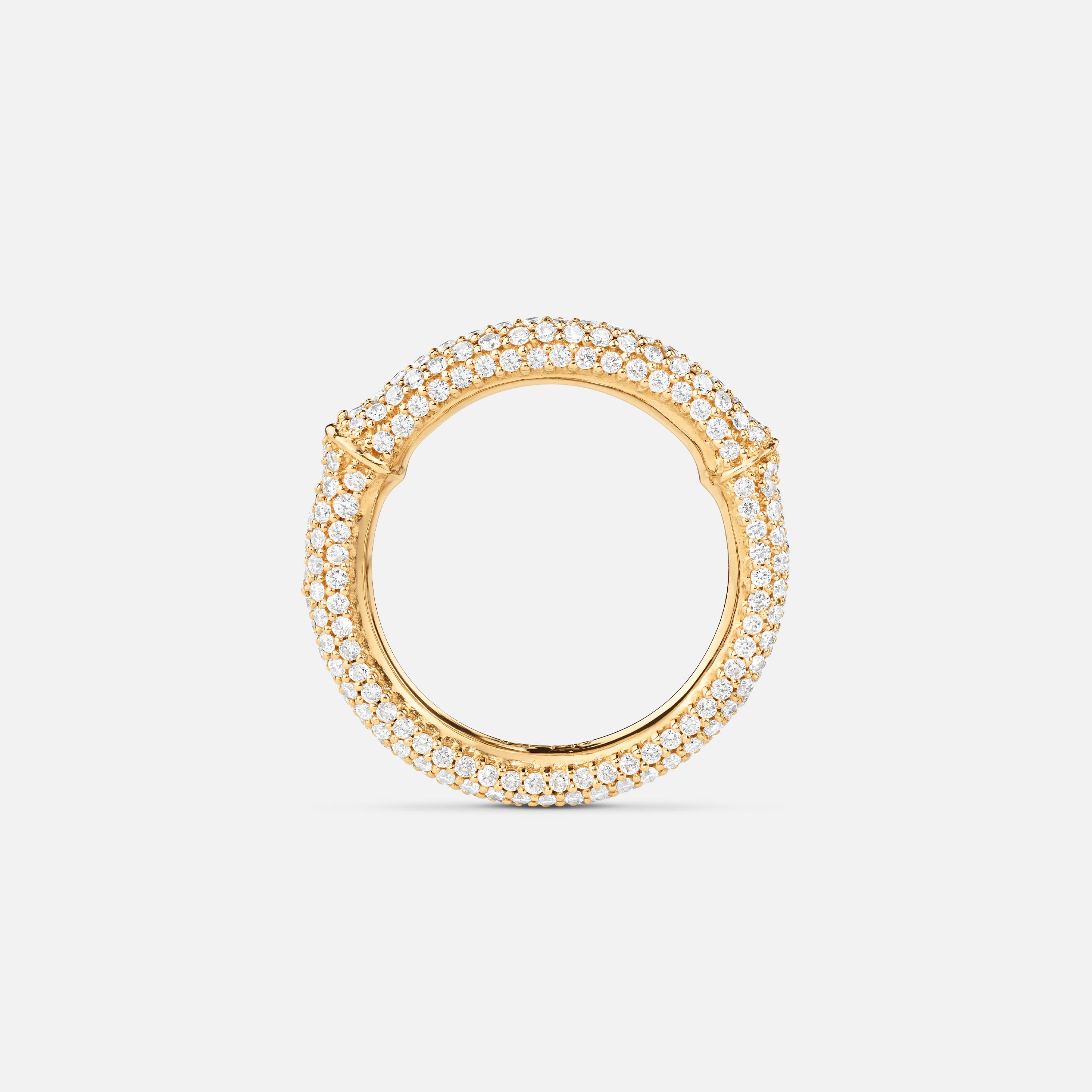Designed by Charlotte Lynggaard, the Nature ring IV is crafted from 18 karat yellow gold, with hand-set pavé diamonds totalling 1,01-1,57 carat TW. VS., depending on ring size. The gold surface inside the ring is hand-polished by master goldsmiths for a smooth finish. Part of the Nature Collection.