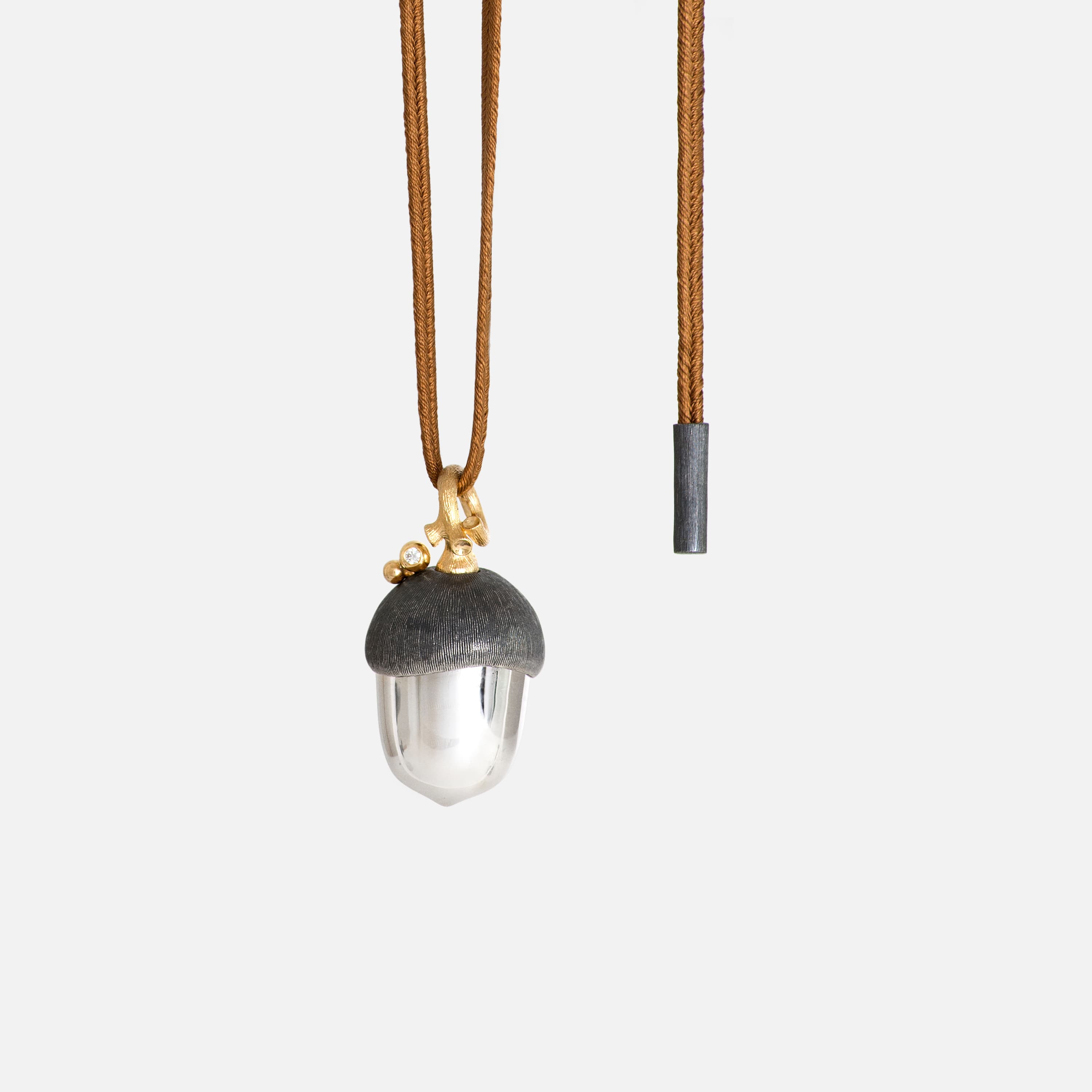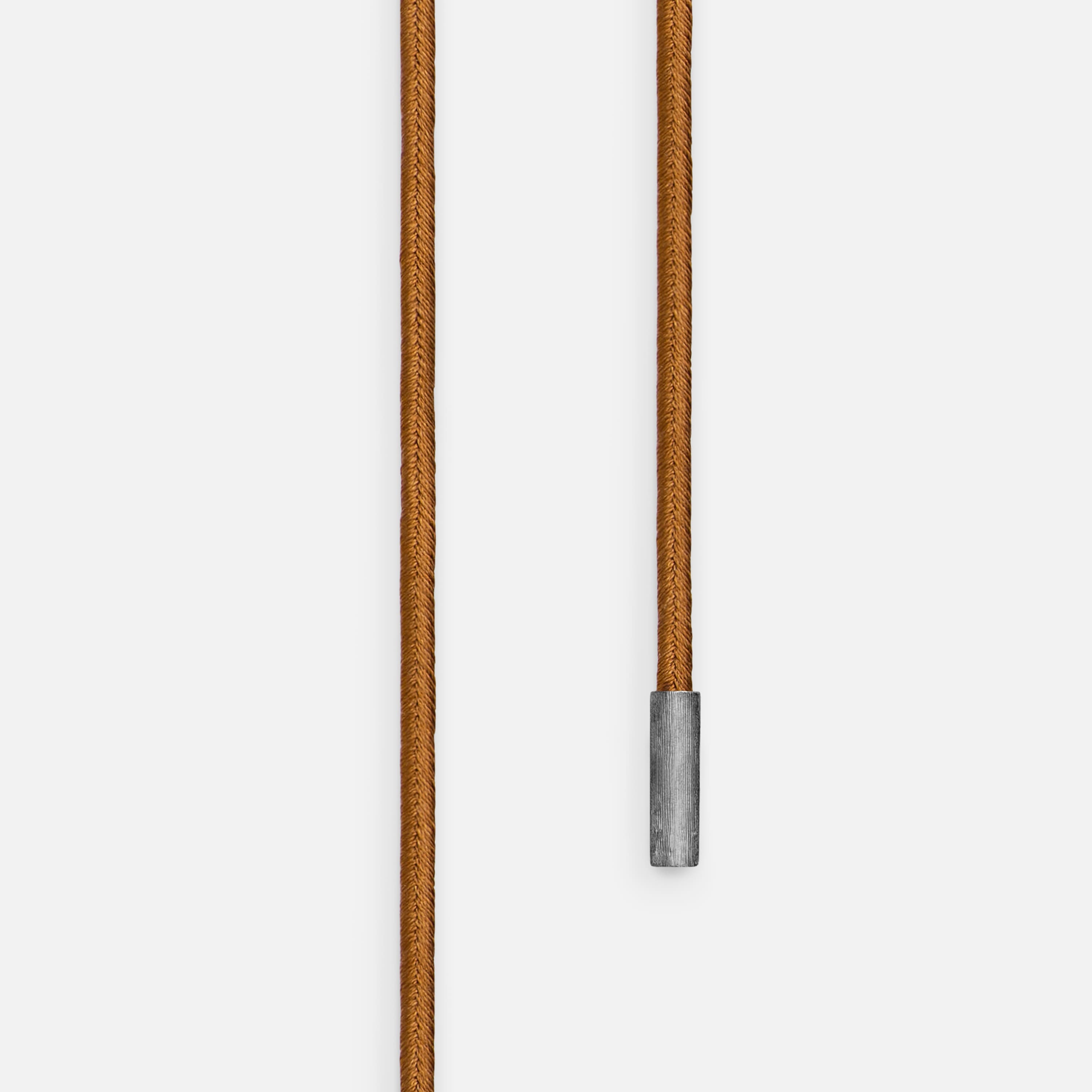 Designed by Charlotte Lynggaard, the silk String necklace in colourway camel is crafted from pure silk with oxidized, textured, Sterling silver end pieces. Total length is 130 cm. Part of the Ole Lynggaard Copenhagen Collection.