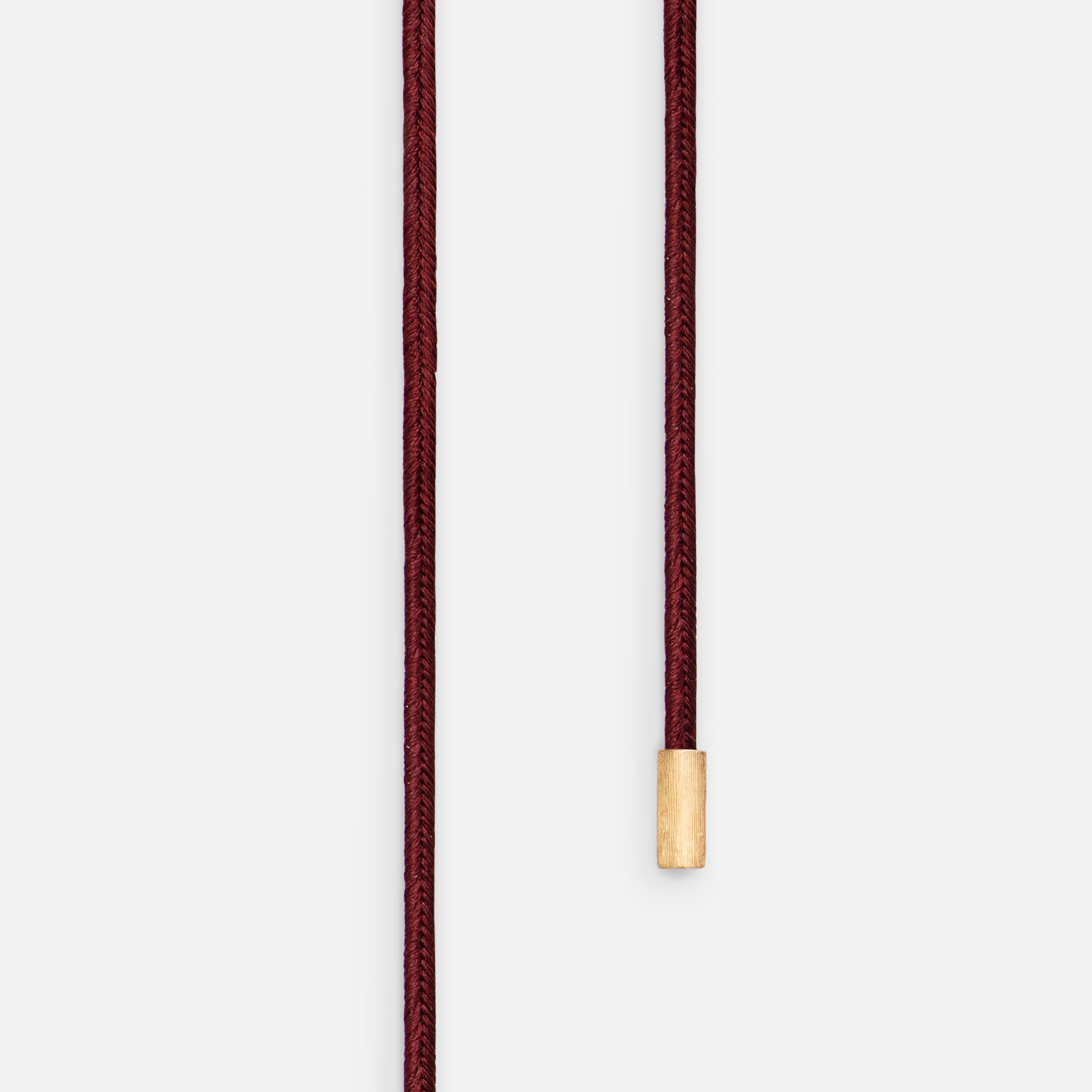 Designed by Charlotte Lynggaard, the silk String necklace in colourway Bordeaux is crafted from pure silk with 18 karat, textured, yellow gold end pieces. Total length is 130 cm. Part of the Ole Lynggaard Copenhagen Collection. Total length: 51.18 inches.