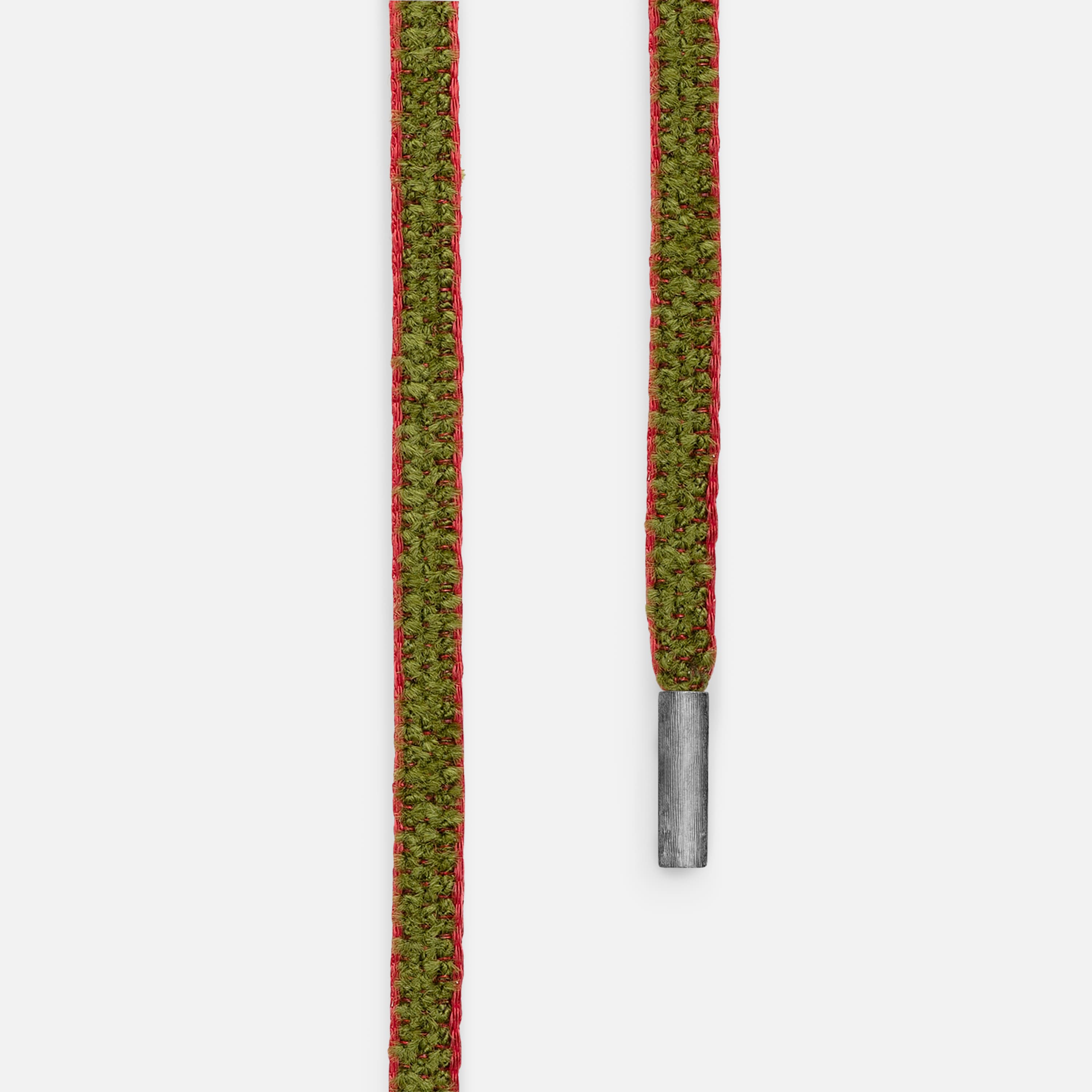 Designed by Charlotte Lynggaard, the Chenille Mokuba String necklace in colourway green & Bordeaux is crafted from pure silk with oxidized, textured, Sterling silver end pieces. Total length is 130 cm. Part of the Ole Lynggaard Copenhagen Collection.
