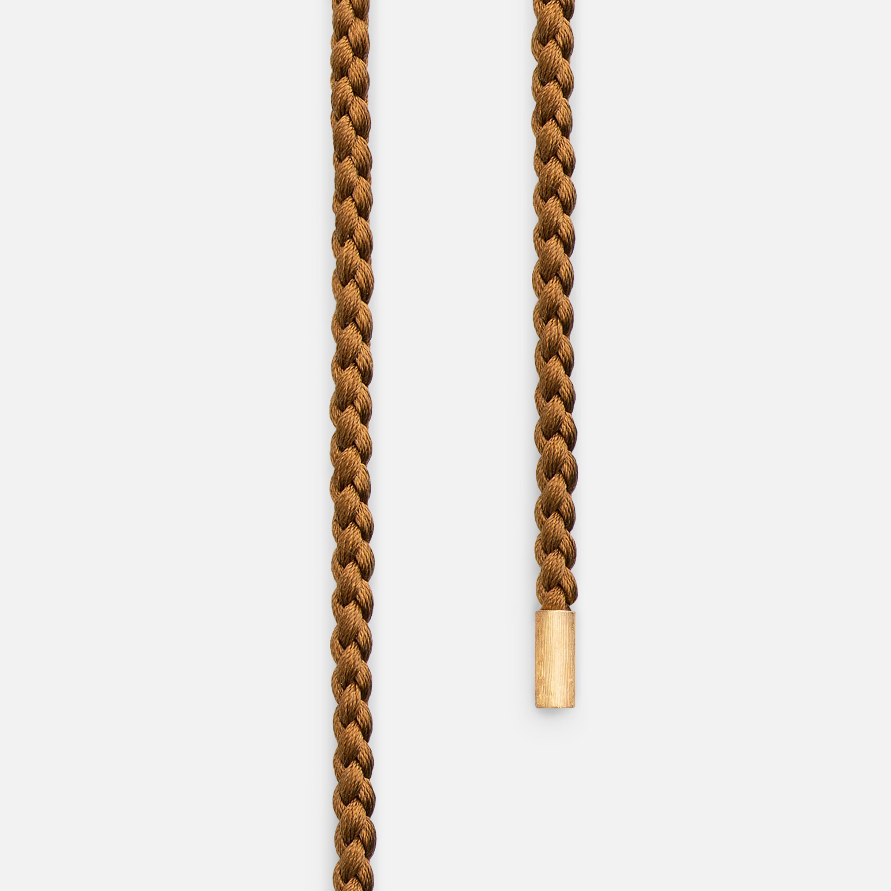 Designed by Charlotte Lynggaard, the Mokuba silk String necklace in colourway camel is crafted from pure silk with 18 karat, textured, yellow gold end pieces. Total length is 130 cm. Part of the Ole Lynggaard Copenhagen Collection.