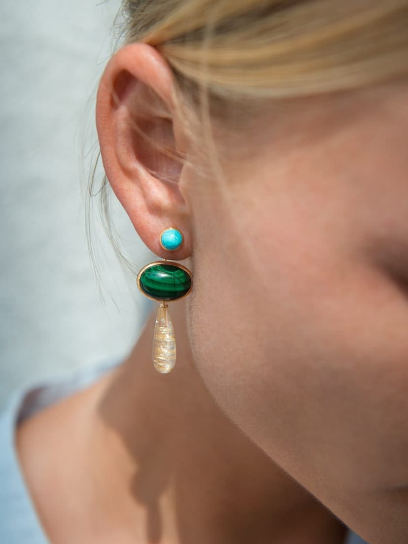 Designed by Charlotte Lynggaard, the earring drops are crafted from 18 karat yellow gold with rutile quartz cabochon drop 22x6mm with hook. Handcrafted by master goldsmiths. Sold as a pair.
