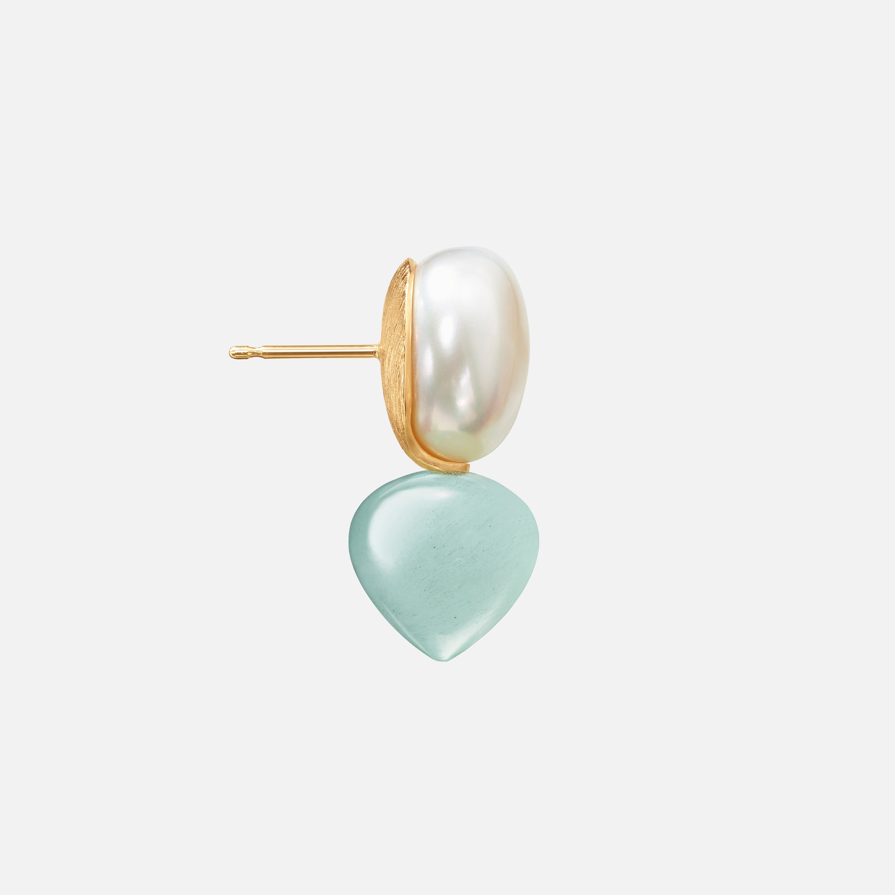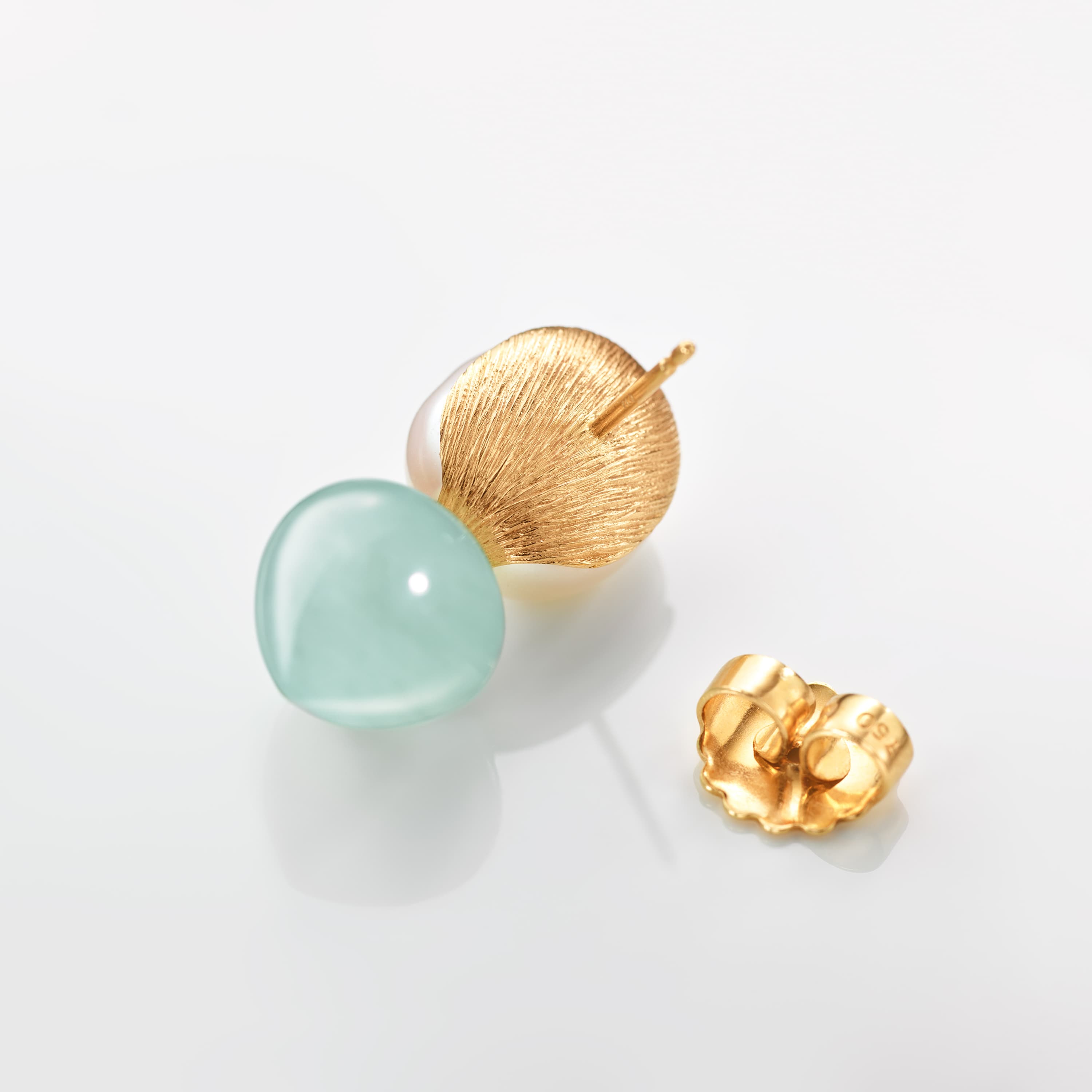These Shell stud earrings, designed by Sofia Lynggaard Normann, are crafted from 18 karat yellow gold, two baroque freshwater pearls, and two aquamarines. Each pearl is set in a small sea shell crafted from gold. Please note: As gemstones are natural materials, each stone is absolutely unique. They will vary in colour and have individual, unique inclusions and features. Web-images of stones are only representatives of the unique stone you will receive when ordering the product, not the exact stone. Sold as a pair. Part of The Young Fish Collection.