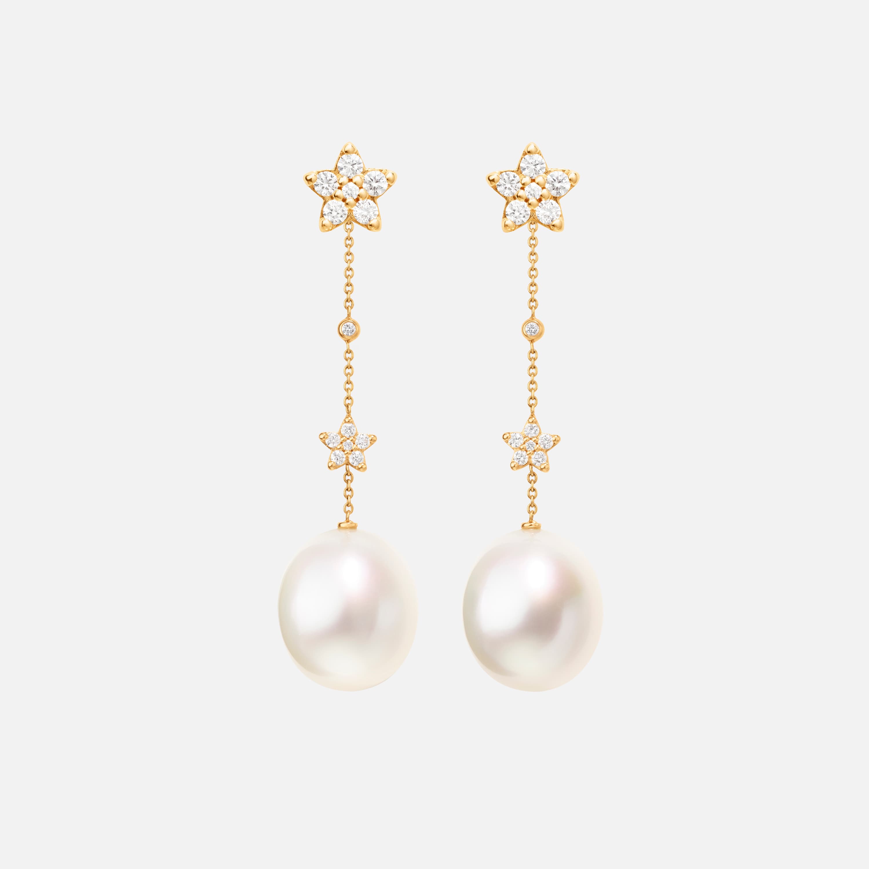 Designed by Charlotte Lynggaard, the Shooting Stars pearl earring pendants small are crafted from 18 karat yellow gold, 14 diamonds totalling 0.12 carat TW. VS., and two South Sea, 12-13 mm pearls that are personally approved by Charlotte Lynggaard. Each star comprises 6 brilliant cut diamonds, raised from the surface to allow light through the facets. Handcrafted by master goldsmiths. Sold as a pair.