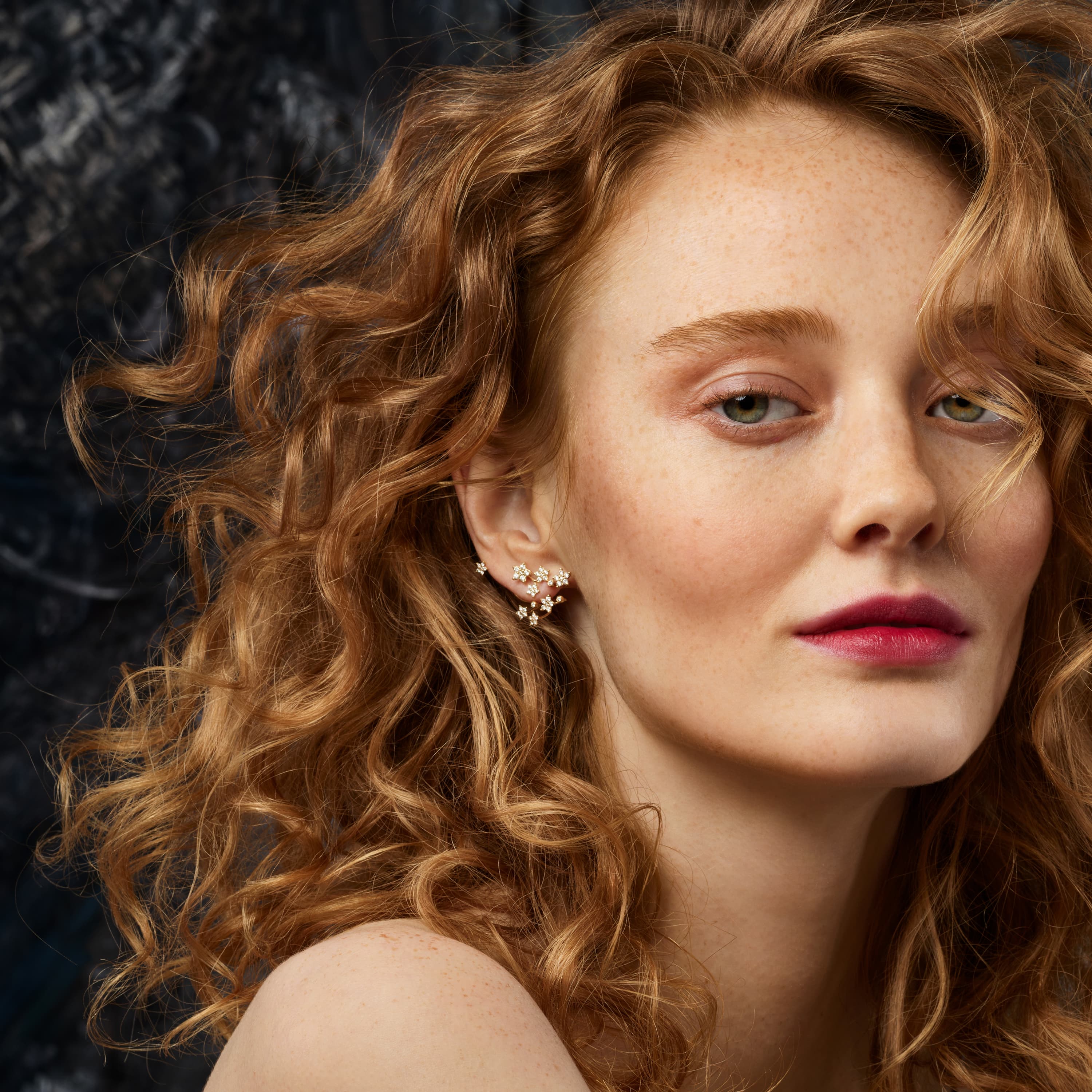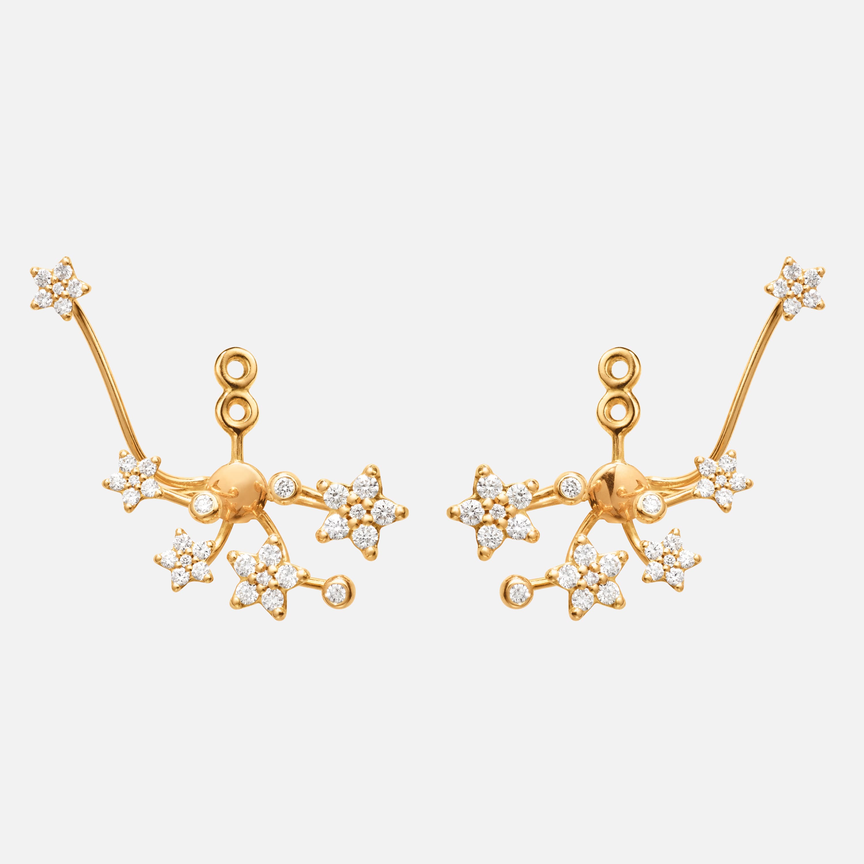 Designed by Charlotte Lynggaard, the Shooting Stars earring pendants are crafted from 18 karat yellow gold and 66 diamonds totalling 0,6 carat TW. VS. Each star comprises 6 brilliant cut diamonds, raised from the surface to allow light through the facets. Designed to be attached to stud earrings behind the earlobe. The gold surfaces are hand-polished by master goldsmiths. Sold as a pair.