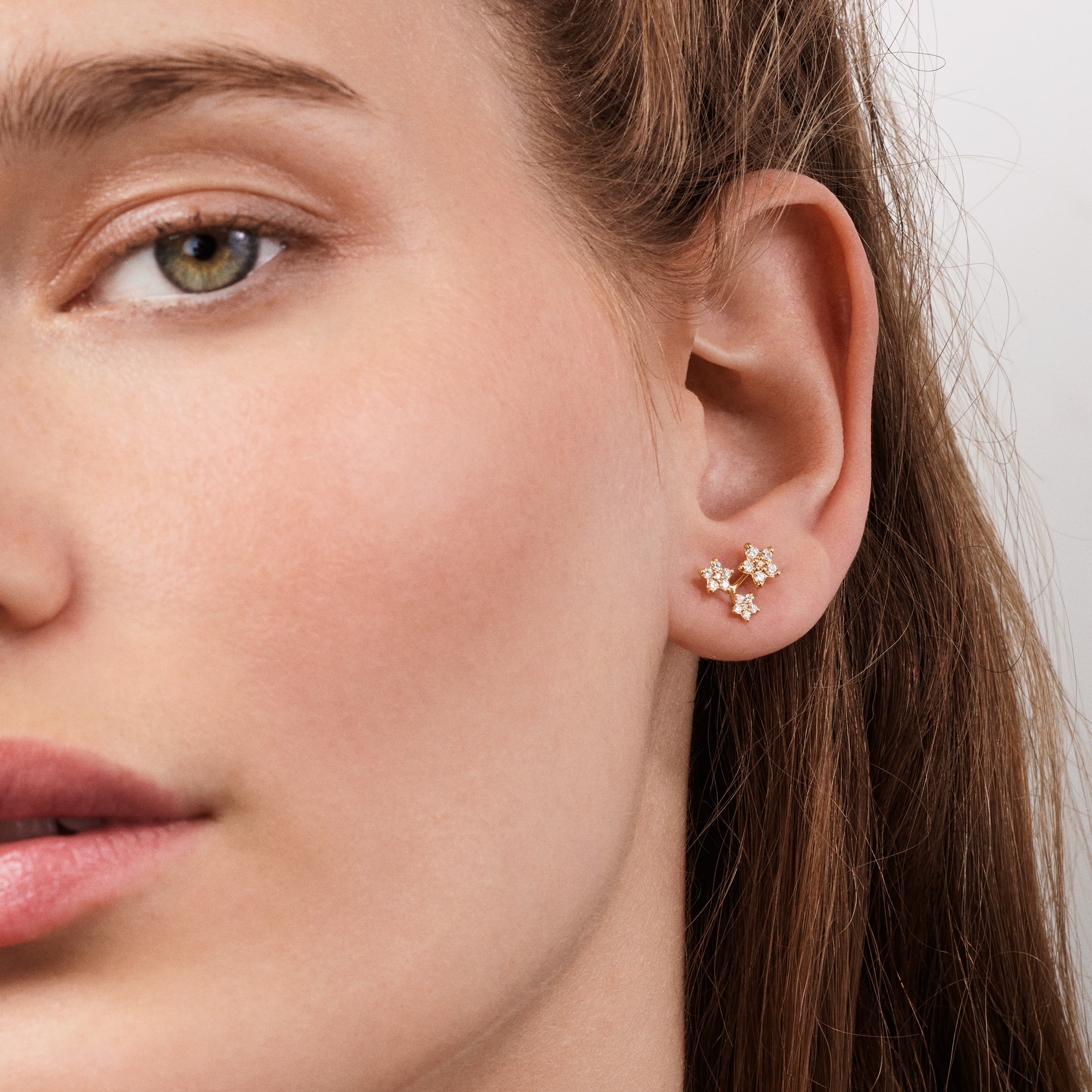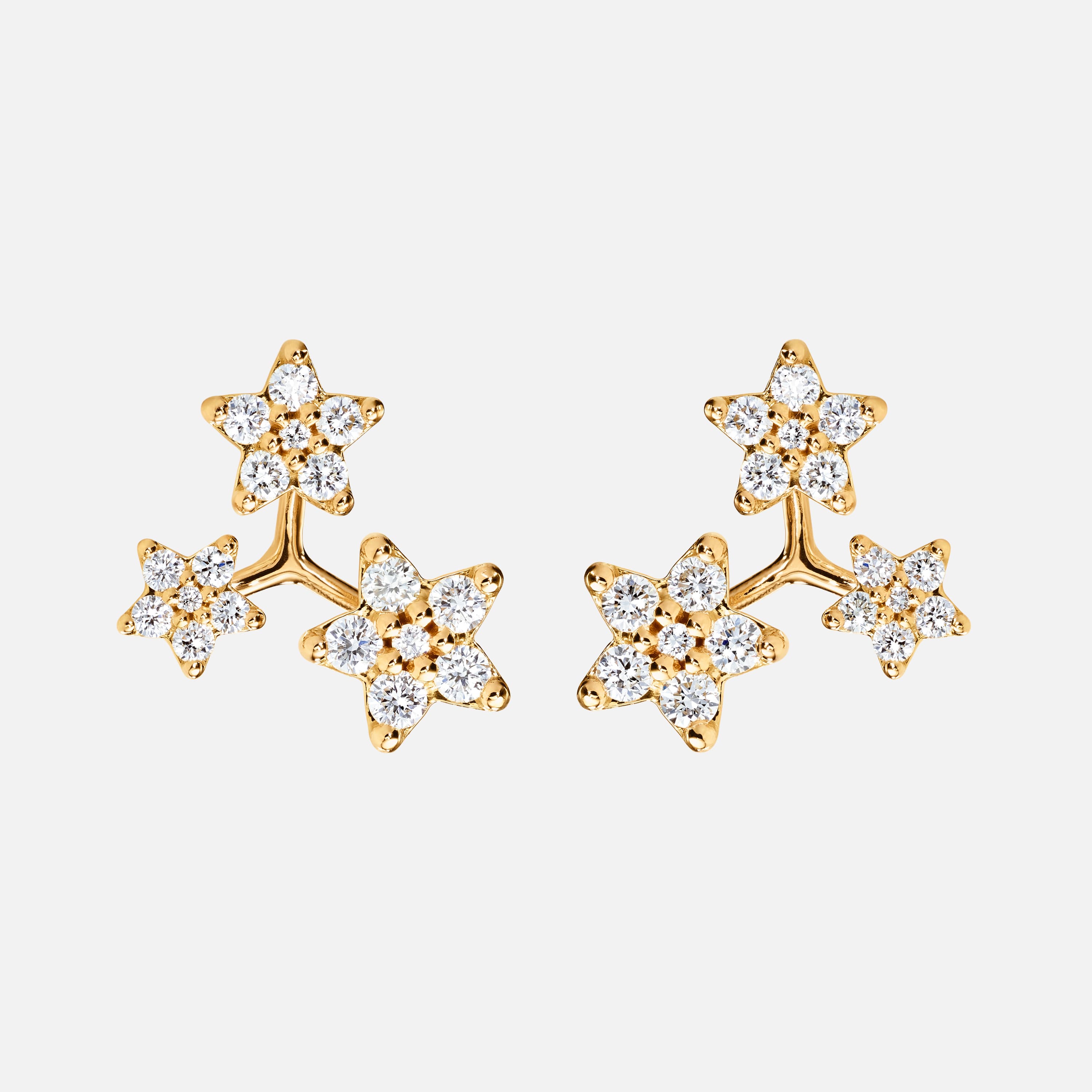 Designed by Charlotte Lynggaard, the Three Shooting Stars stud earrings are crafted from 18 karat yellow gold and 36 diamonds totalling 0.38 carat TW. VS. Each star has a slightly convex, hand-polished back and comprises 6 brilliant cut diamonds, raised from the surface to allow light through the facets. Master goldsmiths shape and polish the gold surfaces. Part of the Shooting Stars Collection. Sold as a pair.